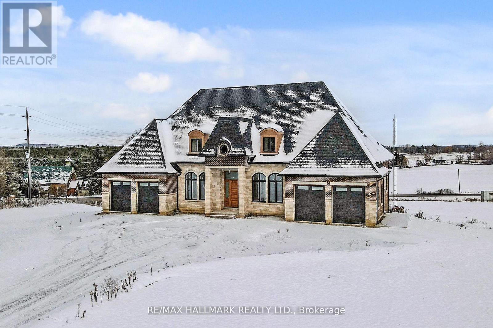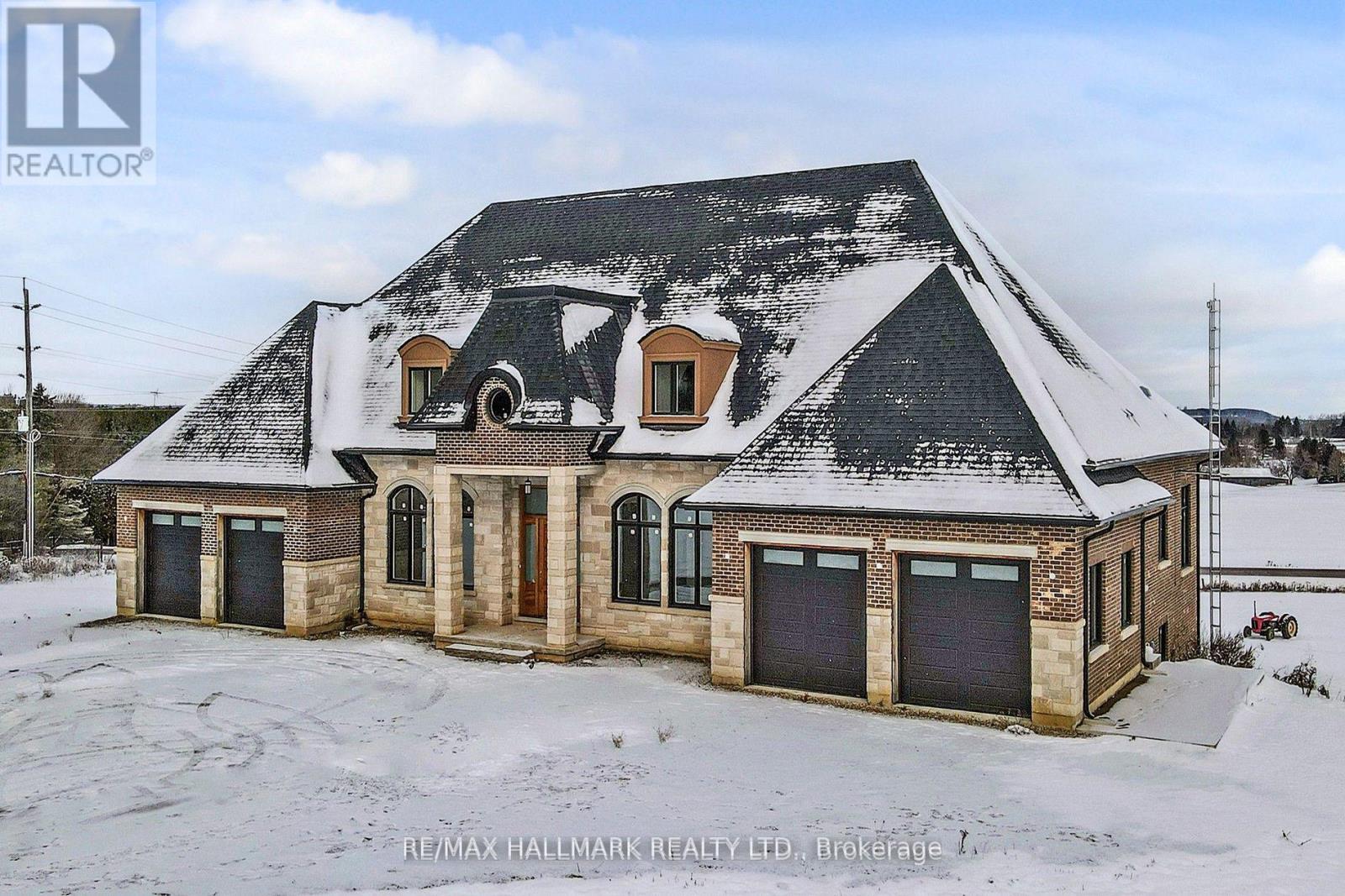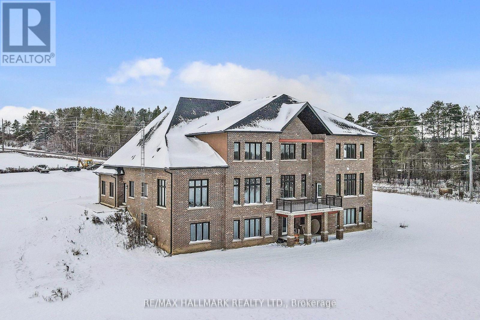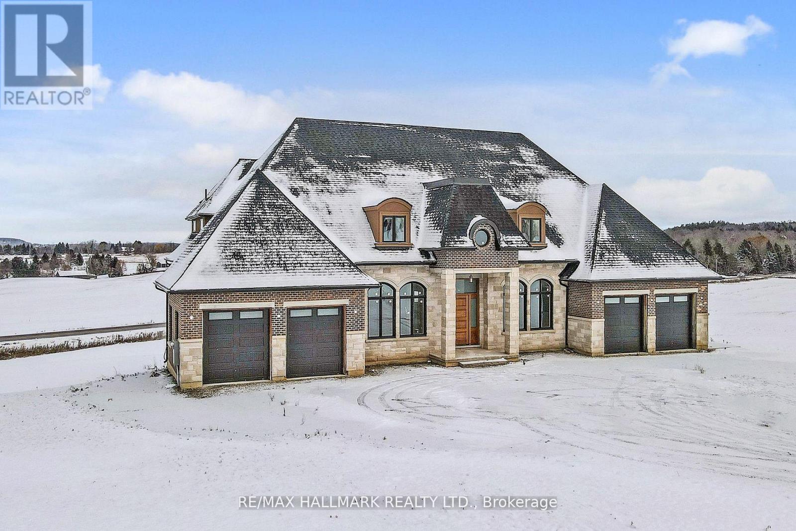 Opportunity knocks! Why not take advantage of this extraordinary, custom-built estate-like home offering over 7,000 sq ft of luxury craftsmanship, set gracefully upon 3 acres. The property boasts two road frontages and a private drive leading to dual double-car garages. Designed to capture stunning panoramic north views, the main floor features a spacious living room, elegant dining room with servery, and a gourmet chef's kitchen with premium finishes, a large eat-in area, and a walkout to a north-facing balcony. Off the kitchen, a beautiful northeast-facing sunroom provides the perfect spot to enjoy peaceful morning sunrises. Enhancing the home's functionality are a convenient secondary spice kitchen, two mudrooms, a full laundry room, and a lavish main-floor primary suite-complete with sitting area, walk-in closet, and luxurious 5-piece ensuite.The second level offers four generous bedrooms, each with its own private ensuite bath, including a secondary primary suite ideal for extended family or guests. A grand entertainment room with a vaulted ceiling anchors the upper level, creating an impressive gathering space. The home showcases flat ceilings, pot lights throughout, detailed mouldings, and a striking wrought-iron staircase that sets the tone for its refined elegance.The walkout basement, left unfinished, awaits your personal vision and offers tremendous future potential with direct access to the backyard. This exceptional residence blends thoughtful design, luxury finishes, and breathtaking views. A rare opportunity to own a truly remarkable custom home unlike any other. (id:4555)