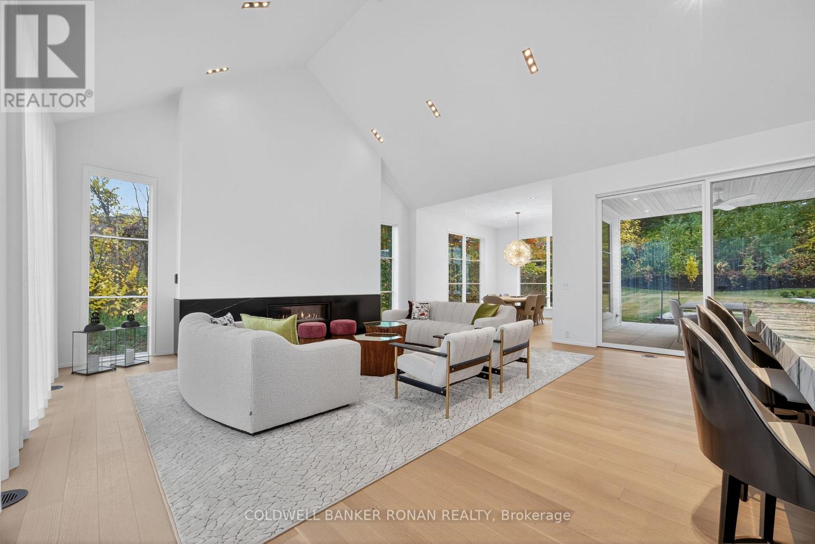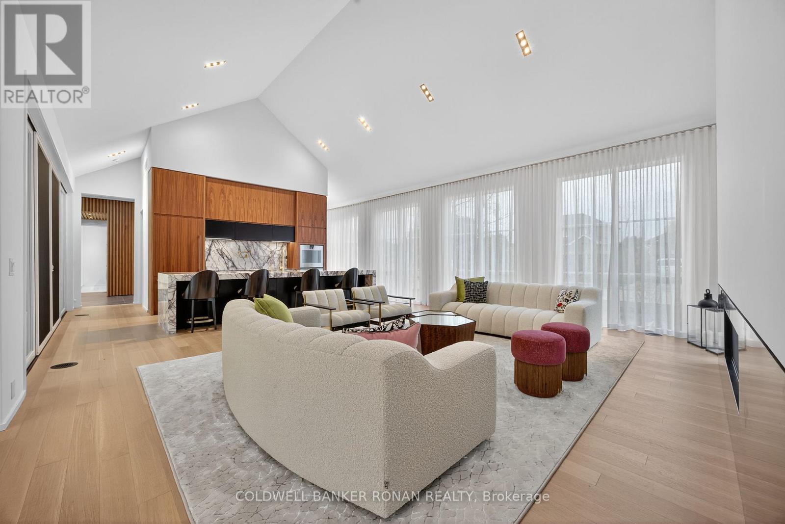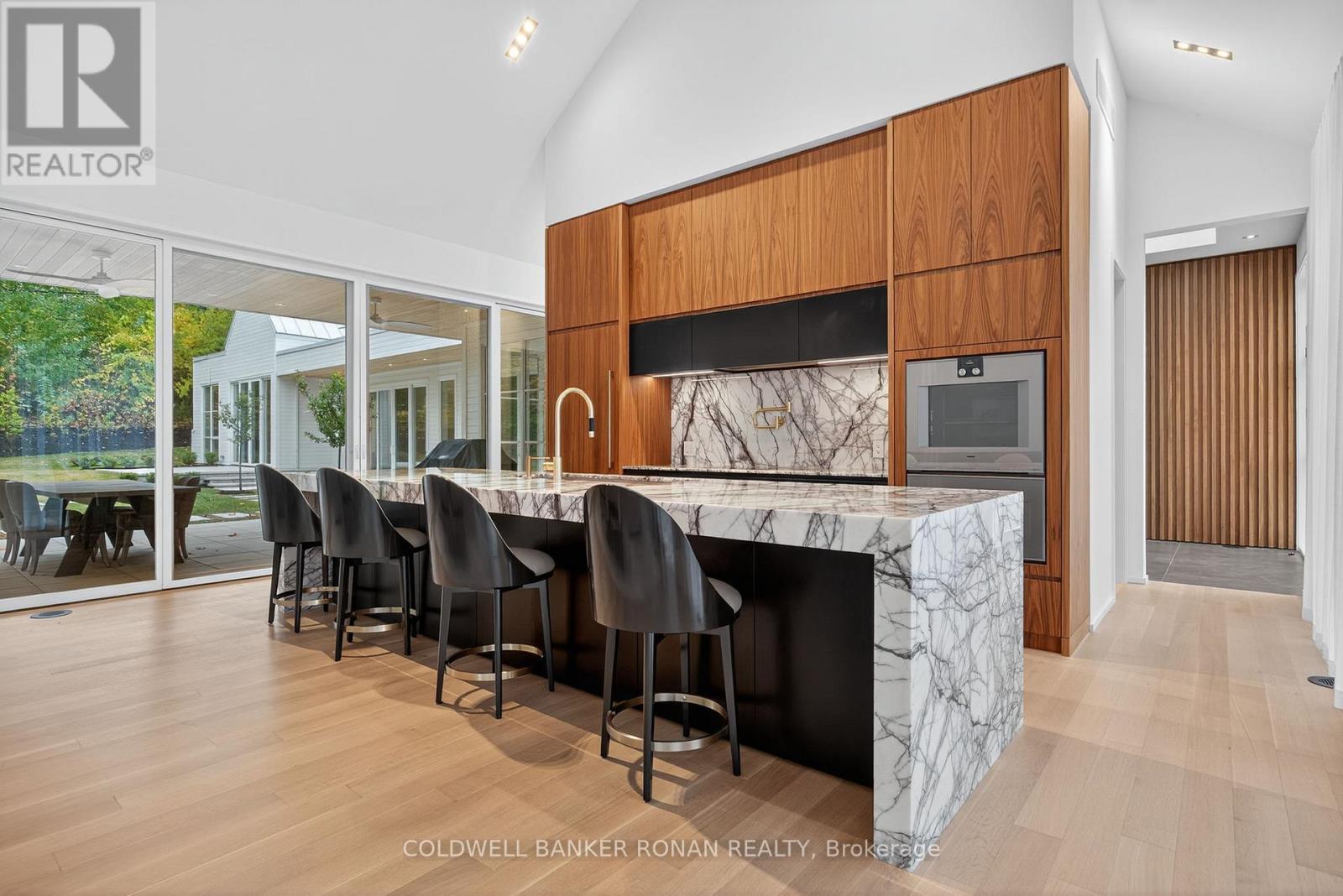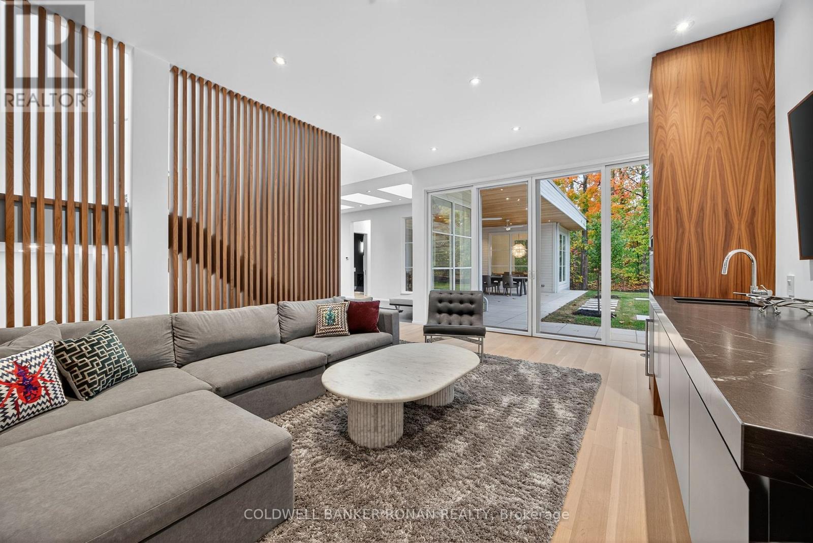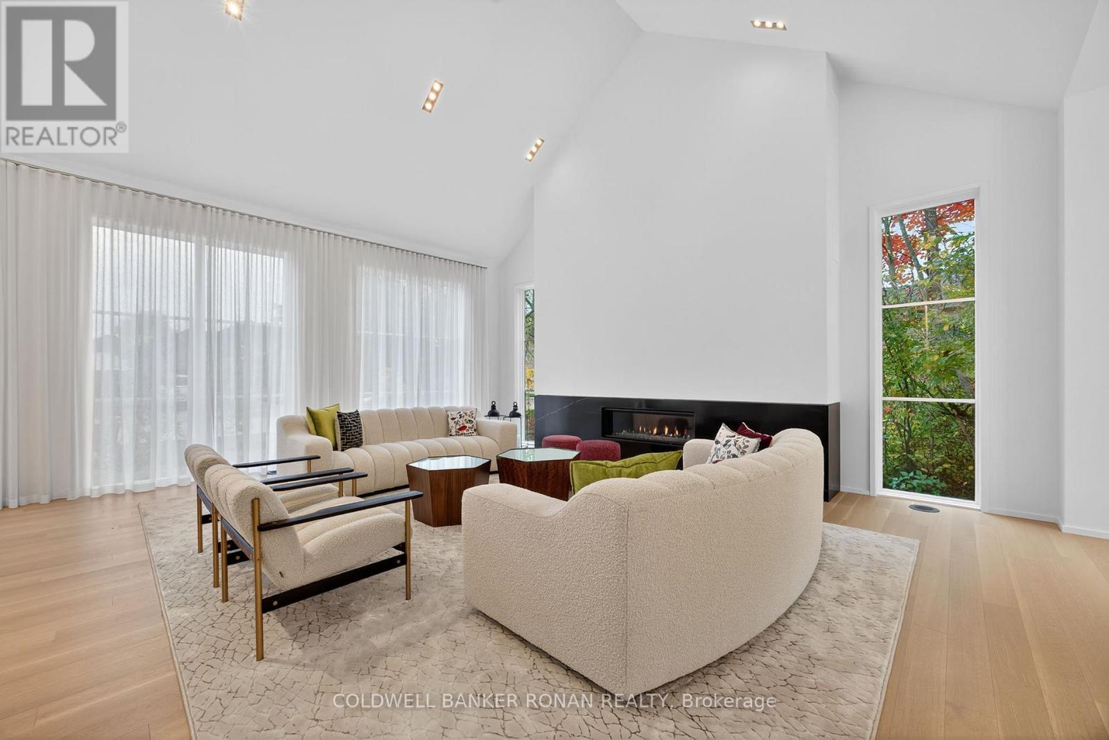 Luxury living in this breathtaking Forest View Home, crafted by Georgio Lolos Designs w/ interiors curated by ABella Design Inc. This stunning property is built with an eye for elegance & functionality. Step into the home through a custom wood slatted wall foyer. Six skylights flood the space with natural light. Open riser, Hollywood stairs w/ sleek glass railings lead to a private bedroom retreat over the garage. Specialty lighting highlights the grandeur of the 18-foot A-frame vaulted ceiling in the main living area, creating an inviting ambiance around the 50" gas fireplace clad in black soapstone. The home showcases 6' White Oak flooring throughout for a seamless & warm finish. The powder room impresses w/ a Starck wall-hung toilet, integrated marble sink & an exquisite book-matched Bianco Lasa marble wall. The heart of the home features a dream kitchen, equipped w/ walnut cabinetry, an impressive 14-foot waterfall island & a handcrafted 50' Julien sink. Grey Lilac marble adorns the kitchen & pantry, complemented by full-slab backsplashes. Cooking is elevated w/ a 36' Gaggenau induction cooktop, 30' Gaggenau wall oven, fully integrated 36' Thermidor fridge & Bosch dishwasher. The custom range hood & gold fixtures adds an elegant touch while a wine fridge in the pantry & a wall mounted pot filler over the stove round out the space's luxury. The TV lounge features a built-in Gaggenau coffee maker & beverage fridge, elegantly integrated into custom cabinetry & a sophisticated walnut accent wall. Each bedroom offers an ensuite bathroom & custom closets. Primary ensuite is a private oasis w/ custom wall hung vanity, a luxurious Knief, K-Stone tub, a wall-mounted AeT DOT 20 Italia toilet, an oversized shower towel warmer. Laundry room is carefully designed, with beautiful cabinetry, clothes drying area & a custom dog wash station. A must see property for those seeking a refined yet comfortable living experience. (id:4555)