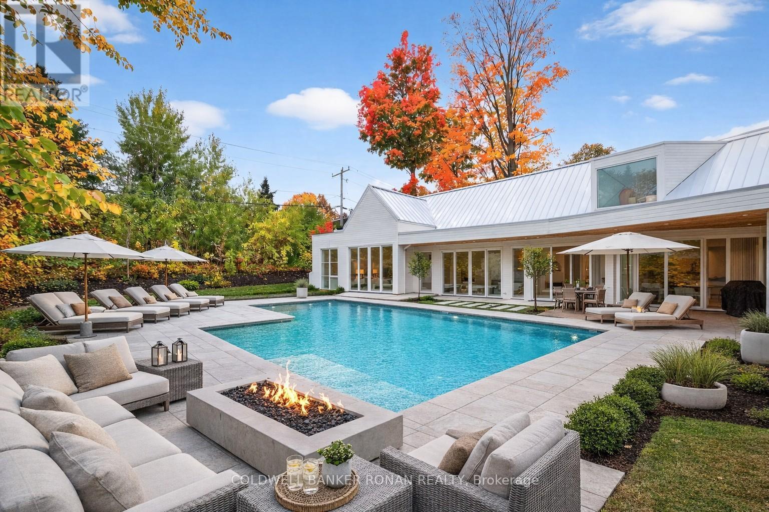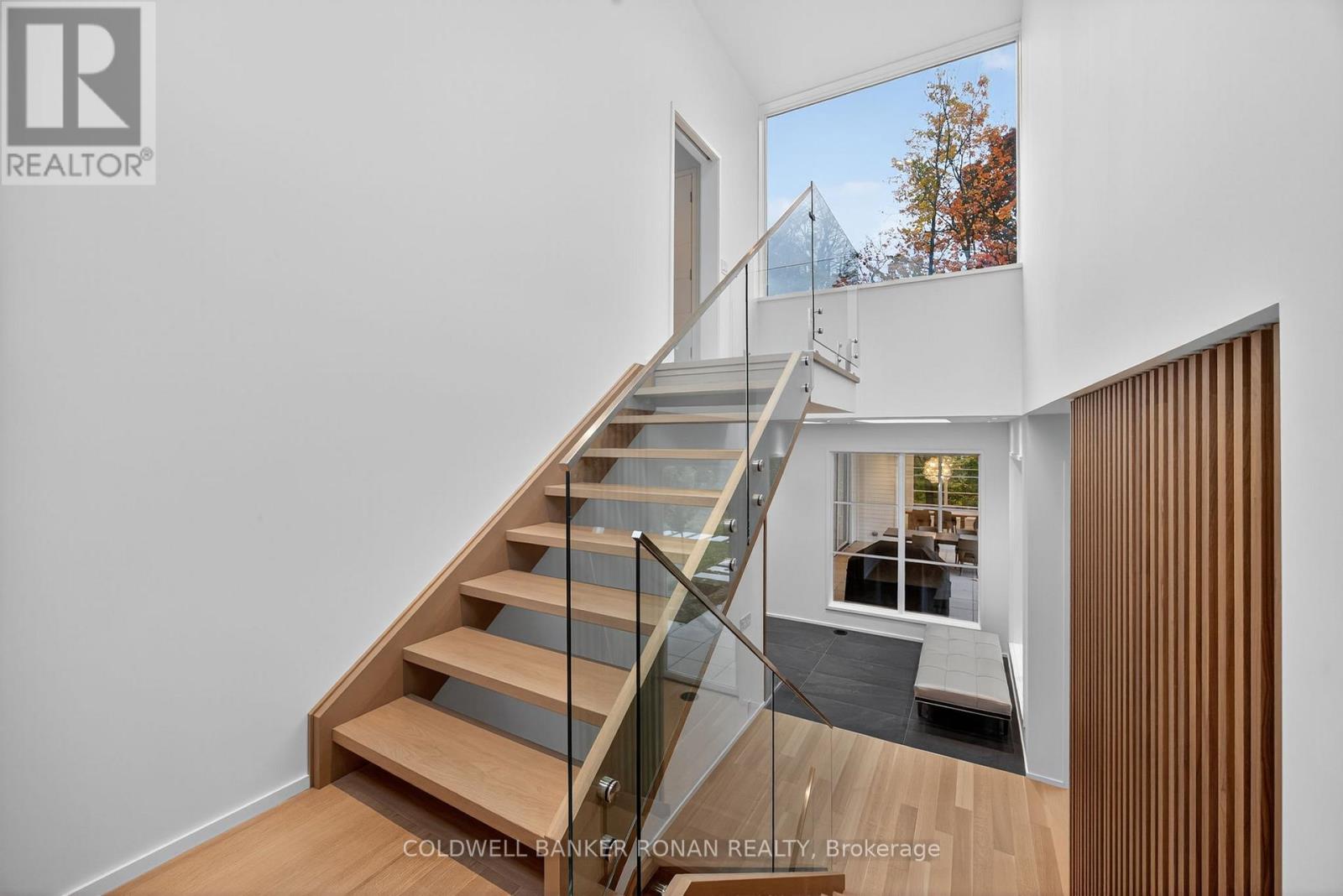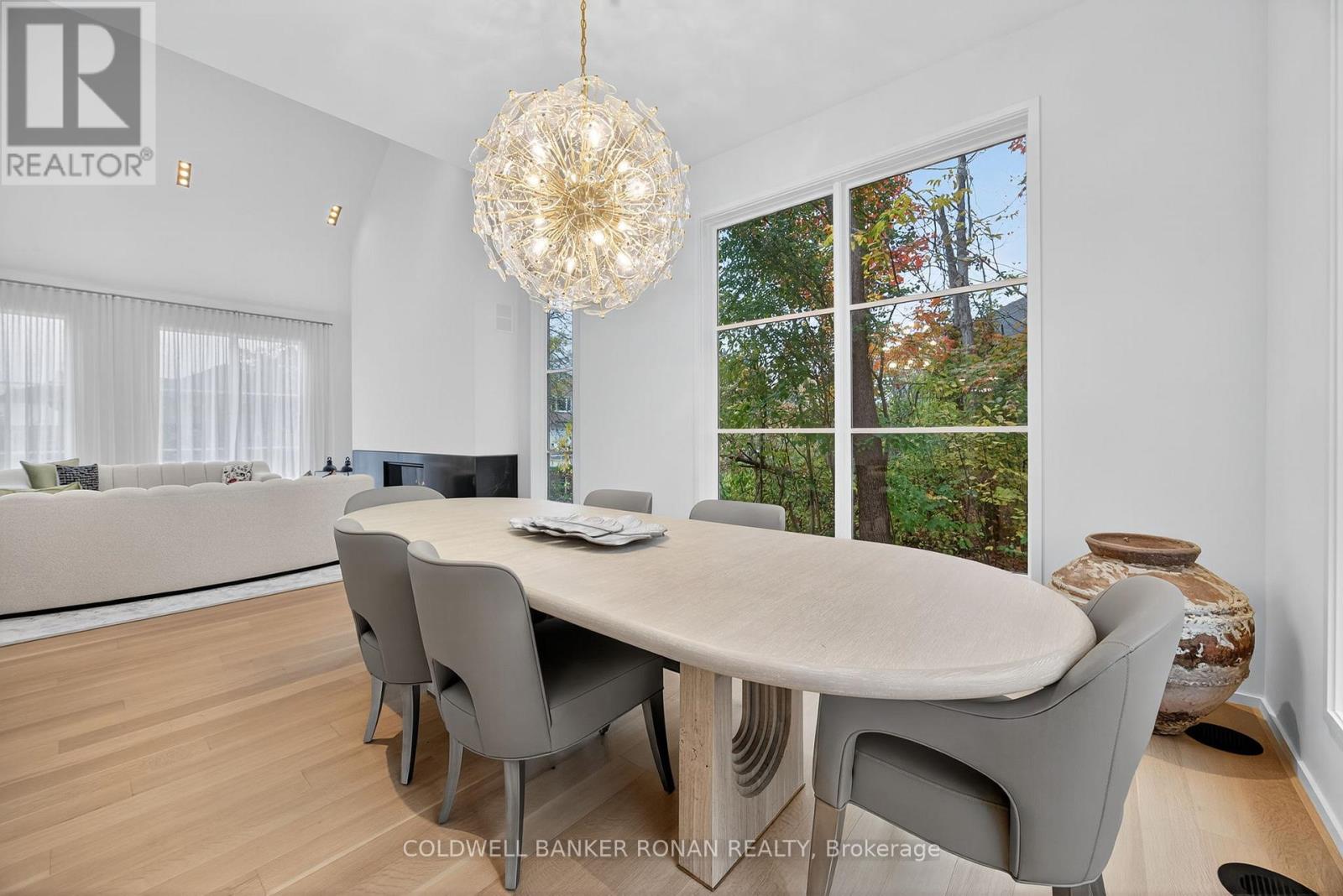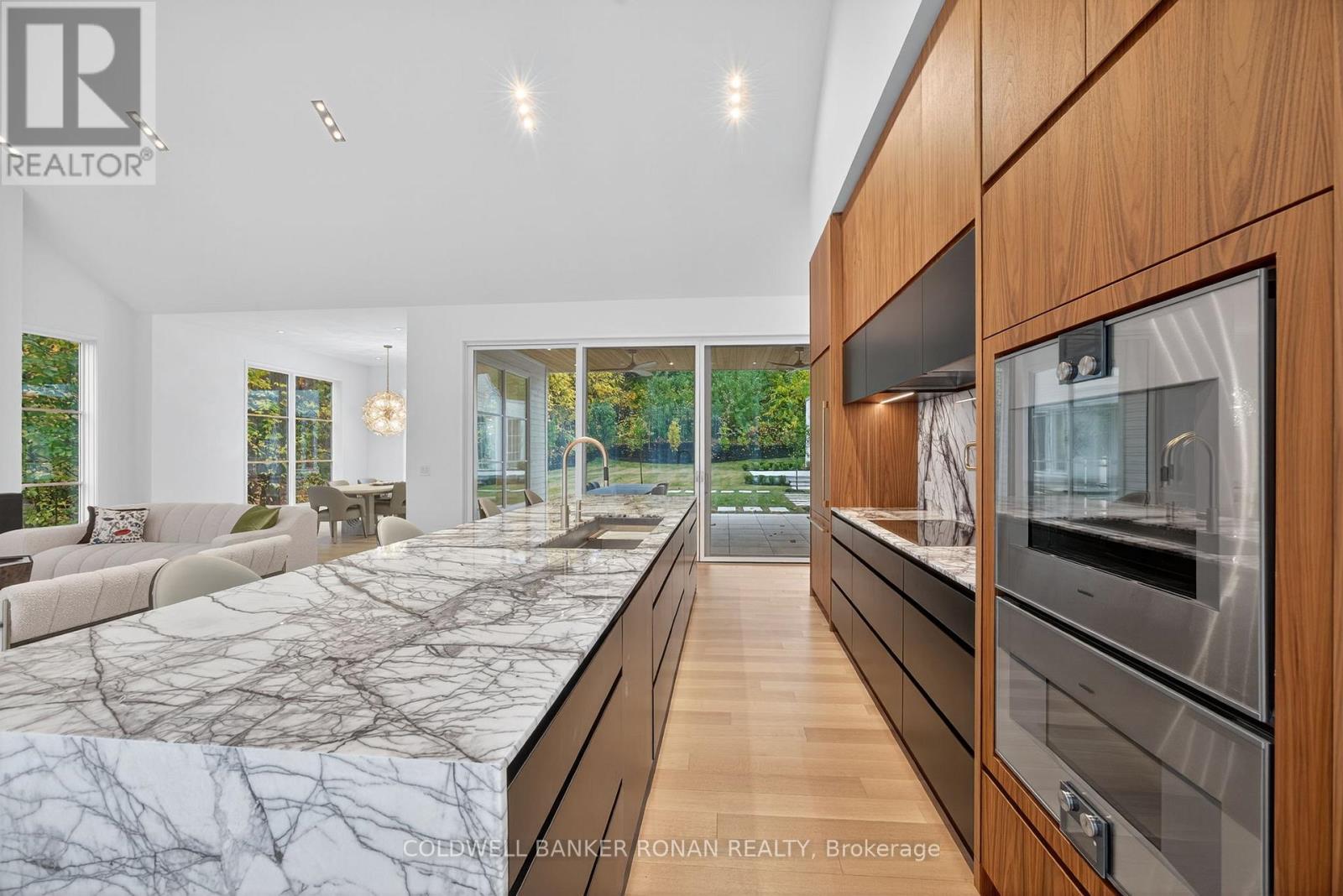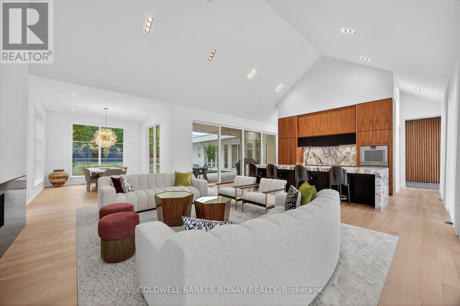 Luxury living in this breathtaking Forest View Home, crafted by Georgio Lolos Designs w/ interiors curated by ABella Design Inc. This stunning property is built with an eye for elegance & functionality. Step into the home through a custom wood slatted wall foyer. Six skylights flood the space with natural light. Open riser, Hollywood stairs w/ sleek glass railings lead to a private bedroom retreat over the garage. Specialty lighting highlights the grandeur of the 18-foot A-frame vaulted ceiling in the main living area, creating an inviting ambiance around the 50" gas fireplace clad in black soapstone. The home showcases 6' White Oak flooring throughout for a seamless & warm finish. The powder room impresses w/ a Starck wall-hung toilet, integrated marble sink & an exquisite book-matched Bianco Lasa marble wall. The heart of the home features a dream kitchen, equipped w/ walnut cabinetry, an impressive 14-foot waterfall island & a handcrafted 50' Julien sink. Grey Lilac marble adorns the kitchen & pantry, complemented by full-slab backsplashes. Cooking is elevated w/ a 36' Gaggenau induction cooktop, 30' Gaggenau wall oven, fully integrated 36' Thermidor fridge & Bosch dishwasher. The custom range hood & gold fixtures adds an elegant touch while a wine fridge in the pantry & a wall mounted pot filler over the stove round out the space's luxury. The TV lounge features a built-in Gaggenau coffee maker & beverage fridge, elegantly integrated into custom cabinetry & a sophisticated walnut accent wall. Each bedroom offers an ensuite bathroom & custom closets. Primary ensuite is a private oasis w/ custom wall hung vanity, a luxurious Knief, K-Stone tub, a wall-mounted AeT DOT 20 Italia toilet, an oversized shower towel warmer. Laundry room is carefully designed, with beautiful cabinetry, clothes drying area & a custom dog wash station. A must see property for those seeking a refined yet comfortable living experience. (id:4555)