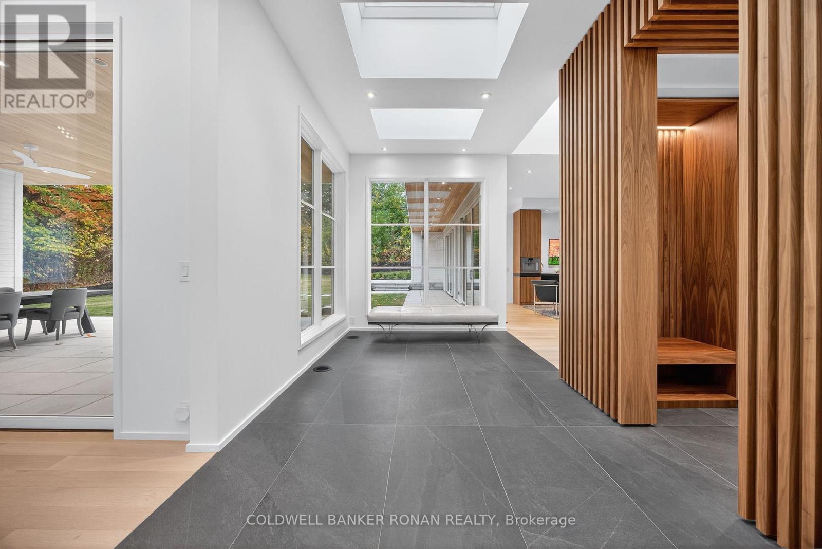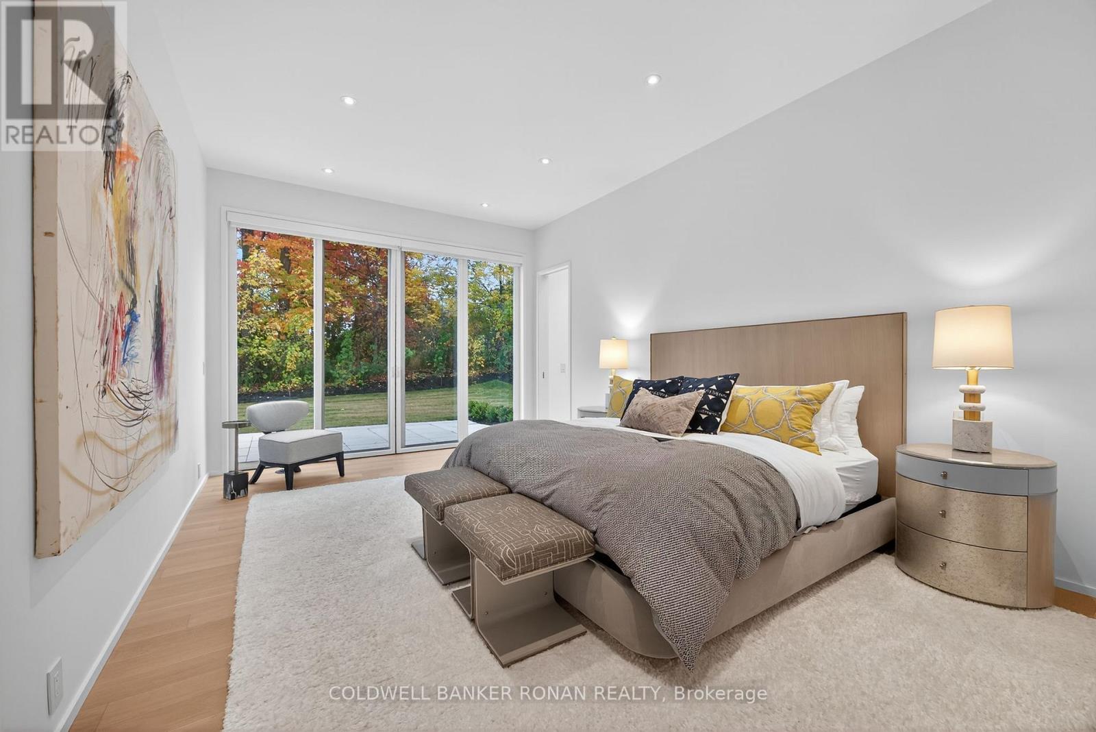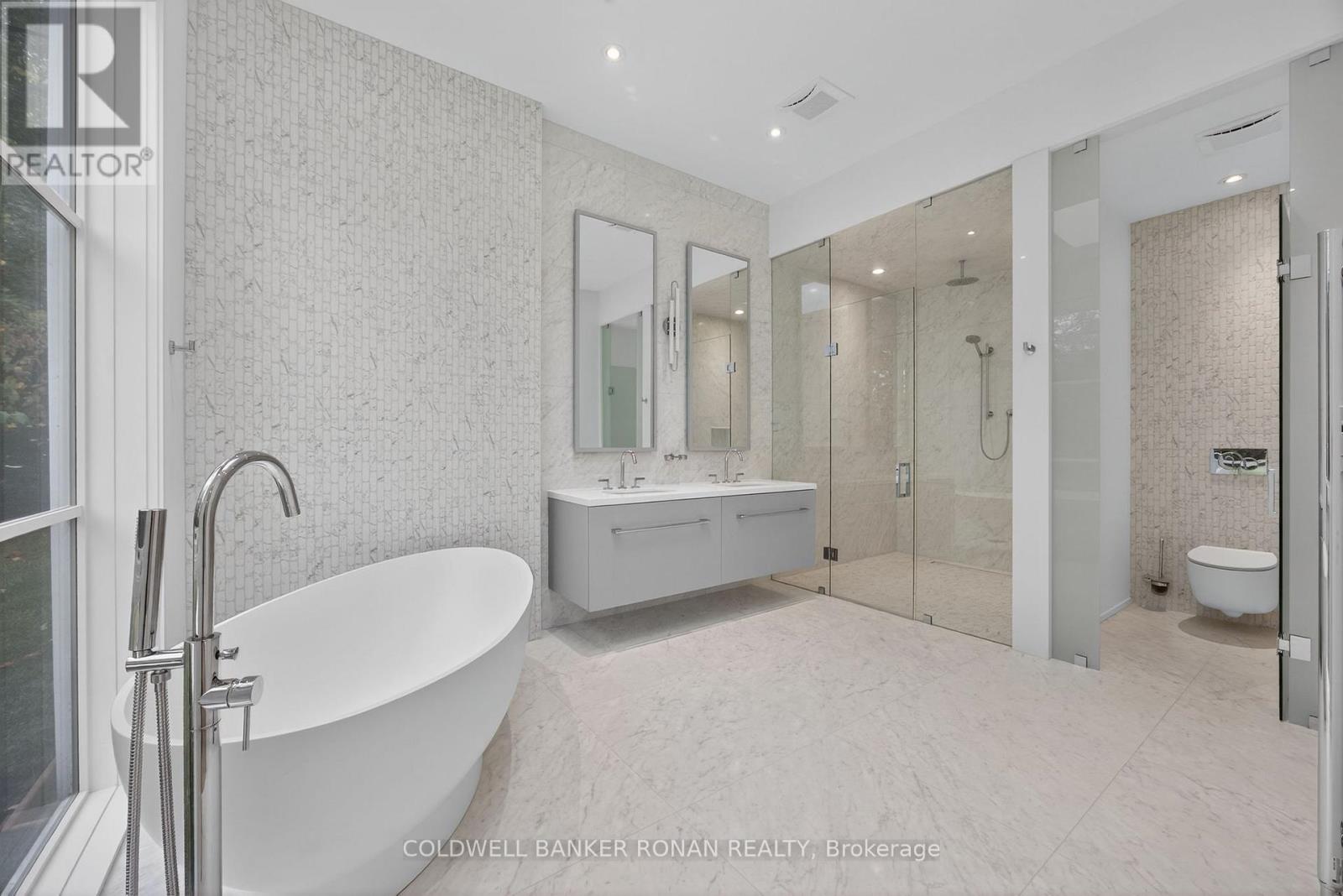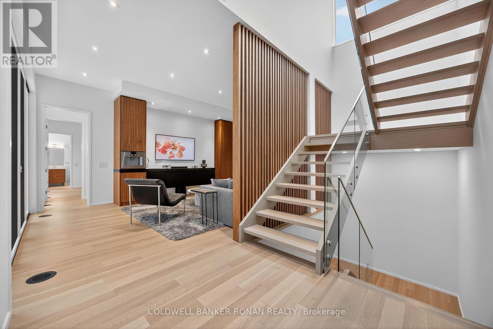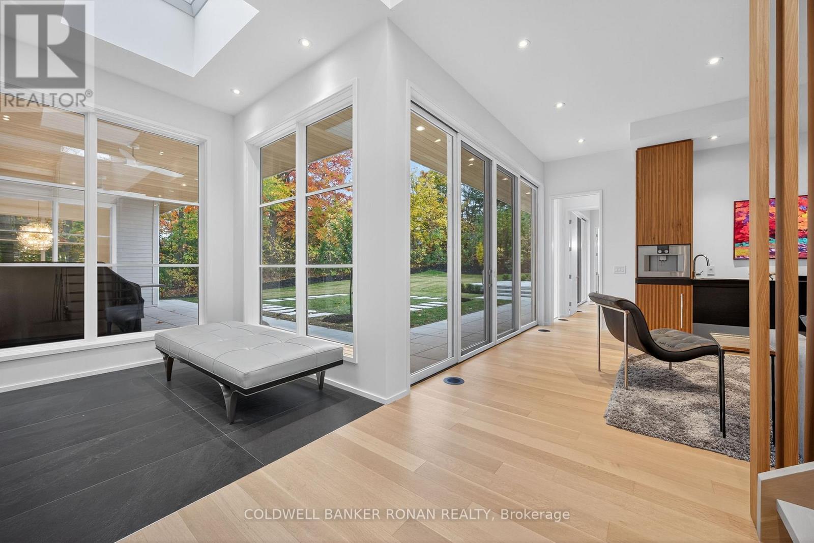 Luxury living in this breathtaking Forest View Home, crafted by Georgio Lolos Designs w/ interiors curated by ABella Design Inc. This stunning property is built with an eye for elegance & functionality. Step into the home through a custom wood slatted wall foyer. Six skylights flood the space with natural light. Open riser, Hollywood stairs w/ sleek glass railings lead to a private bedroom retreat over the garage. Specialty lighting highlights the grandeur of the 18-foot A-frame vaulted ceiling in the main living area, creating an inviting ambiance around the 50" gas fireplace clad in black soapstone. The home showcases 6' White Oak flooring throughout for a seamless & warm finish. The powder room impresses w/ a Starck wall-hung toilet, integrated marble sink & an exquisite book-matched Bianco Lasa marble wall. The heart of the home features a dream kitchen, equipped w/ walnut cabinetry, an impressive 14-foot waterfall island & a handcrafted 50' Julien sink. Grey Lilac marble adorns the kitchen & pantry, complemented by full-slab backsplashes. Cooking is elevated w/ a 36' Gaggenau induction cooktop, 30' Gaggenau wall oven, fully integrated 36' Thermidor fridge & Bosch dishwasher. The custom range hood & gold fixtures adds an elegant touch while a wine fridge in the pantry & a wall mounted pot filler over the stove round out the space's luxury. The TV lounge features a built-in Gaggenau coffee maker & beverage fridge, elegantly integrated into custom cabinetry & a sophisticated walnut accent wall. Each bedroom offers an ensuite bathroom & custom closets. Primary ensuite is a private oasis w/ custom wall hung vanity, a luxurious Knief, K-Stone tub, a wall-mounted AeT DOT 20 Italia toilet, an oversized shower towel warmer. Laundry room is carefully designed, with beautiful cabinetry, clothes drying area & a custom dog wash station. A must see property for those seeking a refined yet comfortable living experience. (id:4555)