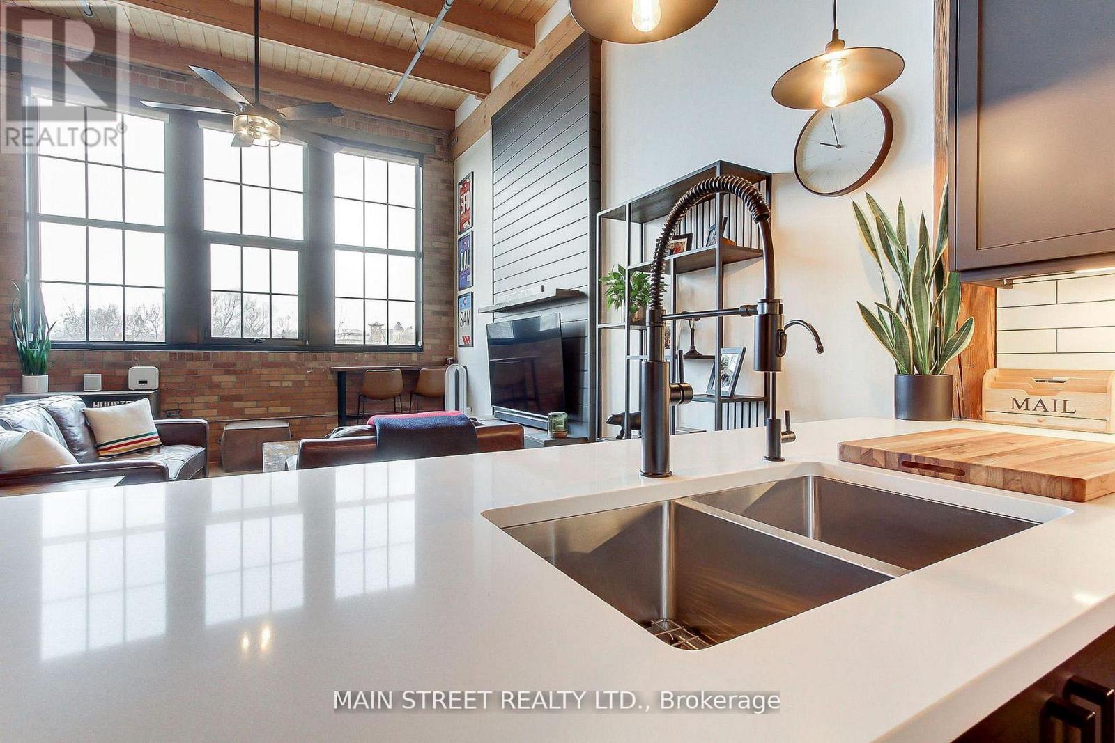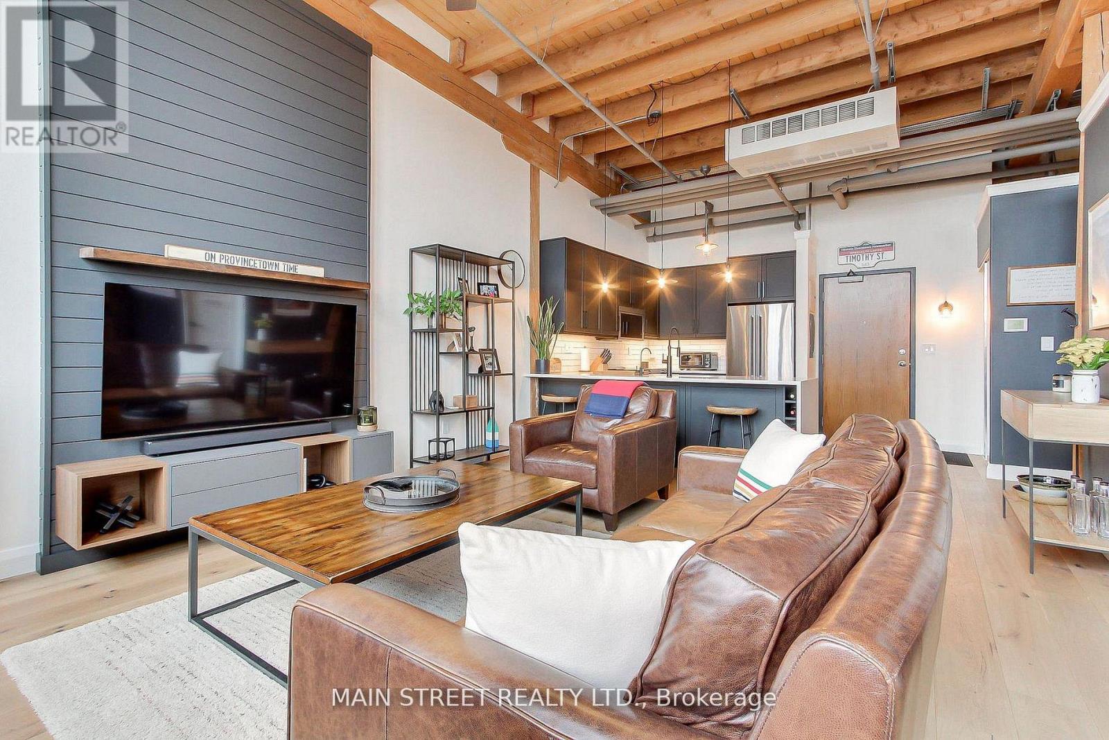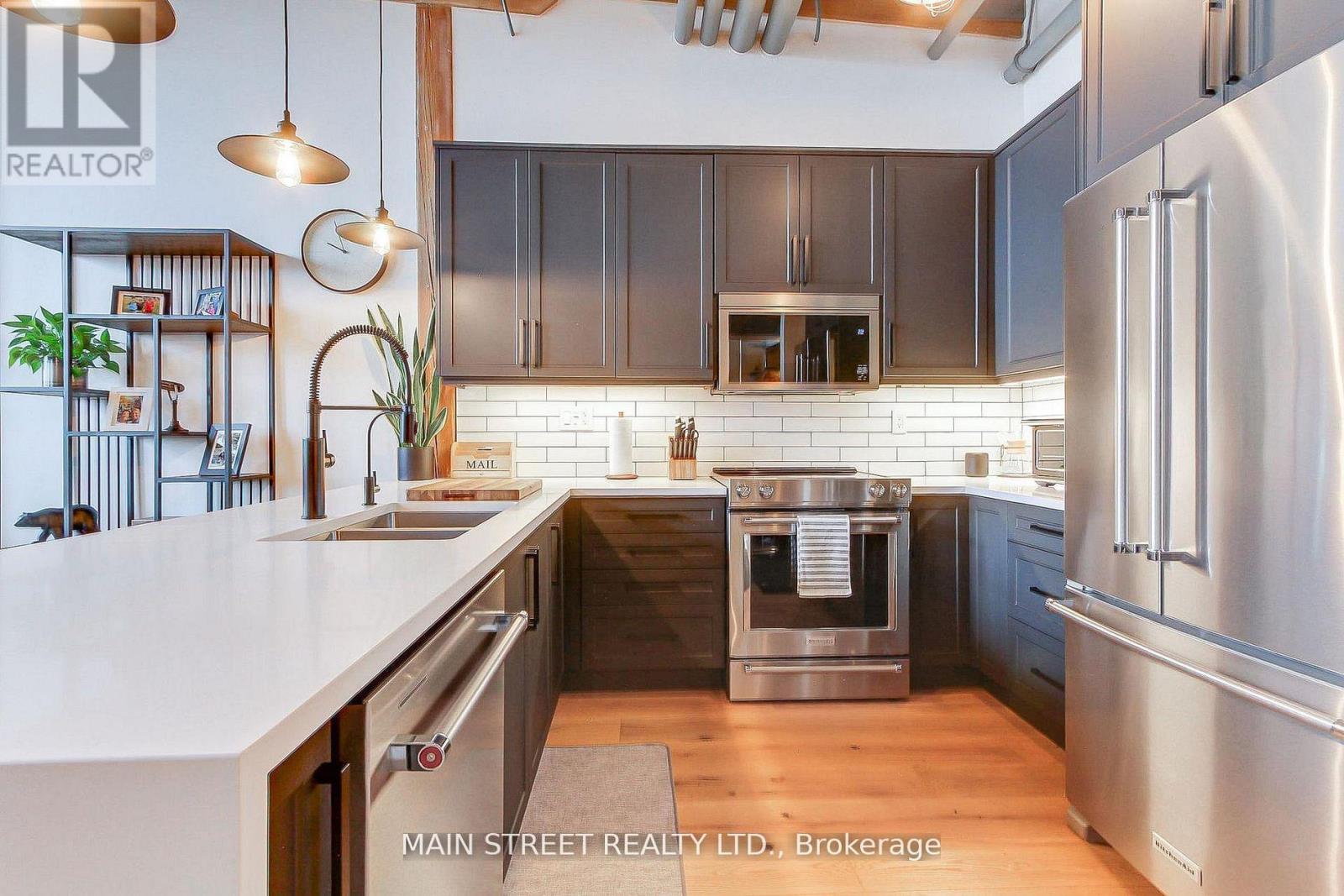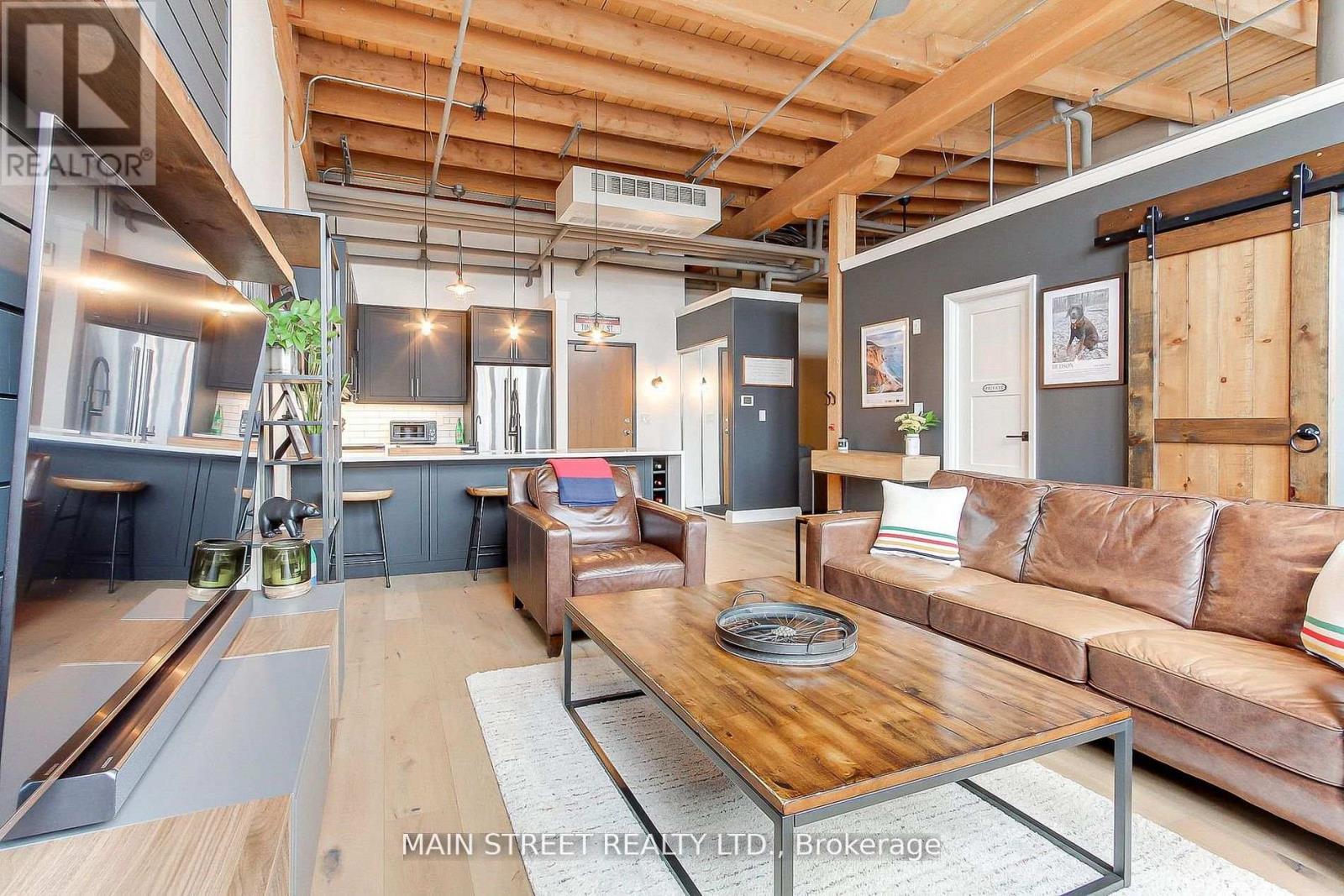 Welcome to Unit 310 at 543 Timothy Street - a stylish loft in the heart of Newmarket, offering modern living with urban flair. This bright and open-concept suite features soaring ceilings, large windows, and an efficient layout perfect for professionals, downsizers or first-time buyers. The newer kitchen is beautifully updated with contemporary finishes, ample cabinetry, and generous quartz waterfall counter, ideal for cooking and entertaining. The renovated bathroom adds a fresh, spa-like touch to everyday living. Enjoy the convenience of in-suite laundry, 2 dedicated parking spots one surface and the other underground, and a well-managed building just steps from Main Street shops, restaurants, trails, and transit. A fantastic opportunity to own a move-in-ready loft in one of Newmarket's most walkable locations. Recent renos are Kitchen, Faucets, Quartz Waterfall Counters, Ceramic Backsplash, Appliances, Light Fixtures, Bathroom, Engineered Hardwood Floors and top of the line Custom Barn Doors. An exceptional west exposure delivers panoramic sunset views of Historical Downtown Newmarket and radiant natural light throughout the day. Black Upgraded Interior Windows. New windows were installed last year, and included in the maintenance fee is $240 to pay off remaining loan balance for approx 4 years. Amenities included are Gym, Top floor patio with 2 BBQ, Theatre room, Games Room, Board meeting room, Large party room with a professional kitchen. (id:4555)