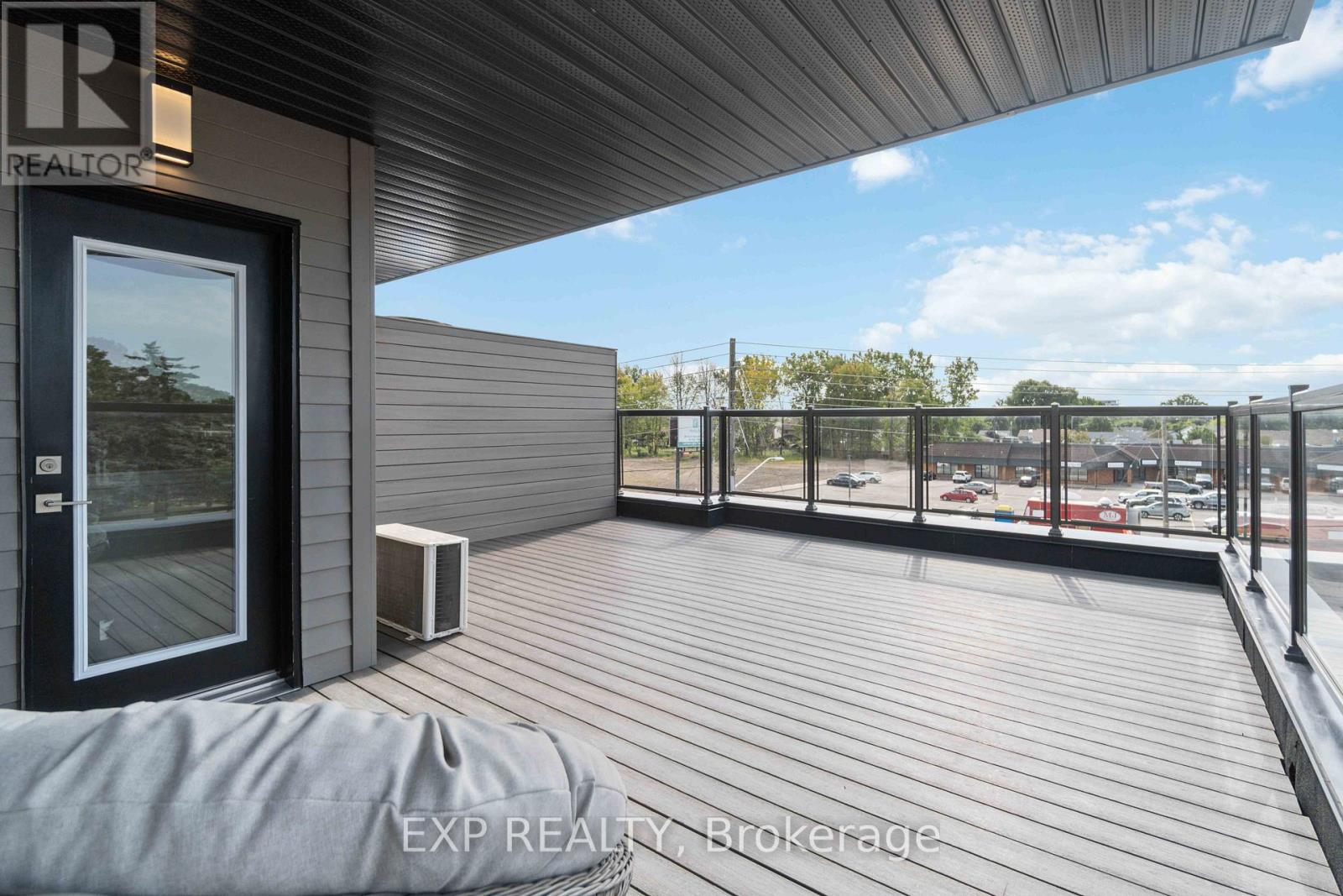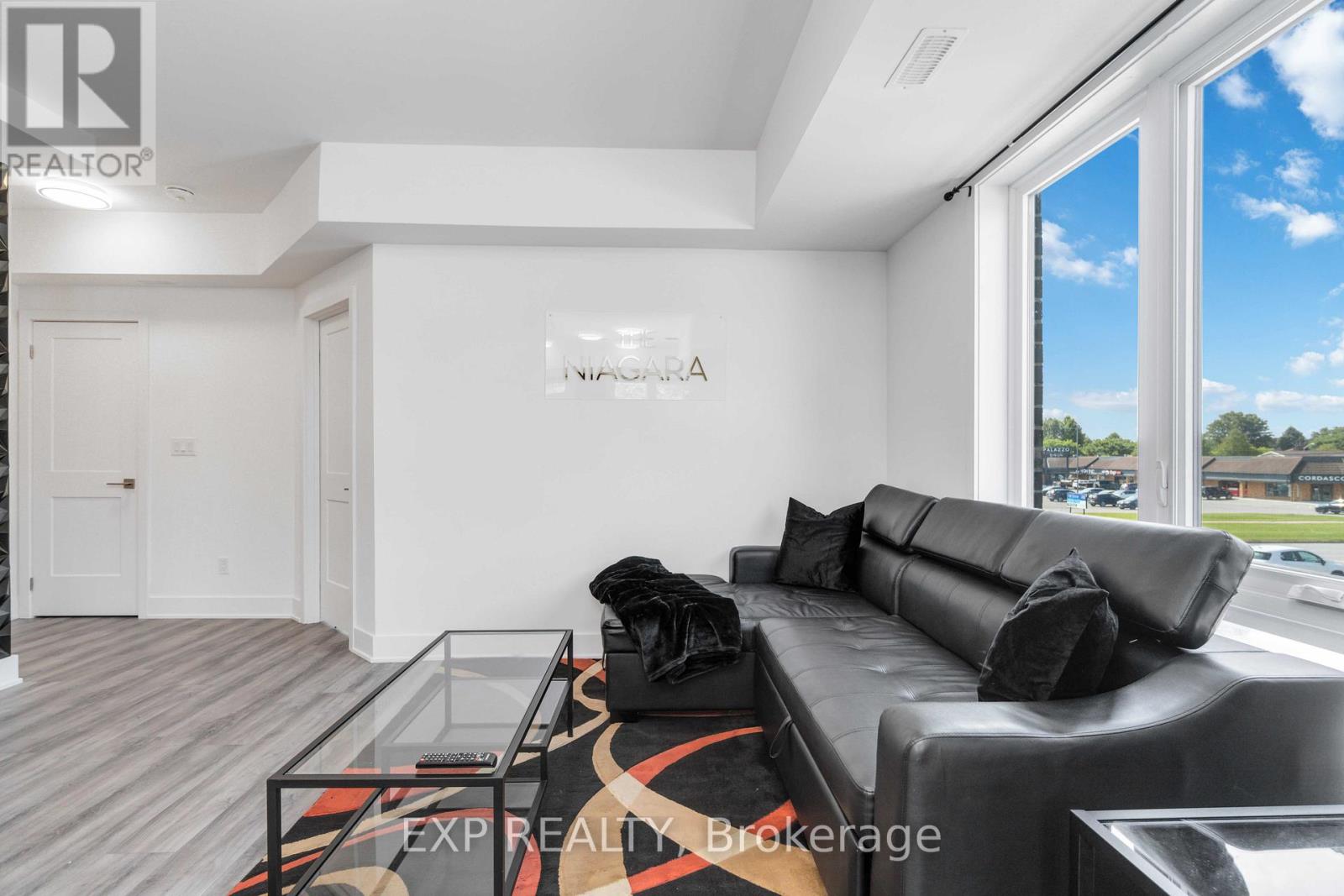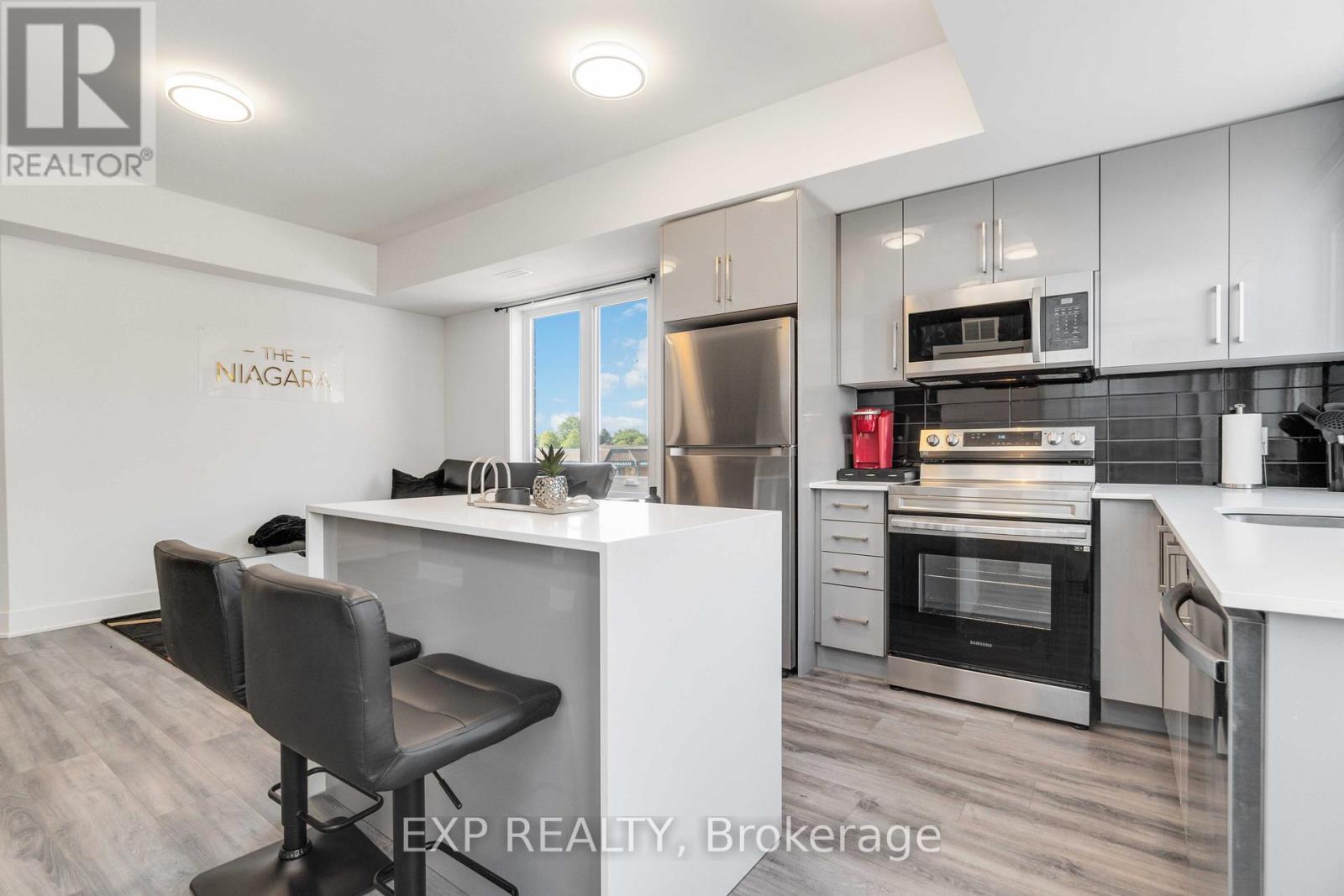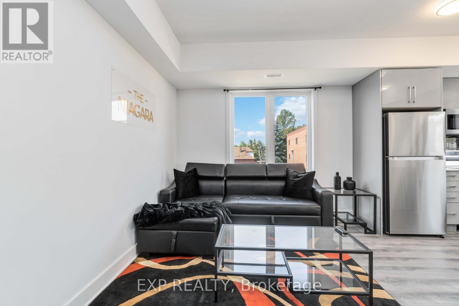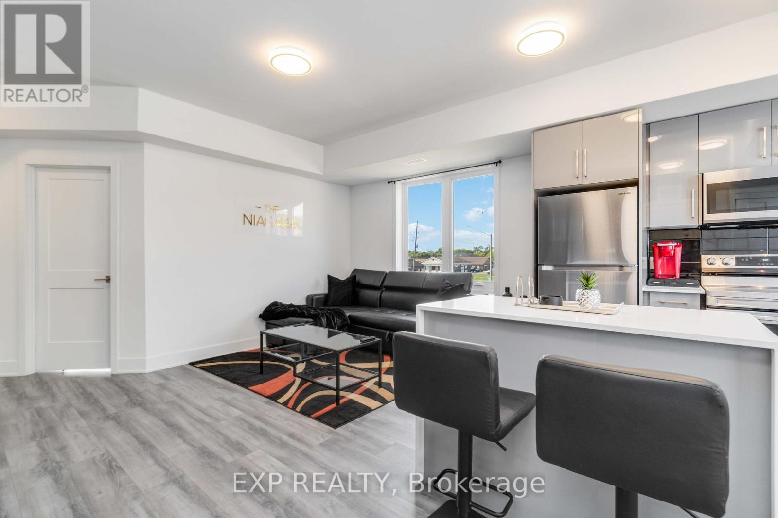 Turnkey Furnished Investment With Rare Rooftop Terrace!Welcome to this stunning modern corner two-storey condo offering over 1,000 sq ft of stylish living space and strong cash-flow potential. Fully furnished and move-in or rental ready, this rare unit is ideal for investors, short-term rental operators, or end users seeking low-maintenance luxury living.The upgraded chef's kitchen features quartz countertops, a waterfall breakfast bar island, designer backsplash, and premium stainless steel appliances. It opens seamlessly into a bright open-concept living and dining space, perfect for entertaining. 9-ft smooth ceilings, upgraded hardwood flooring, and large windows fill the home with natural light and elevate the modern design.The spacious primary bedroom retreat offers large windows and a private 4-piece ensuite with sleek glass rain shower. Upstairs, you'll find a second generously sized bedroom and full bathroom-ideal for guests, family, or added rental flexibility.One of the home's standout features is the rare 350 sq ft private rooftop terrace, creating the perfect outdoor space to relax or entertain while enjoying open views.Located less than 5 minutes from Clifton Hill, and close to golf courses, Costco, Walmart, restaurants, shopping, major highways, and the U.S. border, this prime location offers exceptional convenience and lifestyle appeal. (id:4555)