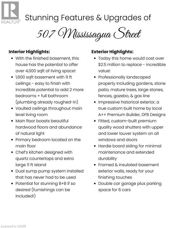 ALL DRESSED UP & WAITING! Located in the heart of wine country, a true custom-built home crafted by local high-end Builder, DFB Designs. Every inch offers the perfect blend of sophistication, charm, & space. Perfectly situated on Mississagua Street, bringing you straight into the heart of Old Town NOTL in just 2 mins. This 2-storey home has a reproduction exterior look suitable for several possibilities FAMILY HOME, B+B (FURNISHINGS CAN BE INCLUDED), RETIRED COUPLE W/ MF BEDROOM! The mf welcomes you with stunning hardwood floors & abundance of natural light. Chef's kitchen - a show-stopper designed w/ quartz countertops, custom blt tall cabinets, high-end appliances including double wide chef’s refrigerator/freezer & 11ft island perfect for entertaining. Primary suite on the main level offers vaulted ceilings, W/I closet, generous 5-pc ensuite w/ dbl vanity. Living rm features architecturally detailed vaulted ceilings, cozy high-end gas fireplace, several walk-outs to the garden, while a separate dining area is spacious inviting for family gatherings. Powder rm & laundry complete main level. Upstairs, 2 adtl over-sized bedrooms w/ their own ensuites. 2nd-level den/office. Basement feat. 9-ft ceilings, framed, insulated exterior walls w/ rough-in plumbing for full bathrm, electric & gravity sump pump - plenty of potential, promising a personalized space for you & potential to bring sqft to 4300 (easy to complete - drawings available). Home is surrounded by professionally landscaped gardens & double-car garage w/ space for 6 cars. Stone interlock rear patio is crowned by a covered gazebo, w/ gas line for BBQ. 100ftx114ft lot. Live the dream in Niagara-on-the-Lake mins to restaurants, world-class theatre, wineries, boutiques, golf & sailing club! With peaceful, small-town feel & so much to explore within walking distance, Old Town - perfect neighbourhood for history, heritage, culture, the arts, and foodies that enjoy Michelin-star type restaurants. SHOW WITH PRIDE! (id:4555)