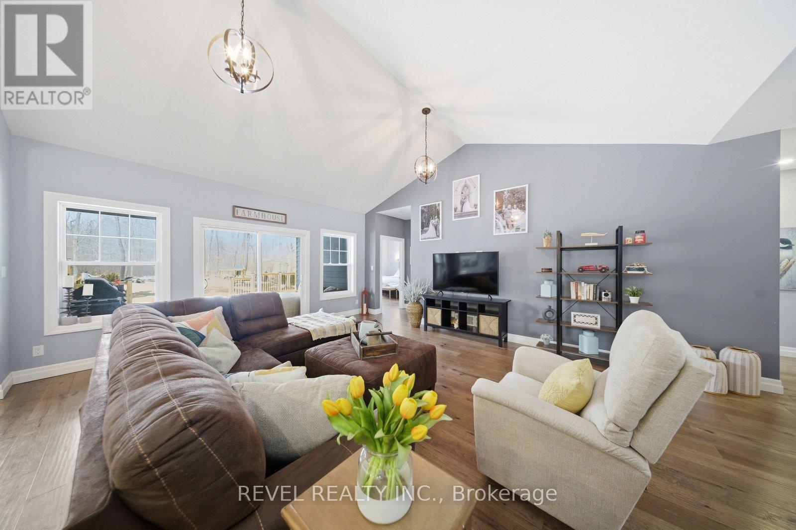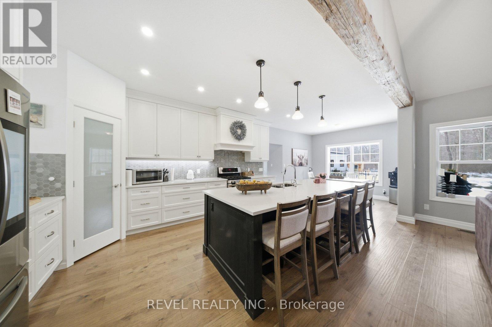 Welcome to this beautifully appointed custom-built ranch offering just under 2,000 sq ft of thoughtfully designed main floor living space, set on a private 1-acre country property backing onto bushland. The open-concept main level features a stunning Pioneer Cabinetry kitchen with quartz countertops, large centre island, corner pantry, and premium finishes, flowing into the bright great room with access to covered front and rear porches with stamped concrete accents. The spacious primary suite offers a luxurious ensuite with double vanity, walk-in tile shower, and soaker tub, and convenient main floor laundry adds everyday functionality. The finished lower level provides two generous bedrooms, a beautifully appointed bathroom with tiled walk-in shower and dual rainfall heads, and a large recreation room perfect for movie nights or family gatherings. The attached garage is fully insulated and heated and includes a 60-amp EV rough-in. A standout feature is the impressive 34' x 60' insulated shop with in-floor heating, 100-amp sub panel, LED lighting, overhead doors, and mezzanine - ideal for hobbies, storage, or recreational use. The backyard is a true retreat with a 15' x 24' heated concrete in-ground pool, expansive concrete decking, additional seating area, and a custom rear deck with recessed hot tub and privacy fencing. With covered porches, a livestock enclosure, outbuilding, and expansive outdoor space ideal for growing families and entertaining, this property offers the perfect balance of comfort, functionality, and country living just minutes from town. (id:4555)