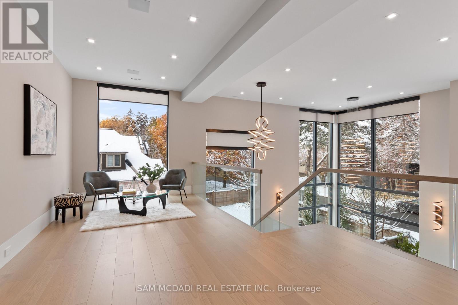 Welcome to this resplendent custom-built masterpiece in Southeast Oakville, where flawless contemporary design meets the serenity of lakeside living. Steps from scenic parks and every desired amenity, this home offers over 7,400 SF of exquisitely curated living space designed for those who appreciate sophistication and comfort in equal measure.From the moment you enter, the open-concept layout invites a seamless flow between elegant entertaining and relaxed everyday living. The chef's kitchen, anchored by a grand Caesarstone island and outfitted with premium Miele appliances, effortlessly connects to the dining area, perfect for hosting intimate dinners or grand celebrations. Wine enthusiasts will delight in the temperature-controlled 648-bottle cellar, while the floor-to-ceiling double-sided fireplace brings warmth. The primary suite is a private sanctuary, complete with a serene balcony, a designer walk-in closet, and a spa-inspired ensuite featuring heated floors and a double-sided fireplace. Three additional bedrooms, each with their own ensuites, ensure every guest enjoys comfort and privacy. The lower level offers a full lifestyle experience, featuring a nanny suite, fitness area, sauna, wet bar, and a spacious recreation room with a walk-up to the entertainer's backyard. Step outside to a resort-like setting with a heated inground pool, hot tub, outdoor BBQ station, and pool house, all designed for effortless entertaining year-round. Additional highlights include White Oak hardwood flooring, porcelain tiles, LED lighting, built-in speakers, and a heated driveway. This home is a true testament to craftsmanship and thoughtful design. (id:4555)