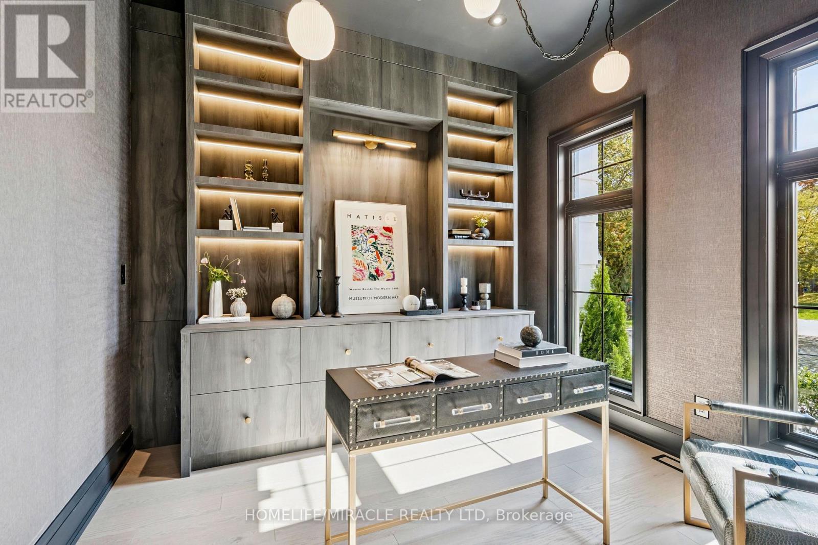 Welcome to 517 Stafford Drive, an architectural masterpiece in the heart of Oakville where luxury, innovation, and comfort unite. Step through a large custom entry door into a bright foyer finished with elegant ceramic tile and custom lighting, leading to a main floor defined by modern sophistication. Every room features built-in speakers and a fully integrated smart-home system for effortless control of lighting, climate, sound, and security. The formal dining room dazzles with a dramatic chandelier and wine display wall, while the sleek home office offers custom shelving and LED lighting. The chef's kitchen showcases full-height cabinetry, integrated appliances, and a Taj Mahal natural stone waterfall island accented with brass fixtures. The open-concept great room impresses with 20-foot ceilings, a striking marble fireplace, and surround sound. Upstairs, the primary suite is a serene retreat with a spa-inspired ensuite, dual vanities, a freestanding tub, and smart lighting. Additional bedrooms include custom closets and private ensuites. The lower level offers a state-of-the-art home theatre, glass-enclosed gym, recreation room, designer wet bar, and cedar sauna for a spa-like experience. Outside, professionally landscaped grounds provide privacy and tranquility. Minutes from Oakville's premier amenities, residents enjoy proximity to Upper Oakville Shopping Centre, Oakville Place, Farm Boy, Whole Foods, and Metro, with parks and trails nearby. Top-ranked schools-Appleby College, Abbey Park High School, and Iroquois Ridge High School-are close at hand. Perfectly located, beautifully finished, and intelligently designed, 517 Stafford Drive is more than a home-it's a refined, connected way of life. (id:4555)