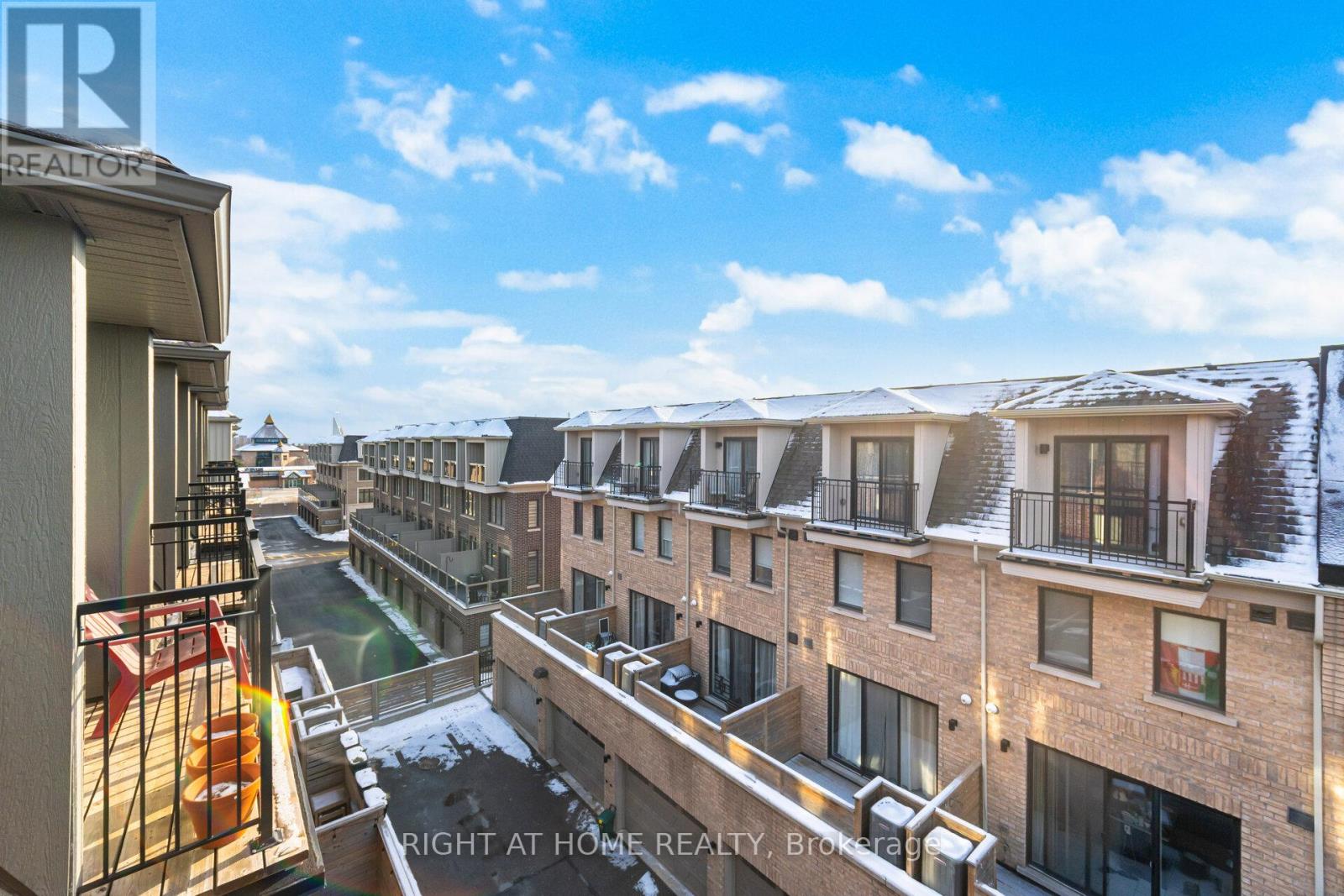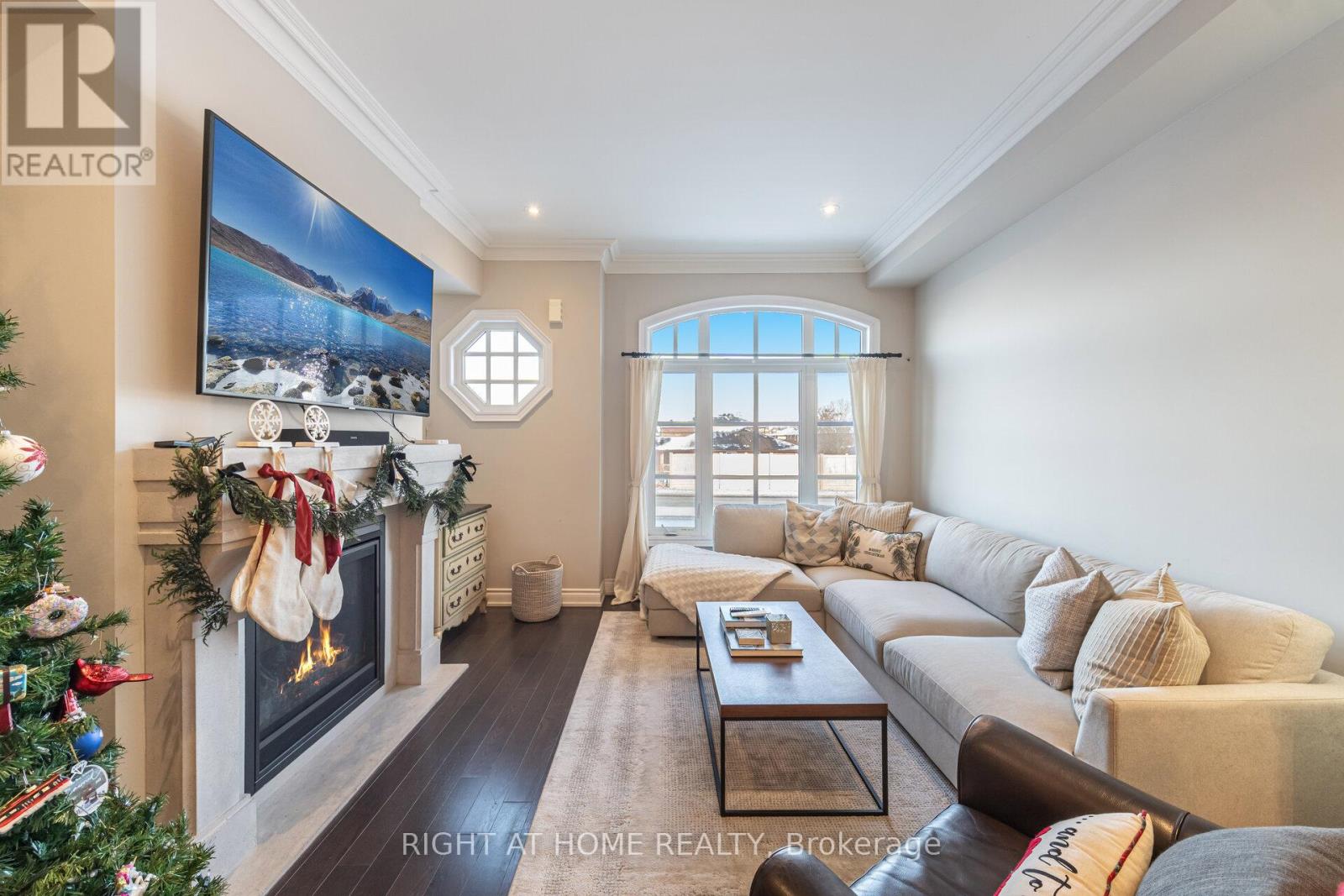 Welcome to this Trafalgar Ridge Townhome by Dunpar, architecturally modelled on the English Georgian Manors, offering 3 bedrooms plus den/office and almost 2,000 sqft of living space! The main level features a fireplace, 9'6'' smooth ceilings with crown mouldings and an open layout with rich dark engineered hardwood flooring in the living room and separate dining room. The beautifully upgraded eat-in kitchen with sleek stone countertops, stainless steel appliances, pendant and pot lights, centre island with breakfast bar, pantry, backsplash, and walk-out to private deck! The 2nd level boasts convenient bedroom-level laundry, a 4pc main bathroom and 2 large bedrooms. The 3rd floor/loft primary bedroom features soaring vaulted ceilings a privacy balcony, a large walk-in closet with dressing area and a 5pc ensuite bathroom with marble countertops, soaker tub and frameless glass shower with marble bench. The ground level offers a den/office, 2pc bathroom, heated flooring in the foyer and convenient inside access from the attached garage with parking for 2 cars! Energy-efficient windows throughout. Monthly POTL fee of $170 includes landscaping, snow & garbage removal, association/property management fee and common elements. Walk to great schools, parks, trails and restaurants. Easy access to transit, highways QEW, 407 and 403, OTMH, shopping and plenty of great amenities! You will LOVE this home! (id:4555)