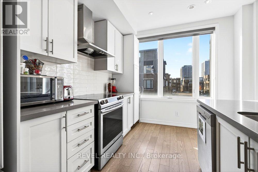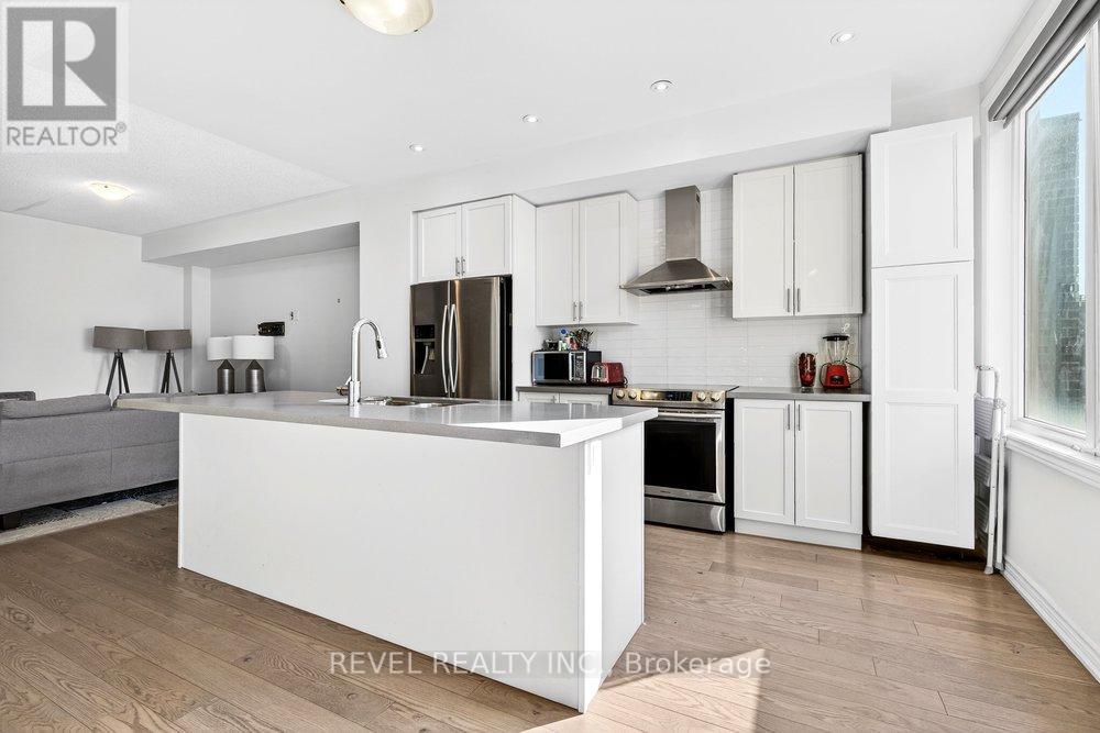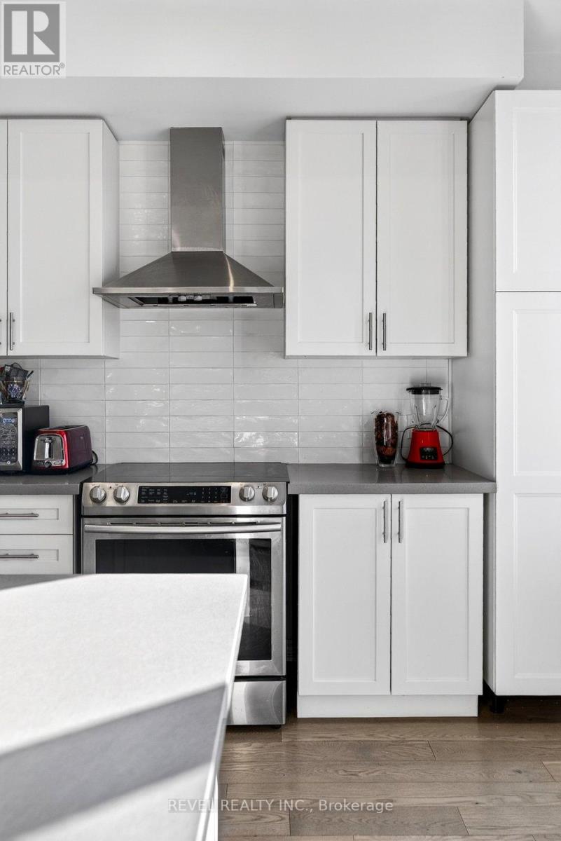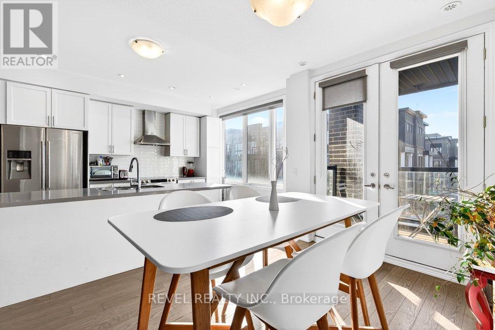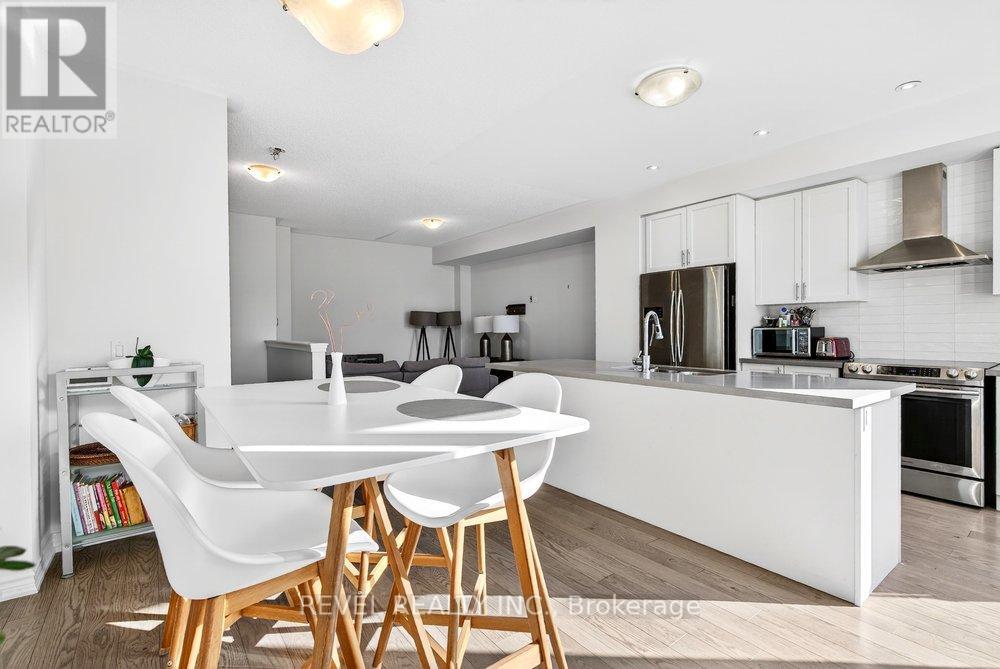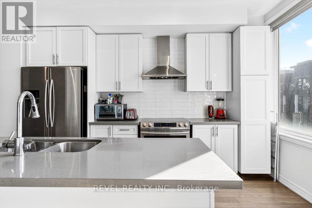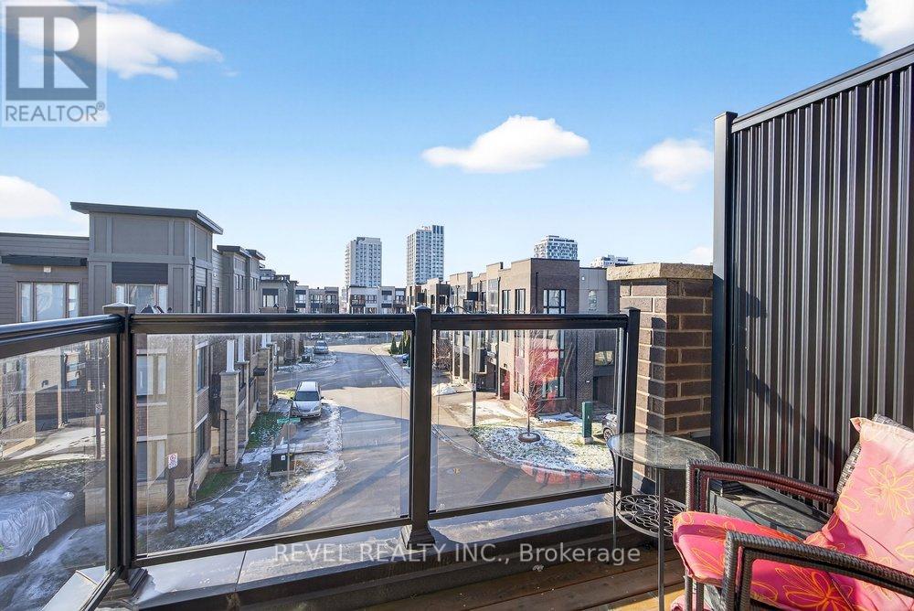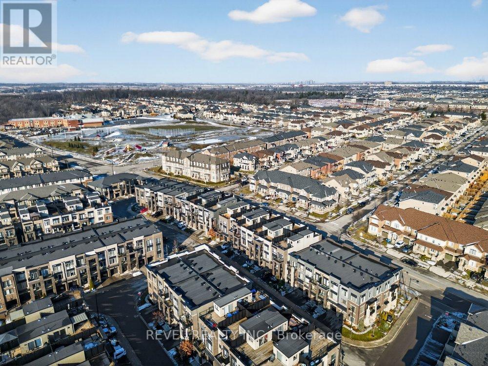 Bright & modern 2-bedroom, 2+1 bath freehold townhome in sought-after North Oakville offering 1,430 sq ft plus an incredible 450 sq ft rooftop terrace with BBQ gas line-perfect for entertaining, summer gatherings, or simply relaxing outdoors. The bright main living area features an open-concept kitchen with quartz countertops, stainless steel appliances, sleek modern cabinetry, designer backsplash, large windows, and pot lights. Wide-plank hardwood floors flow through the family and dining rooms, creating a stylish and inviting space ideal for hosting. The spacious primary suite is filled with natural light and includes his-and-hers closets and a spa-like ensuite with glass shower and quartz vanity. The second and third bedrooms both enjoy access to the rooftop terrace, providing a seamless indoor-outdoor lifestyle rarely found in townhomes. Conveniently located steps to Longo's, Starbucks, parks and everyday amenities, and just minutes to Walmart, major shopping, the GO Train, and highways 403, QEW and 407-this home offers the perfect blend of modern living, outdoor space, and unbeatable convenience. (id:4555)