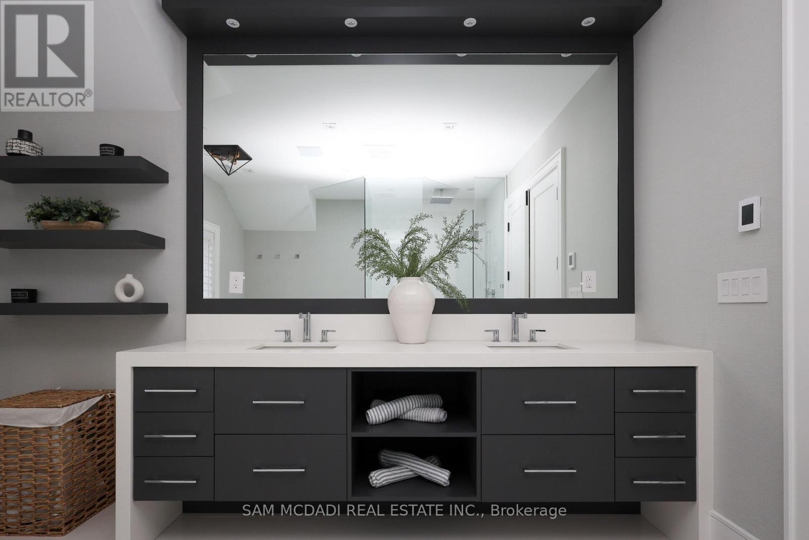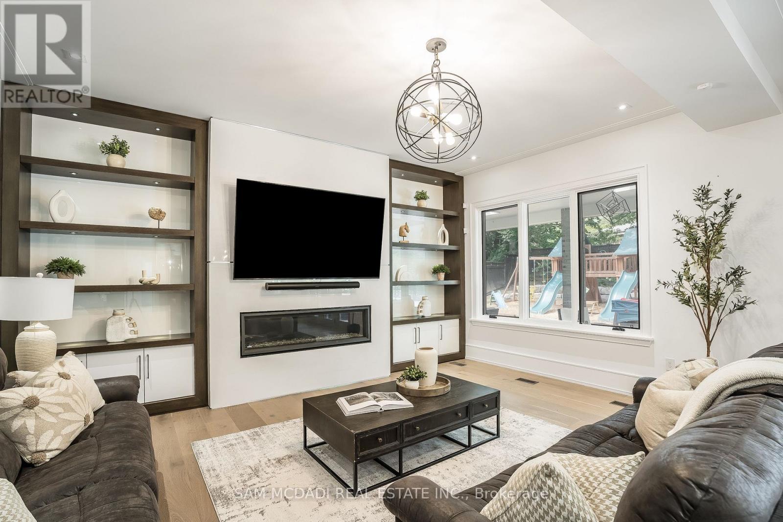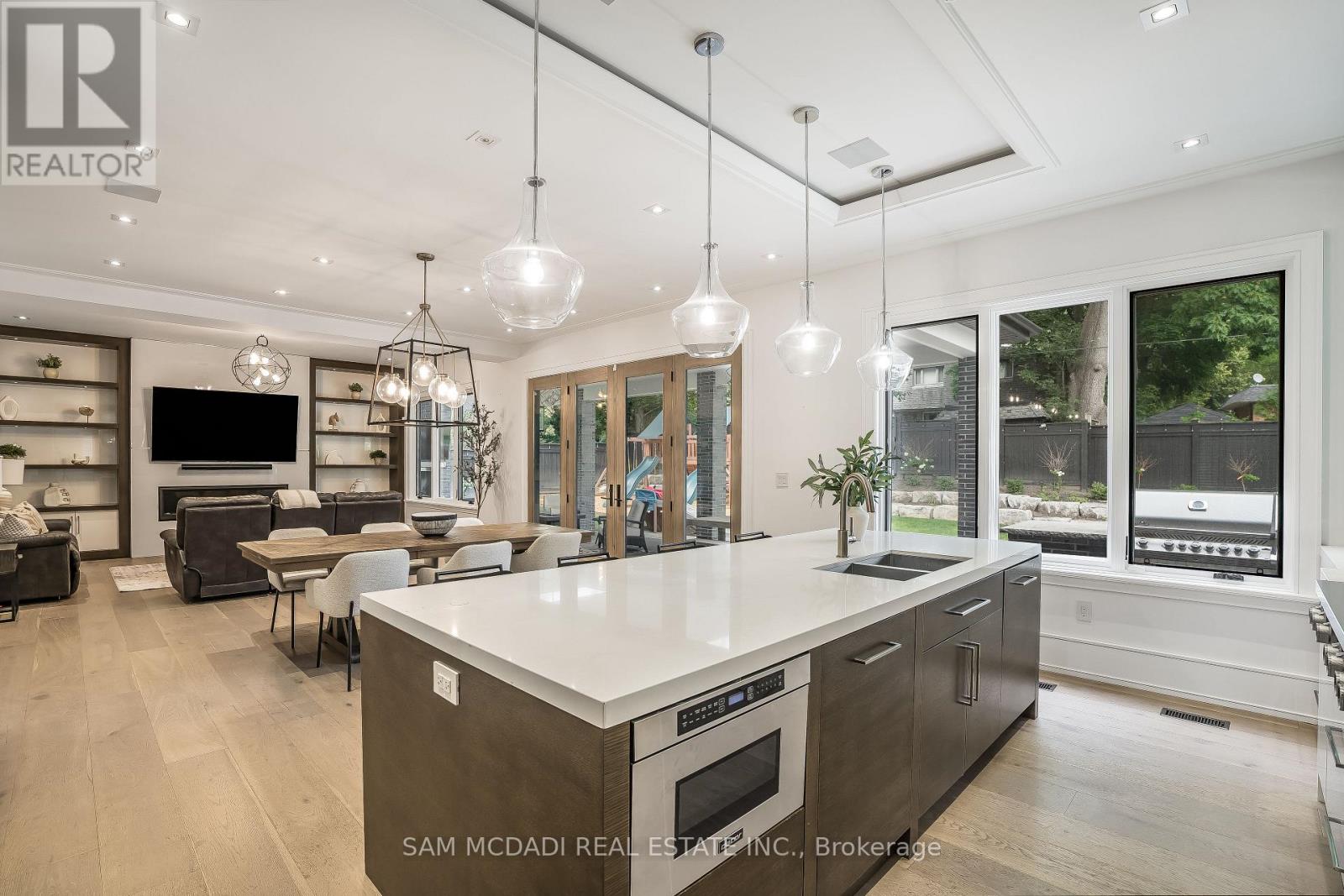 Welcome to an approx. 7,500 sq ft of exceptional living in Southeast Oakville! Set on a professionally landscaped almost half-acre lot in the prestigious Eastlake, this custom Hightower-built estate offers thoughtfully designed, luxurious space. The crown jewel of the home is a newly upgraded, million-dollar backyard oasis. Including a 600 sq ft covered patio with a built-in kitchen with a Napoleon BBQ, a gas fireplace, a saltwater pool with spillover spa, a dedicated play area, and lush perennial gardens. Retreat to an 800 sq ft primary retreat, delivering privacy and true wow factor with vaulted ceilings, two-sided fireplace, wet bar, sitting area, boutique walk-in closet, and a spa-like ensuite featuring heated floors, a soaker tub, and a glass shower. The main floor is designed for both grand entertaining and everyday comfort with natural light pouring through oversized windows. Interior features include 10-foot ceilings, chevron-patterned wide plank hardwood, LED pot lights, built-in speakers, and designer chandeliers. The chef's kitchen is finished in dual-tone lacquered cabinetry with Caesarstone counters, premium Dacor appliances, a bright breakfast area, and a butlers server that connects to the sophisticated dining room. A sleek linear fireplace anchors the family room. The home office stands out with 15-foot cathedral ceilings, a fireplace, custom built-ins, and a walkout to the gardens. Above, you'll find three generously sized bedrooms, each with radiant heated ensuite baths and custom closets. Downstairs, the walk-up lower level is built to impress with a full wet bar, wine cellar, large rec room, two guest bedrooms, a gym with cushioned flooring, cedar infrared sauna, and a new two-tiered home theatre. Additional features include a Control4 smart home system, a two-car garage with car lift potential, and a location just minutes from top-rated public and private schools, lakefront parks, downtown Oakville, and QEW access for a seamless Toronto commute. (id:4555)