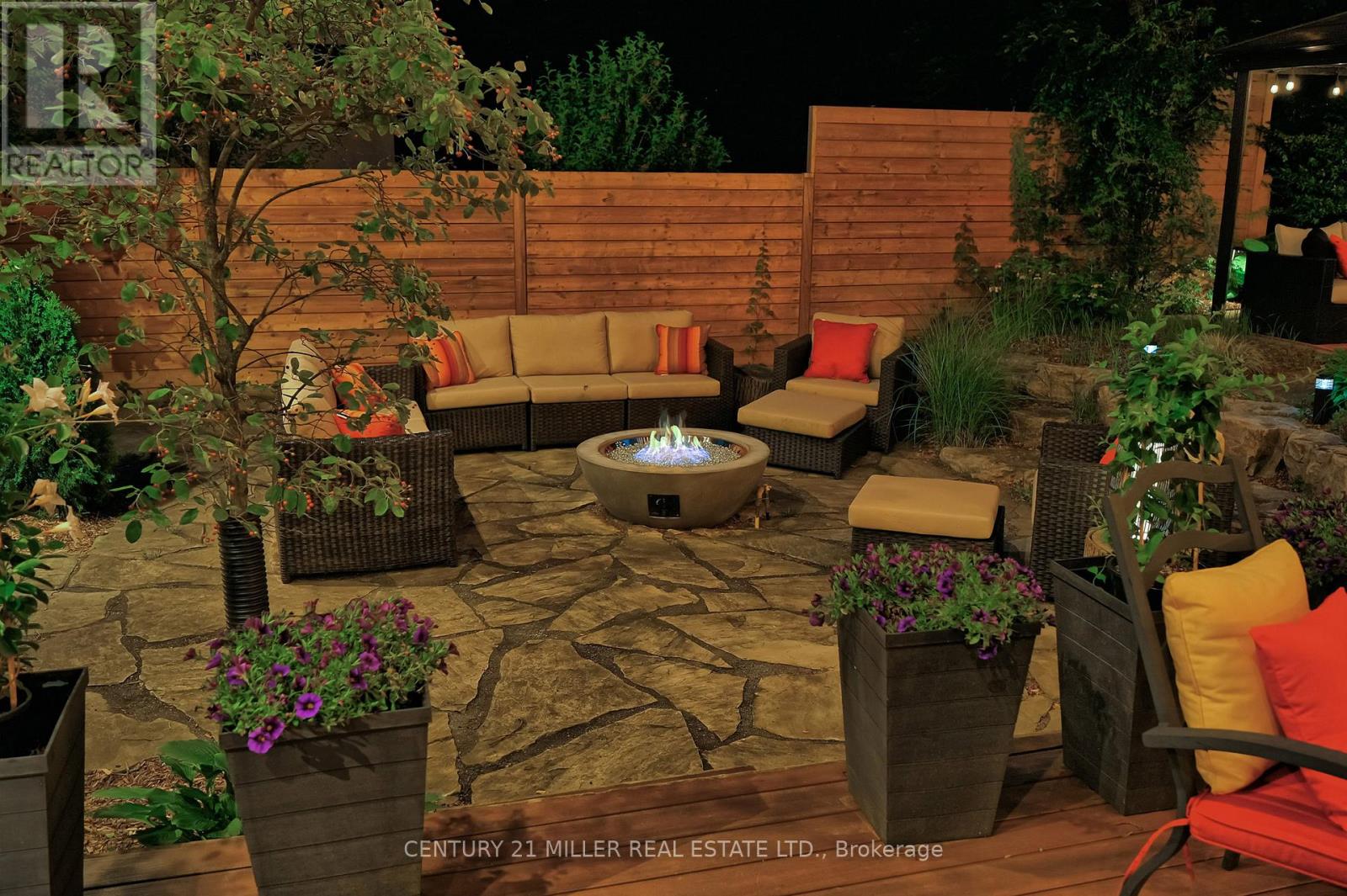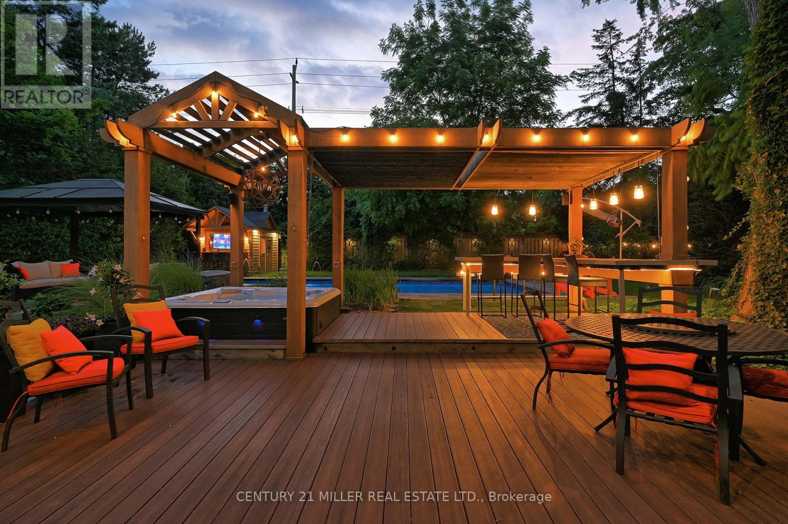 Located south of Lakeshore Road in a prestigious enclave of Ford, this executive family home blends traditional comfort with contemporary refinement. Set back on a mature lot framed by evergreens, it's a short stroll to the shores of Lake Ontario and positioned within a well-known, family-friendly pocket. A boulder-lined drive and flat stone pavers lead to the cedar-planked front portico, opening to a refined + cohesive interior. Expansive glazing fills the principal living spaces with natural light, complemented by detailed millwork, white oak hardwood flooring + neutral tile throughout. The living room features a picturesque bay window with upholstered seating, while the formal dining room is ideal for entertaining. A cozy wood-burning fireplace anchors the family room with serene rear garden views. The eat-in kitchen offers abundant custom cabinetry and a large glass slider for seamless access to the rear deck. A functional utility wing includes a mudroom, rear access + powder room. The primary retreat offers tranquil backyard views, full-wall built-in closets + a spa-inspired ensuite with oversized steam shower. Three additional bedrooms share a beautifully appointed main bath + second-level laundry adds everyday ease. Featured on HGTV, the lower level extends the home's refined living space with a stone-clad wood-burning fireplace, expansive rec room with projector and surround sound + an outfitted wet bar, ideal for gatherings. A gym + guest bedroom with semi-ensuite complete the level. The backyard unfolds like a private resort, anchored by a crisp rectangular pool, pergola-covered hot tub, outdoor kitchen, dining area, lounge pavilion + seated bar, all framed by natural stone terraces + mature greenery. Designed for both grand entertaining + quiet daily rituals, this is a sophisticated home with an immaculately private, resort-style backyard in one of Oakville's most family-focused neighbourhoods. (id:4555)