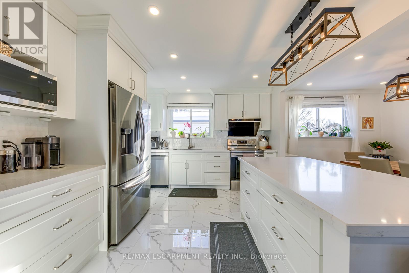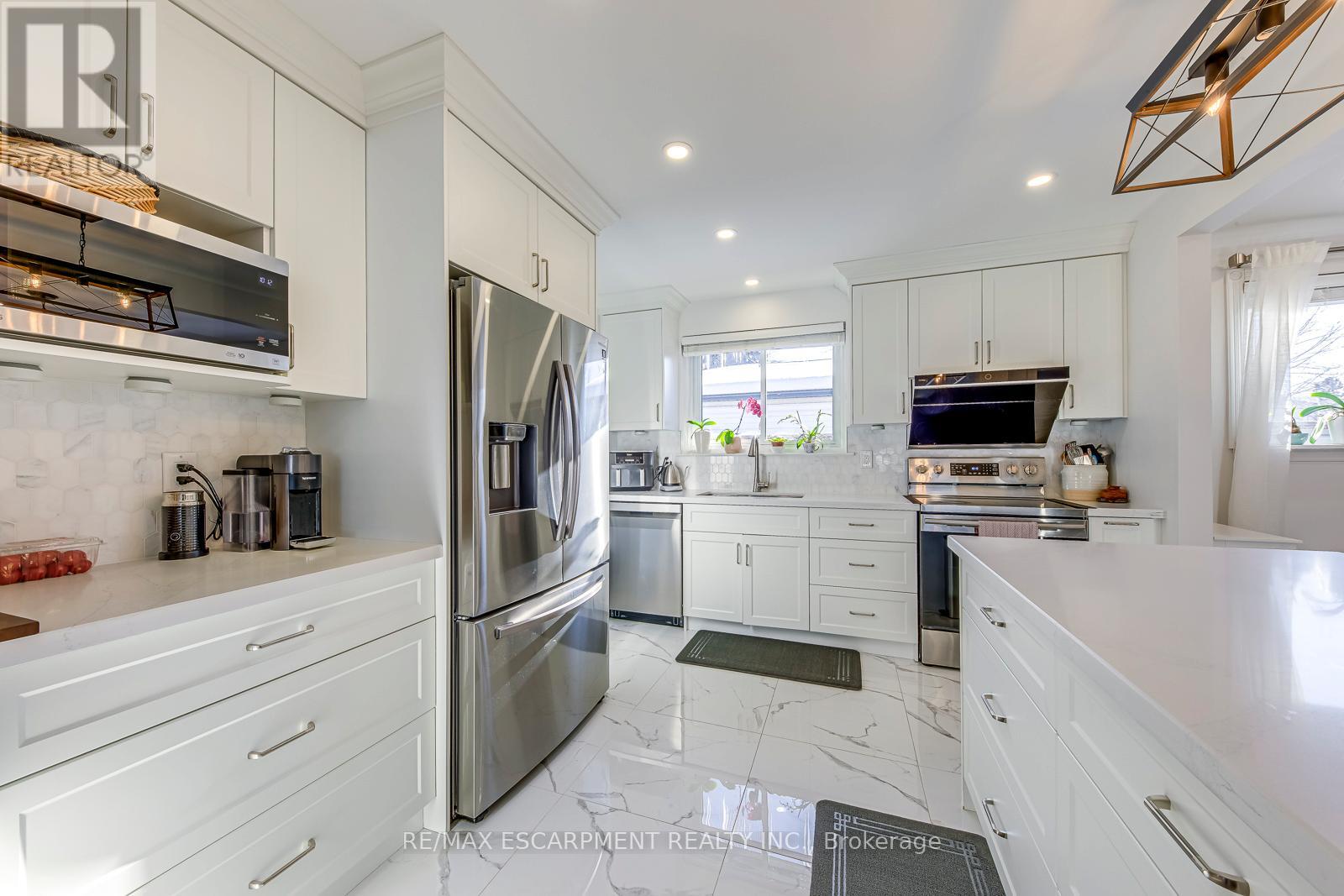 Welcome to this beautifully renovated detached sidesplit located on a quiet, family-friendly crescent in desirable West Oakville. This bright and modern home features an updated kitchen with custom white cabinetry, quartz countertops, a large centre island, stainless steel appliances, and designer lighting, flowing seamlessly into the open-concept dining and living areas highlighted by wide-plank hardwood flooring, pot lights, and oversized windows. The upper level offers three well-proportioned bedrooms and updated bathrooms finished in timeless neutral tones, while the lower level provides a cozy family room with electric fireplace and large above-grade windows, ideal for a media room, home office, or additional living space, plus a partially finished basement for storage or flexible use. Additional features include central air conditioning, forced-air gas heating, landscaped front yard with walkway, in-ground sprinkler system, finished laundry area, private driveway, and attached garage. Conveniently located minutes to Bronte GO Station, QEW and Highway 403, Bronte Village, parks, schools, shopping, and the Oakville waterfront, this move-in-ready home offers comfort, style, and an exceptional neighbourhood for families or professionals alike. (id:4555)