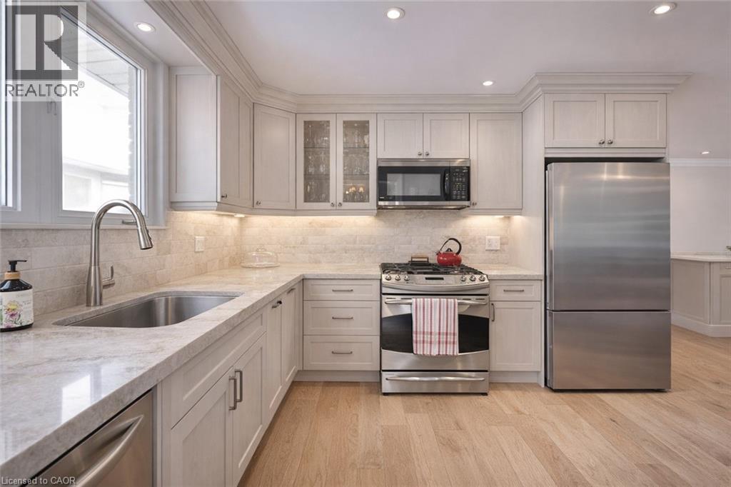 Tucked away on a quiet, tree-lined street in prestigious Old Oakville, this beautifully updated bungalow offers refined, move-in ready living in one of the area’s most coveted neighbourhoods. The open-concept main floor is thoughtfully designed, featuring a chef-inspired kitchen with premium finishes, a spacious dining area, and an inviting living room anchored by a stone gas fireplace. Double doors open to a private, professionally landscaped backyard oasis complete with a hot tub, terrace, and comfortable lounge spaces, ideal for entertaining or unwinding in total privacy. The main level is anchored by a generous primary bedroom with walkout access to the garden, along with a second bedroom and a full bathroom. A striking open staircase leads to the bright, expansive lower level, where oversized windows and stone retaining walls flood the space with natural light. This level showcases a stunning recreation room with a stone fireplace, a third bedroom, and a spa-inspired bathroom featuring a walk-in steam shower, creating a warm and welcoming retreat. Perfectly located within walking distance to downtown Oakville’s shops and restaurants, the lakefront, GO Station, Whole Foods plaza, and top-ranked schools including Oakville Trafalgar High School, Linbrook, and St. Mildred’s-Lightbourn. Note: The two bedrooms on the main level can be converted back to three. The existing carport can be easily converted into a single- car garage. (id:4555)