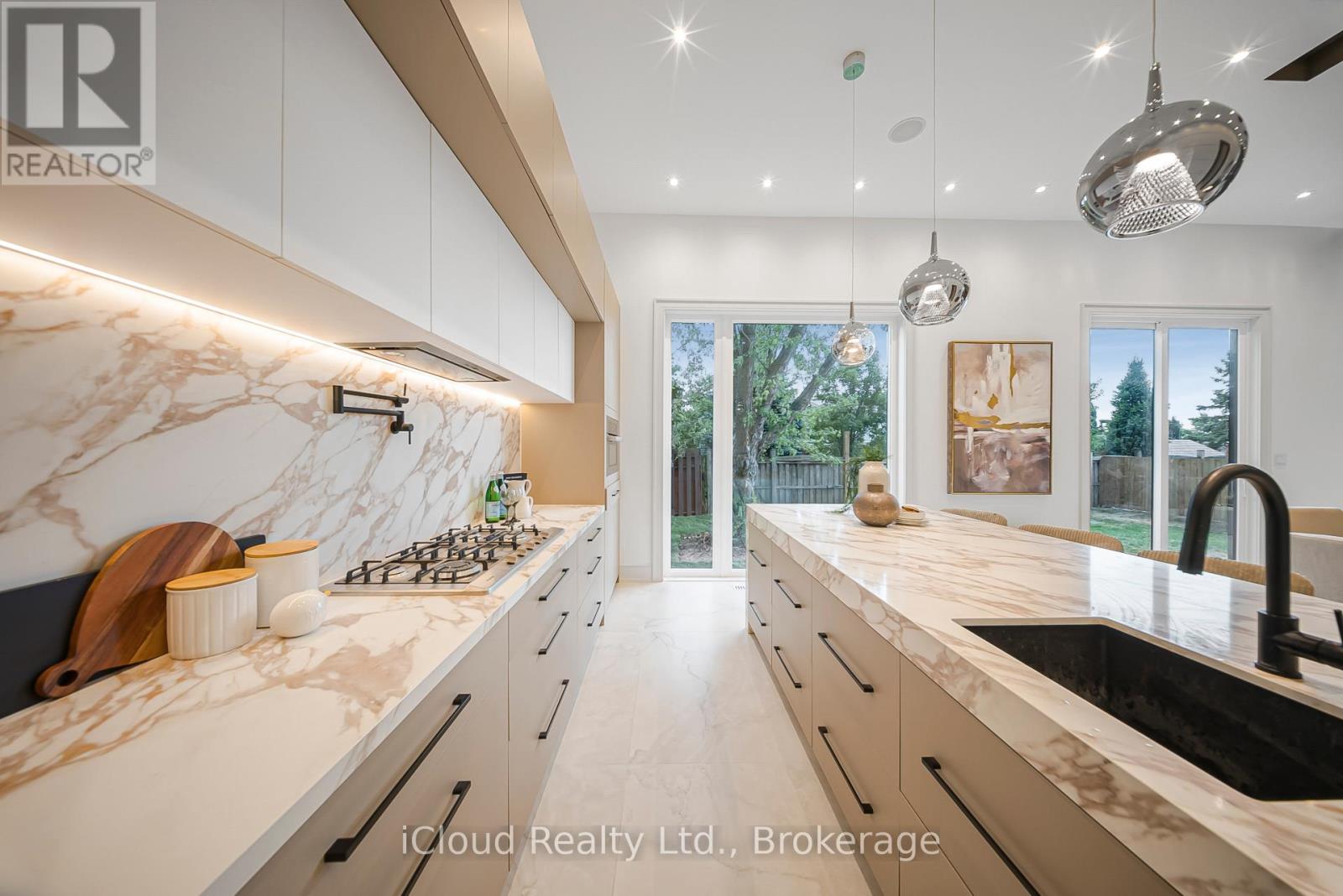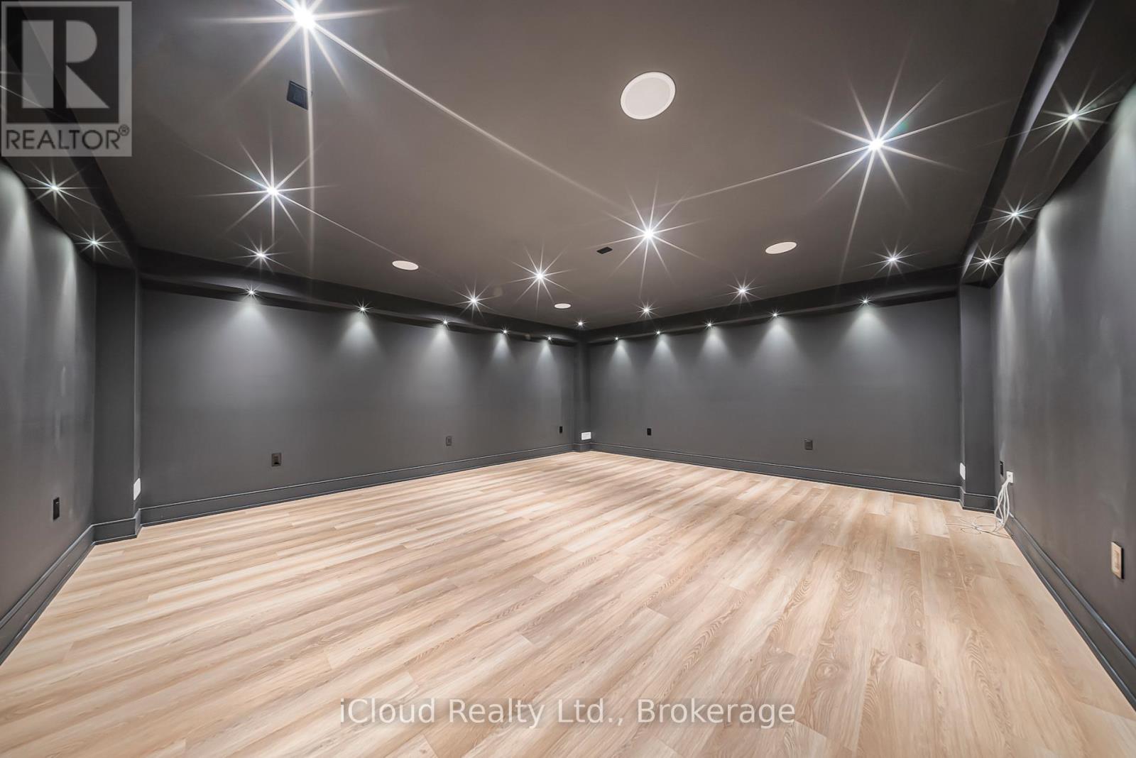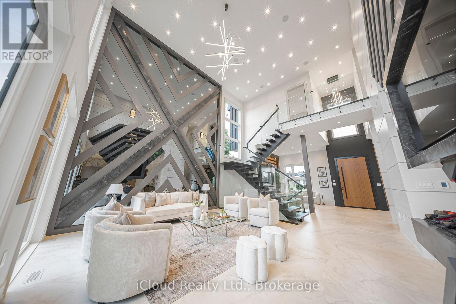 This newly built modern custom home offers over 5000 sqft. of lavish living space. Whether you're commuting, enjoying the outdoors, or raising a family, this location on a quiet street of Oakville offers the perfect balance of convenience and lifestyle. This elite modern home is design and built by Zarina Construction. As you step through the oversized front door, you're welcomed by a dramatic 23-ft foyer with heated Italian tile flooring that flows through the main level. The main level features a private home office, an elegant living room with a stunning marble, wood, and mirror accent wall, and a breathtaking open-to-above family room. Anchored by a custom diamond-pattern feature wall and a double-sided Dimplex fireplace, large windows, this space is the heart of the home -open, bright, and welcoming.The gourmet kitchen is a chefs dream, offering a spacious island, custom cabinetry, and built-in Miele appliances. A separate spice kitchen keeps bold flavors contained and the main kitchen spotless. The layout flows seamlessly into a formal dining area with a walkout to the fully fenced backyard.Upstairs, you will find four generous bedrooms, each with its own ensuite bathroom featuring custom floating vanities, integrated sinks, heated tile flooring, and calming finishes. The primary suite is a luxurious retreat with a custom walk-in closet and a spa-like 5-piece ensuite with a freestanding tub, curbless shower, and dual vanities. A laundry room on this floor adds convenience.The finished basement offers 11.5-ft ceilings, a bright open rec area, a second kitchen, two bedrooms with a shared bath, and for the ultimate movie night experience, there's a dedicated theatre room fully equipped with 4 dedicated speakers for a true cinematic experience. This home also includes 16 built-in speakers throughout. With a basement walkout and large windows bringing in natural light. This home is a reflection of modern luxury tailored to your lifestyle. (id:4555)