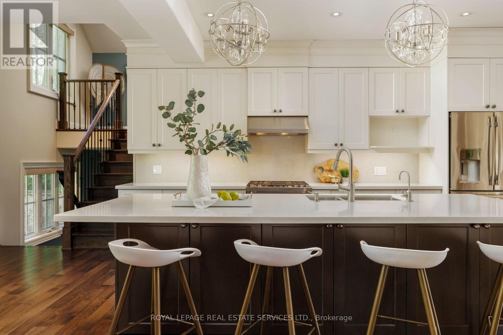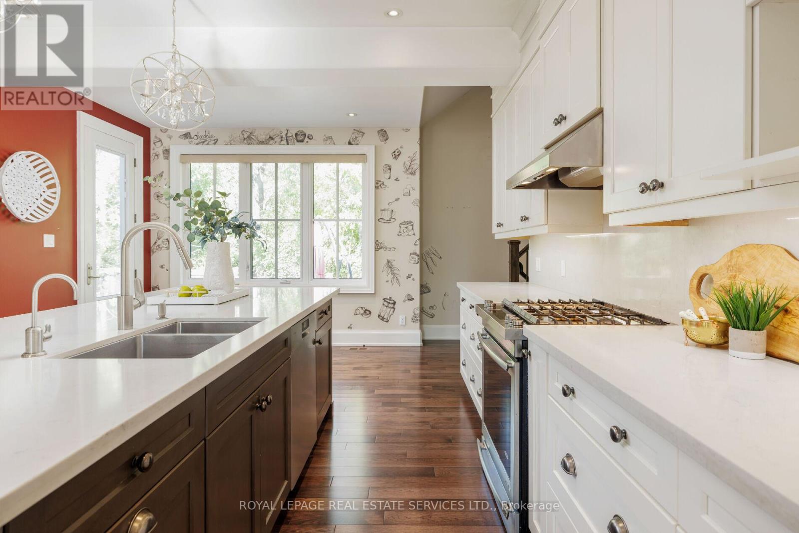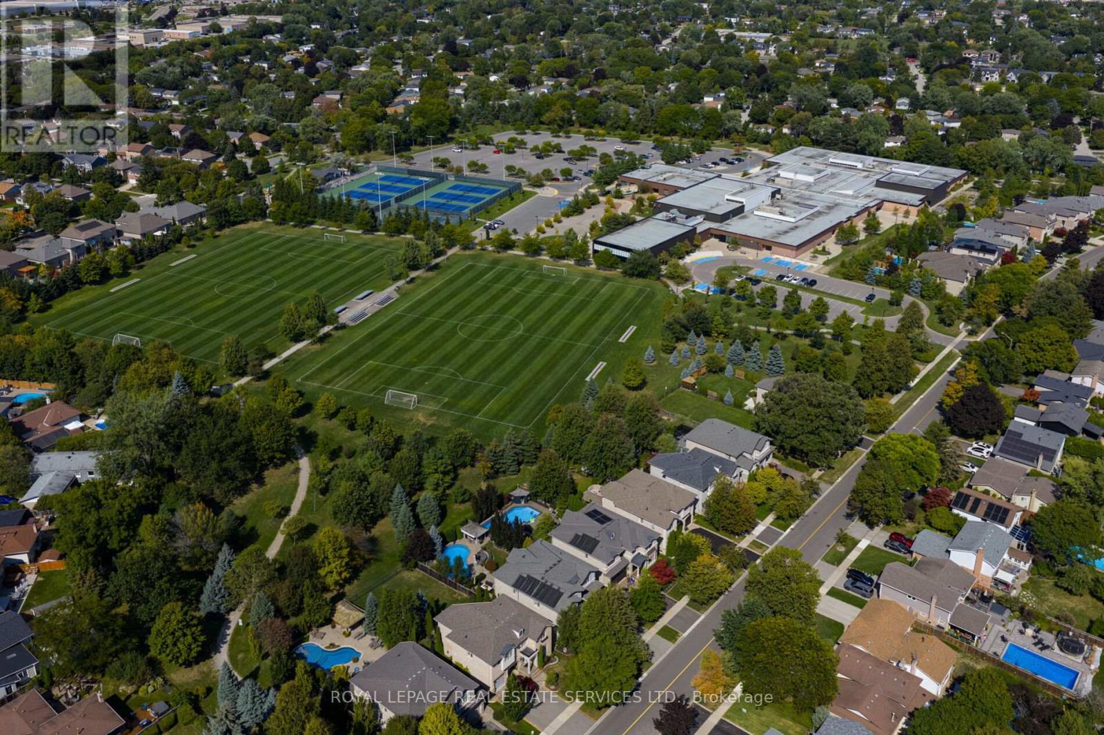A remarkable lifestyle awaits in Oakville's highly sought-after West Oakville community, where every convenience is just steps away. This exquisite custom raised bungaloft, redesigned in 2016 by Keeren Designs, backs directly onto the scenic Donovan Bailey Trail & is only a 3-minute walk to the Queen Elizabeth Park Community & Cultural Centre. Enjoy nearby Bronte Harbour, Lake Ontario, waterfront parks, & Bronte Village's shops & restaurants, all just minutes away, with quick commuter access to Bronte GO Station & the QEW/403. Showcasing undeniable curb appeal, this luxury home features a stucco façade with accent shutters, stone steps leading to a covered entry with columns & iron railings, interlocking stone walkways, professional landscaping with mature trees, a 9-zone irrigation system, & exterior cameras. The private backyard retreat offers upper & lower stone patios, gardens with armour stone accents, evergreens, & direct trail access. Inside, the residence boasts 2+3 bedrooms, 2.5 bathrooms, & a versatile loft perfect as a bedroom, home office, or studio. The 2016 transformation added a gourmet kitchen, wide-plank hardwood, designer tiles, custom built-ins, deep trim, built-in speakers, & expandable Control4 smart home automation. Designed for comfort & entertaining, the open-concept main floor offers 9' ceilings, family room with gas fireplace, spacious dining room, & chef's kitchen with custom cabinetry, quartz counters, oversized island with seating for 6, high-end appliances, & a breakfast area with walkout to the backyard. The primary suite showcases 2 walk-in closets & a spa-inspired 4-piece ensuite with soaker tub & oversized glass shower. The finished lower level includes a large recreation room, 3 bright bedrooms, 3-piece bath with heated floor & glass shower, oversized laundry, & abundant storage. Upgrades include furnace, HRV, roof shingles (2016), & recently, some main floor windows updated, & addition of a custom 8' solid wood front entry door. (id:4555)