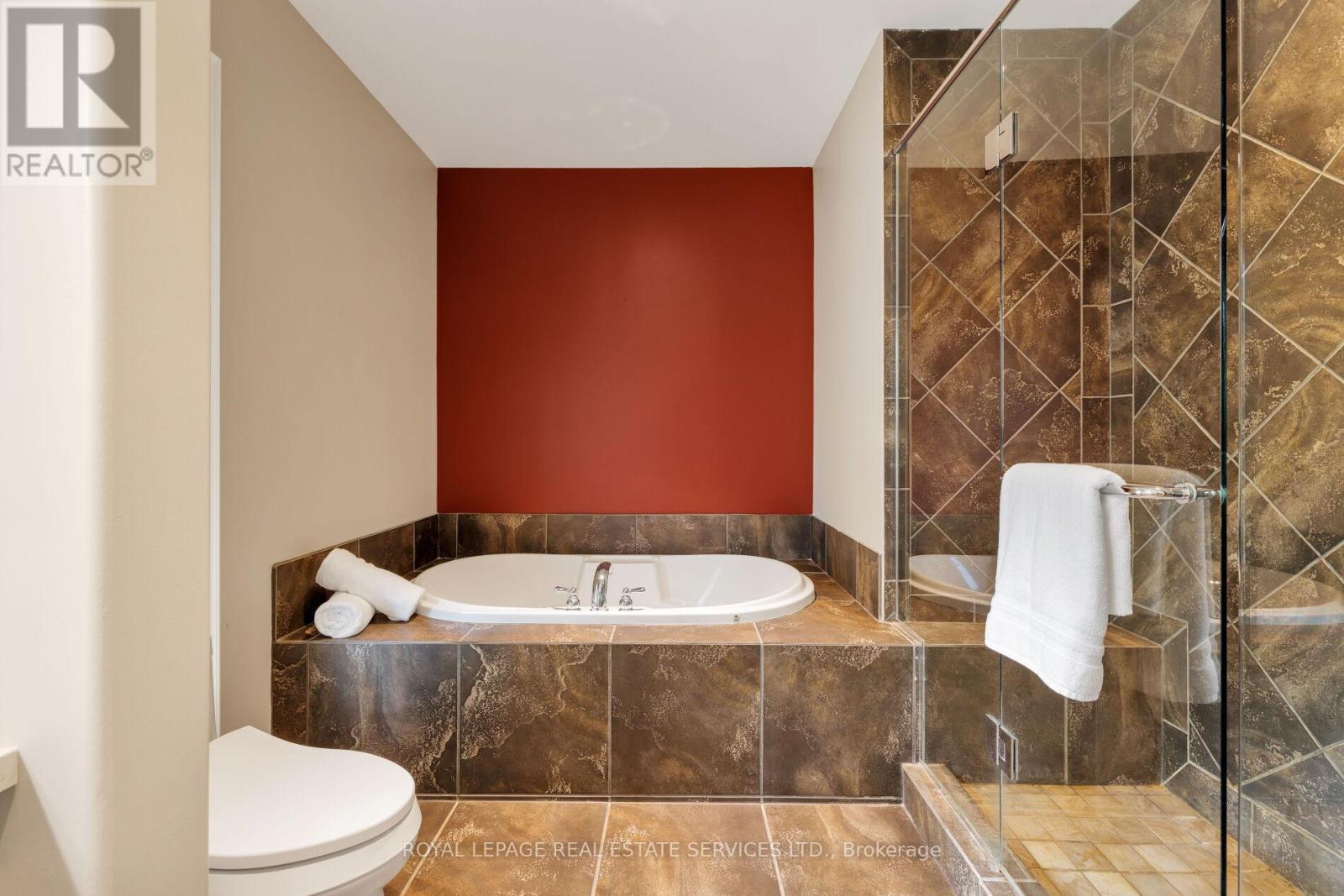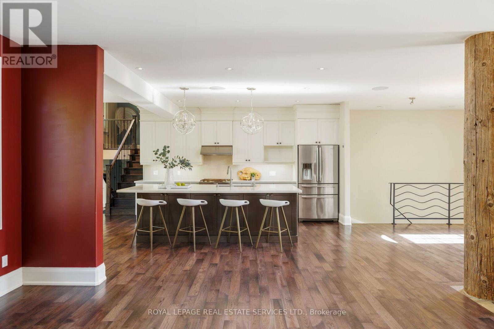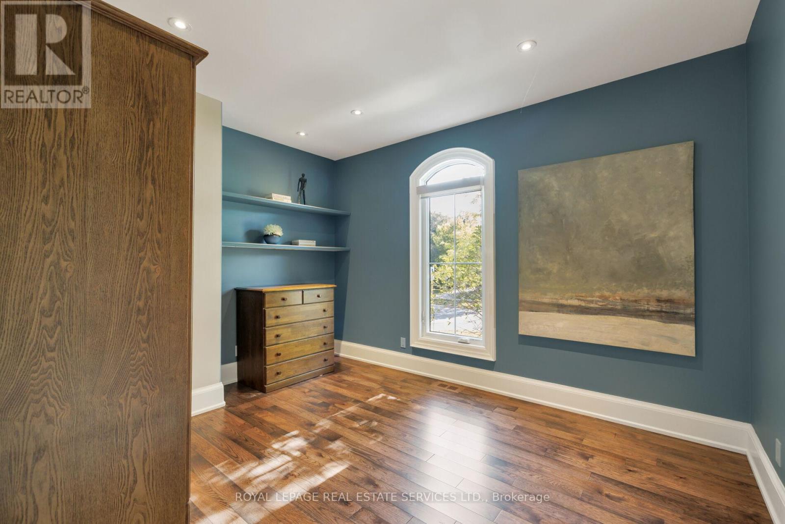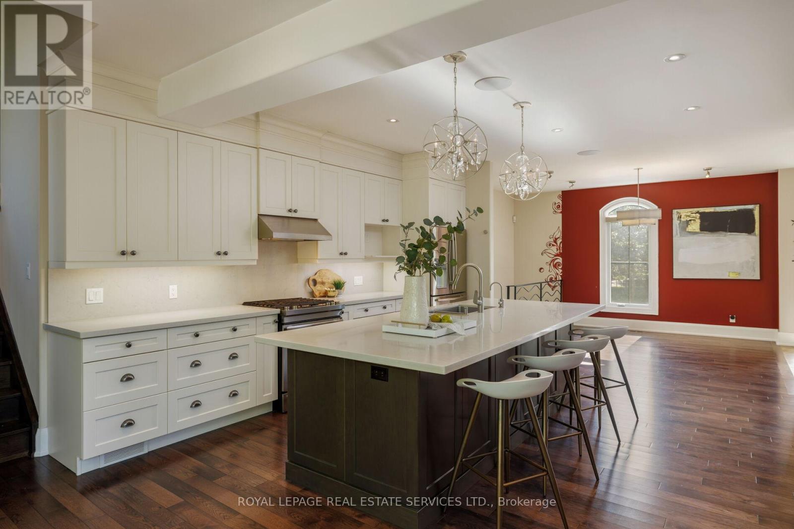 A remarkable lifestyle awaits in Oakville's highly sought-after West Oakville community, where every convenience is just steps away. This exquisite custom raised bungaloft, redesigned in 2016 by Keeren Designs, backs directly onto the scenic Donovan Bailey Trail & is only a 3-minute walk to the Queen Elizabeth Park Community & Cultural Centre. Enjoy nearby Bronte Harbour, Lake Ontario, waterfront parks, & Bronte Village's shops & restaurants, all just minutes away, with quick commuter access to Bronte GO Station & the QEW/403. Showcasing undeniable curb appeal, this luxury home features a stucco façade with accent shutters, stone steps leading to a covered entry with columns & iron railings, interlocking stone walkways, professional landscaping with mature trees, a 9-zone irrigation system, & exterior cameras. The private backyard retreat offers upper & lower stone patios, gardens with armour stone accents, evergreens, & direct trail access. Inside, the residence boasts 2+3 bedrooms, 2.5 bathrooms, & a versatile loft perfect as a bedroom, home office, or studio. The 2016 transformation added a gourmet kitchen, wide-plank hardwood, designer tiles, custom built-ins, deep trim, built-in speakers, & expandable Control4 smart home automation. Designed for comfort & entertaining, the open-concept main floor offers 9' ceilings, family room with gas fireplace, spacious dining room, & chef's kitchen with custom cabinetry, quartz counters, oversized island with seating for 6, high-end appliances, & a breakfast area with walkout to the backyard. The primary suite showcases 2 walk-in closets & a spa-inspired 4-piece ensuite with soaker tub & oversized glass shower. The finished lower level includes a large recreation room, 3 bright bedrooms, 3-piece bath with heated floor & glass shower, oversized laundry, & abundant storage. Upgrades include furnace, HRV, roof shingles (2016), & recently, some main floor windows updated, & addition of a custom 8' solid wood front entry door. (id:4555)