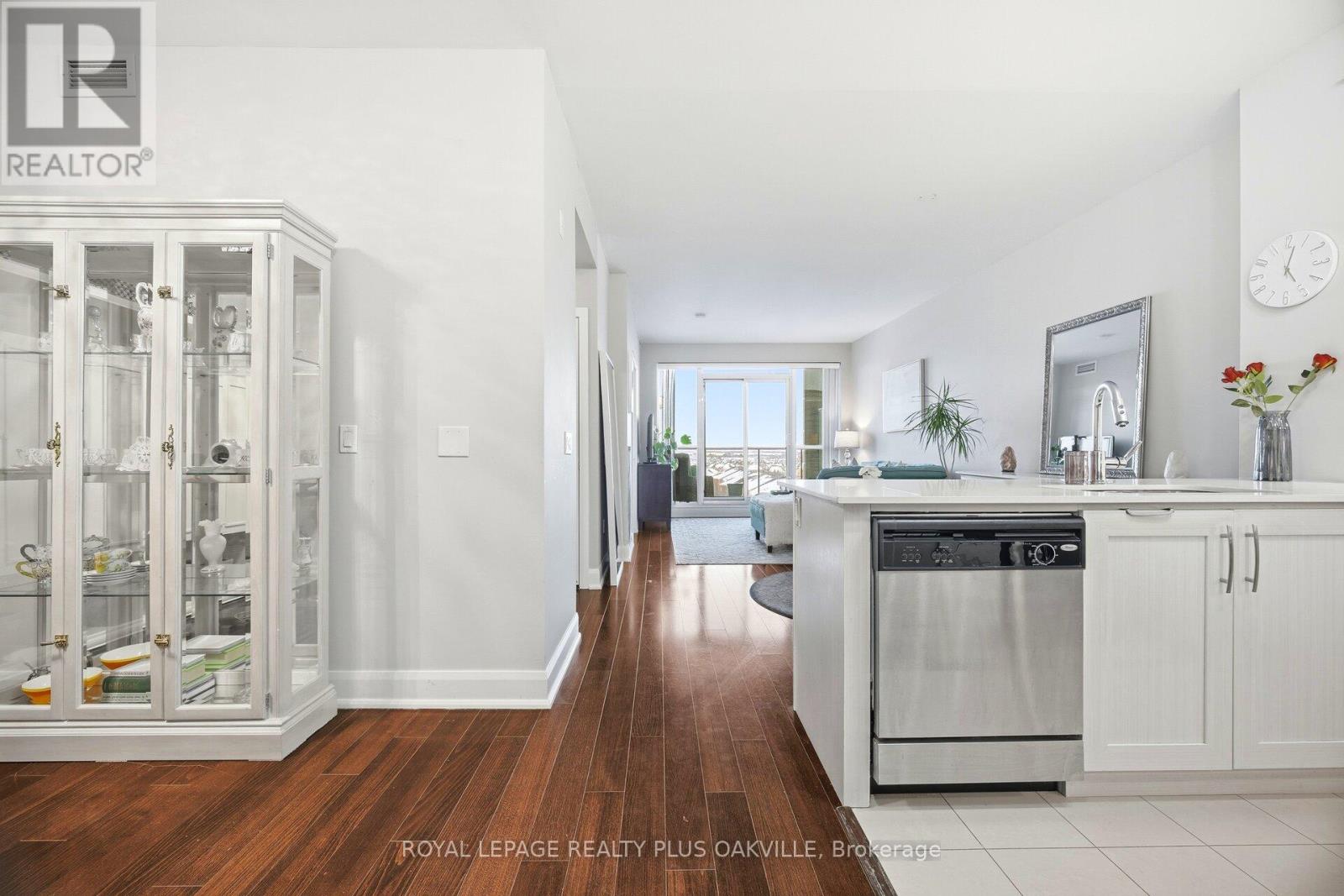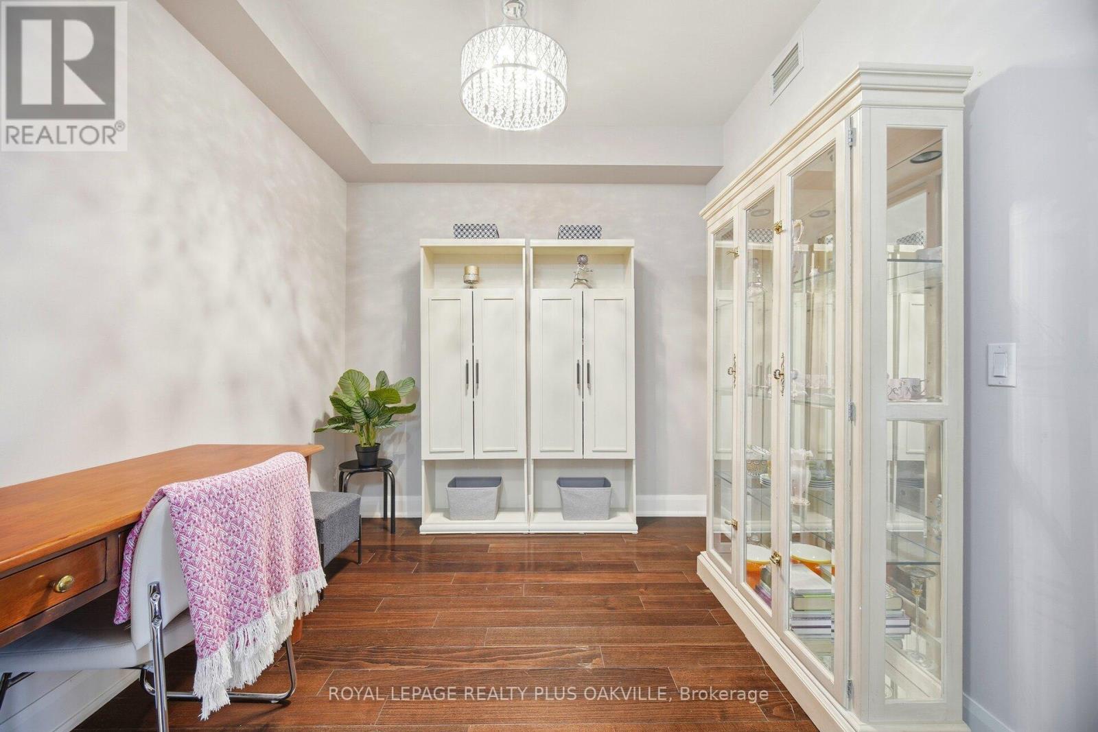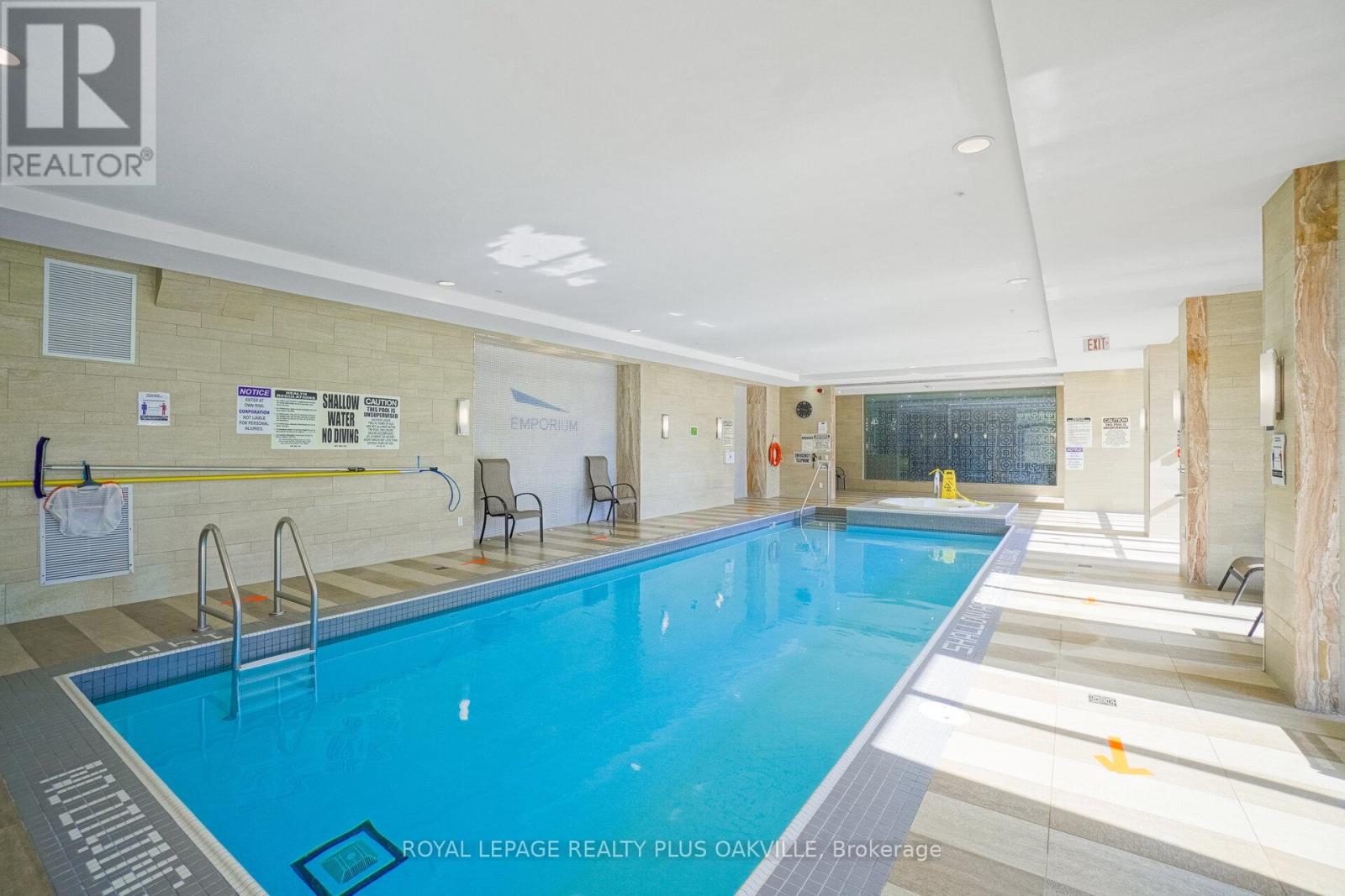 Stunning 1+1 bedroom condo in the Emporium with unobstructed East sunrise views! Enjoy city skyline and lake views! Fully upgraded unit with 9 foot smooth ceilings, hardwood floors & open concept layout! Kitchen features Quartz counters, porcelain floors, recessed lighting, glass backsplash, stainless steel appliances & a breakfast bar! Spacious den! Tastefully decorated! Bedroom has large wall to wall closet with built-in shelving! Amazing amenities include indoor pool, sauna/steam room, gym, party/meeting room, movie theatre, games room, outdoor children's play area and more! Concierge. 24 Hour Security. Walk to Starbucks, Shoppers Drug Mart, TD Bank, salon, spa & more! Quick access to Highways 403, 407 and QEW! 1 underground parking. 1 locker. (id:4555)