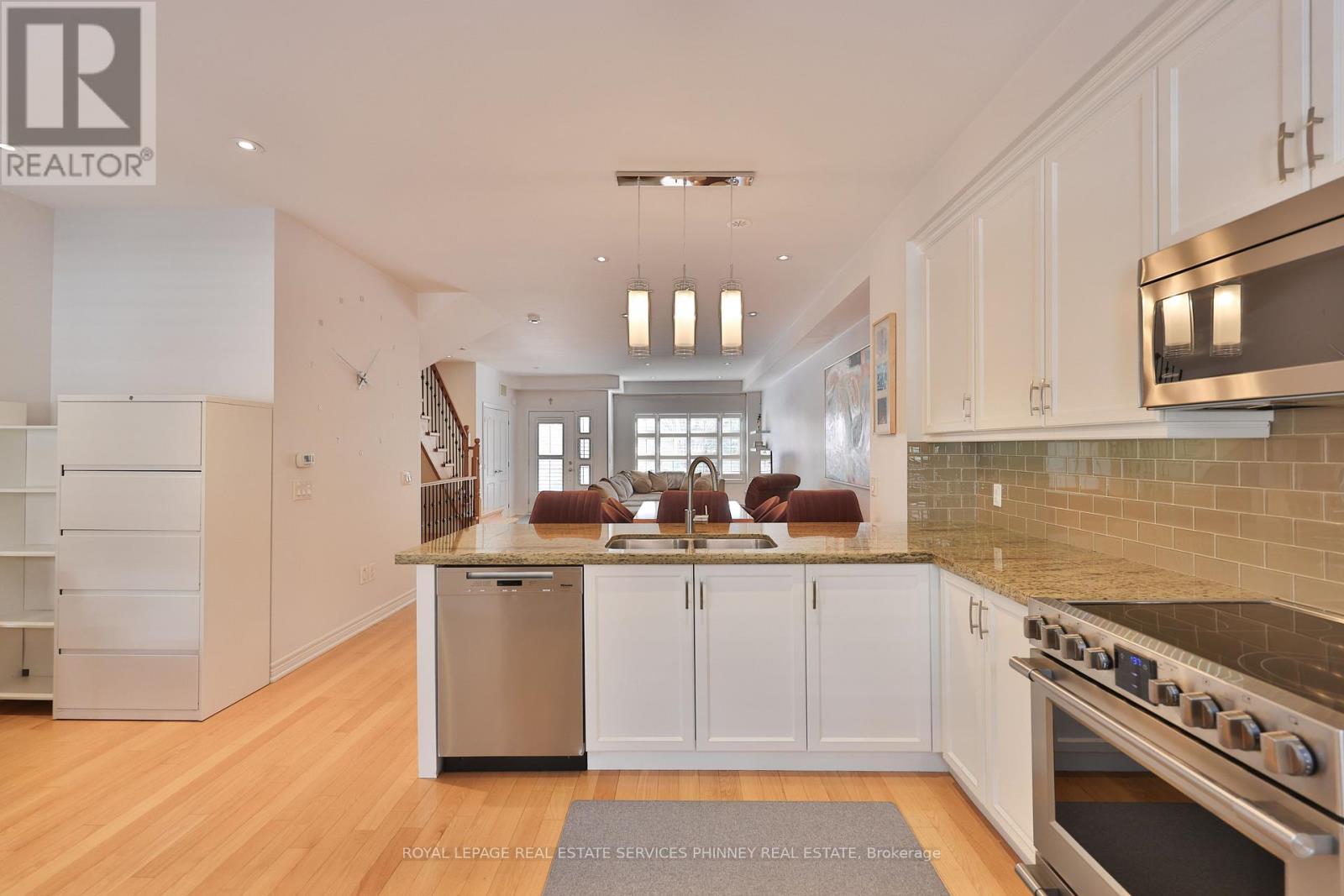 Welcome to this beautifully appointed 3-bedroom, 3-bath executive townhome in sought-after Joshua Creek, perfectly positioned in a premium location within the complex facing private parkland and green space. This light-filled home is bright and airy with an open-concept main level featuring 9-foot ceilings, spacious living and dining areas, and an eat-in kitchen (currently configured with a convenient work from home office). Enjoy upgraded granite countertops, stainless steel appliances, hardwood flooring throughout, and a walk-out to the private back deck.Upstairs, the primary suite features a walk-in closet with custom organizers, a 4-piece ensuite, and a walk-out to a private balcony. Two additional bedrooms, a full 4-piece bath, and upper-level laundry for added convenience. The finished lower level offers ample storage and direct walk out access to the updated garage. Enjoy amenities in the nearby condominium building including the indoor pool, fitness, billiards, theatre and party rooms. Ideally located steps to shops, restaurants, and everyday amenities, centrally located with easy access to major highways and situated in an excellent school district. This exceptional home combines style, convenience, and an unbeatable location (id:4555)
