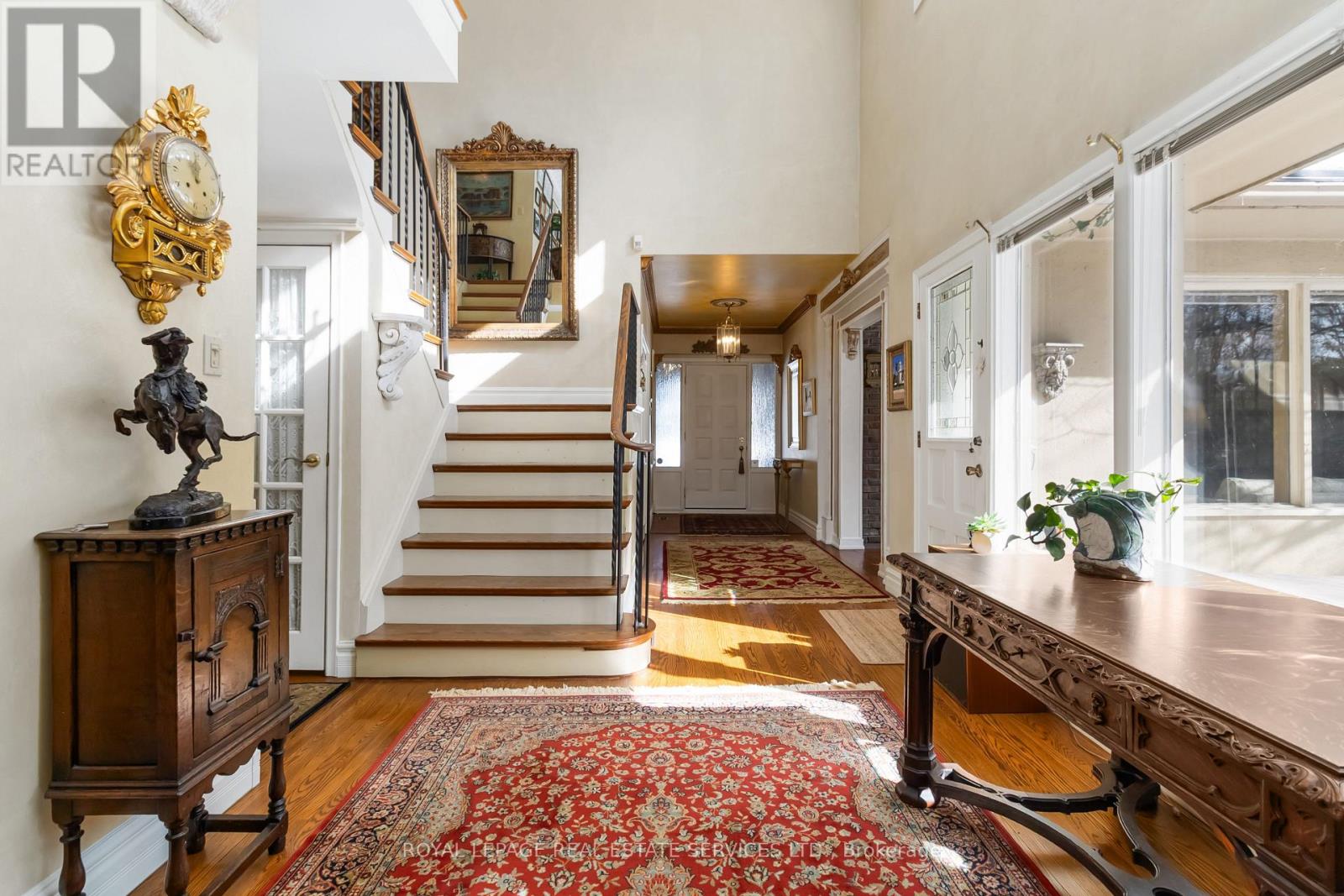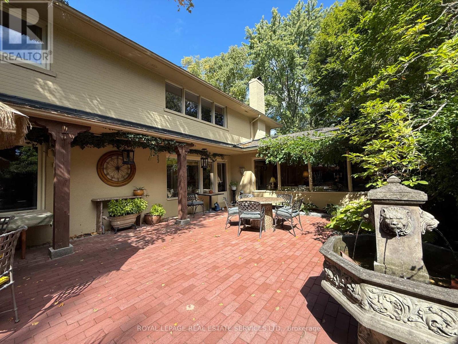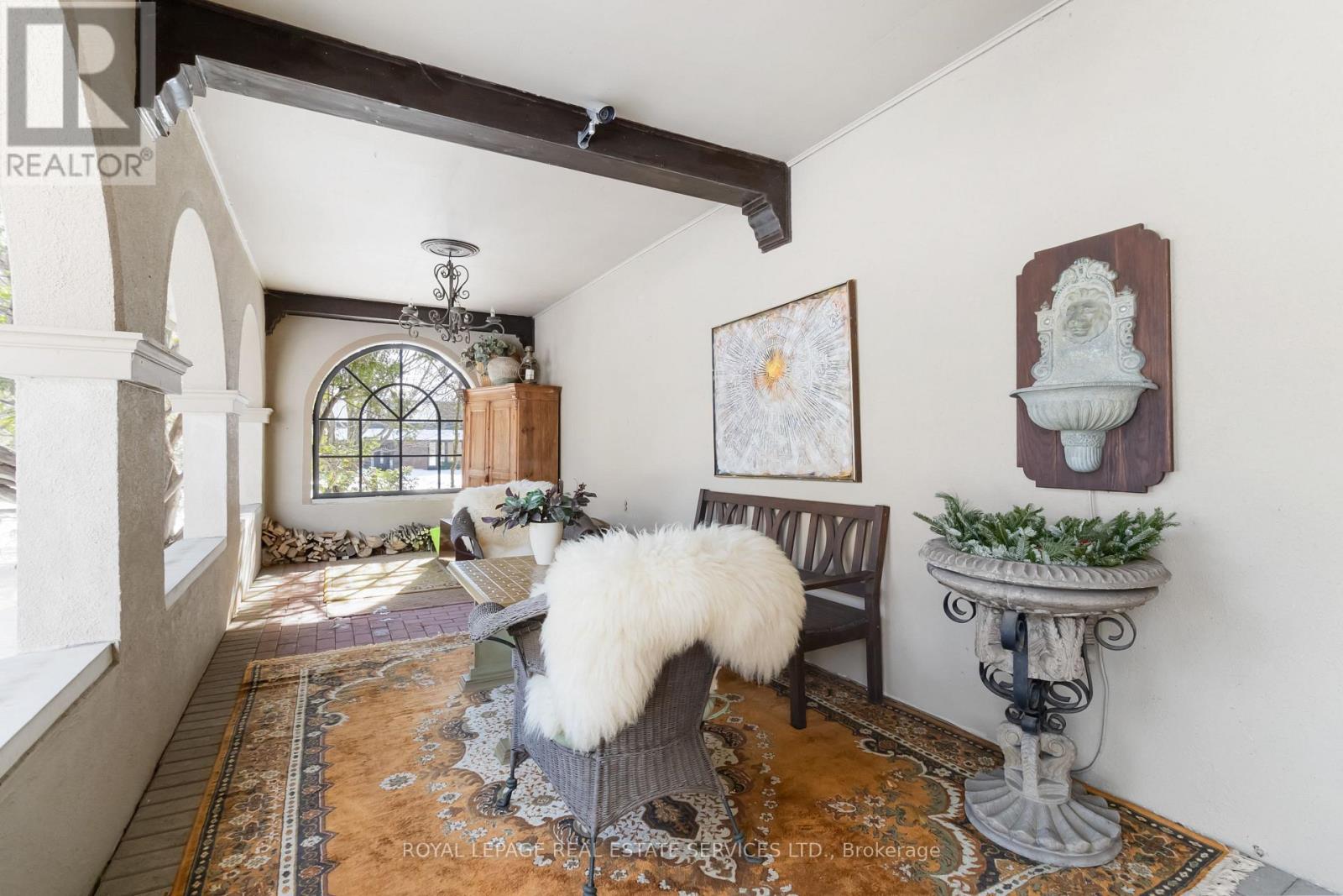 Welcome to 150 Cairncroft, a rare opportunity to own a distinctive property in one of Oakville's most coveted neighbourhoods. Nestled on a stunning 0.4 acre (17,416 sq ft) corner lot, this charming 3,052 sq ft residence is enveloped by mature trees and lush landscaping, offering the perfect blend of privacy and prestige. Set just steps from the lake and picturesque Gairloch Gardens, the location is unparalleled for those seeking an upscale lifestyle surrounded by nature, yet within easy reach of top-rated schools, downtown Oakville, major commuter routes & transit. Whether you're looking to move right in, renovate, or build your custom dream home (RL1-0 zoning), this property delivers exceptional potential. The existing home is rich in character and warmth with its Mediterranean-inspired façade and design, offering 4 bedrooms + den, and 2.5 bathrooms. The living room showcases exposed structural beams set amongst 1 of this home's 4 cozy fireplaces, lending a rustic allure and architectural interest. While the soaring two-storey foyer also offers captivating views of the inviting yet secluded courtyard-style patio - ideal for entertaining or relaxing under the canopy of greenery. Properties of this caliber and location are exceedingly rare. Don't miss your chance to secure a premium foothold in a neighbourhood known for luxury homes, timeless appeal, and rare public lakefront access only steps away! (id:4555)
