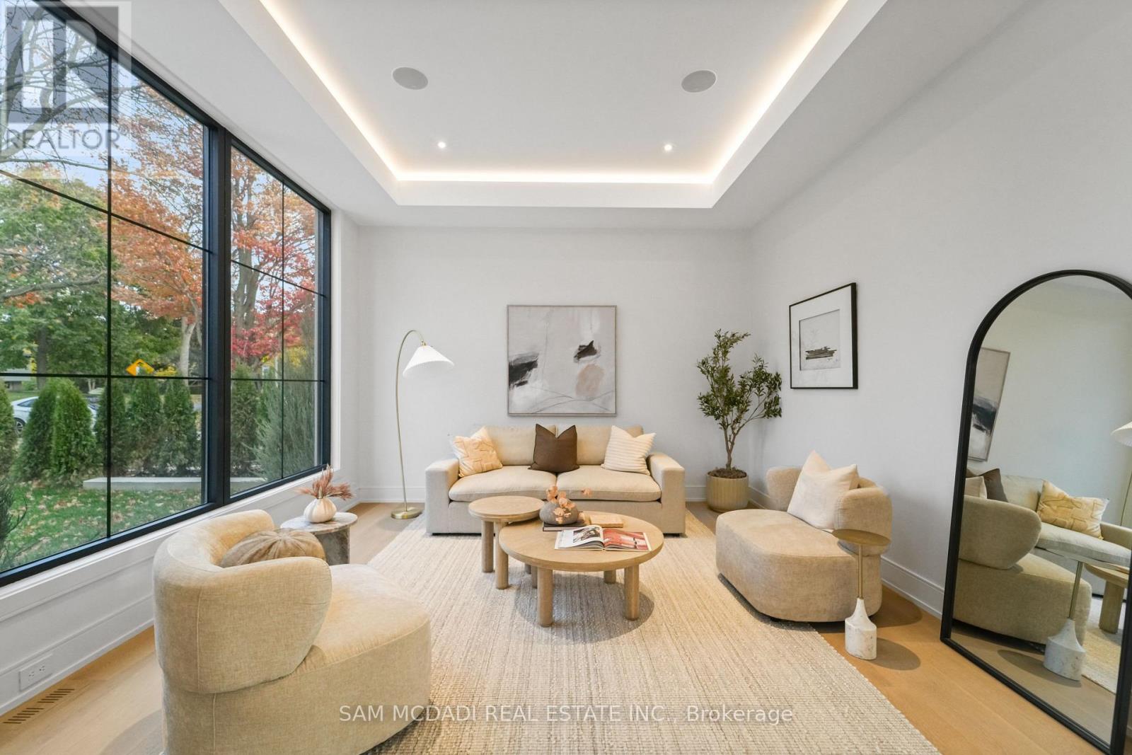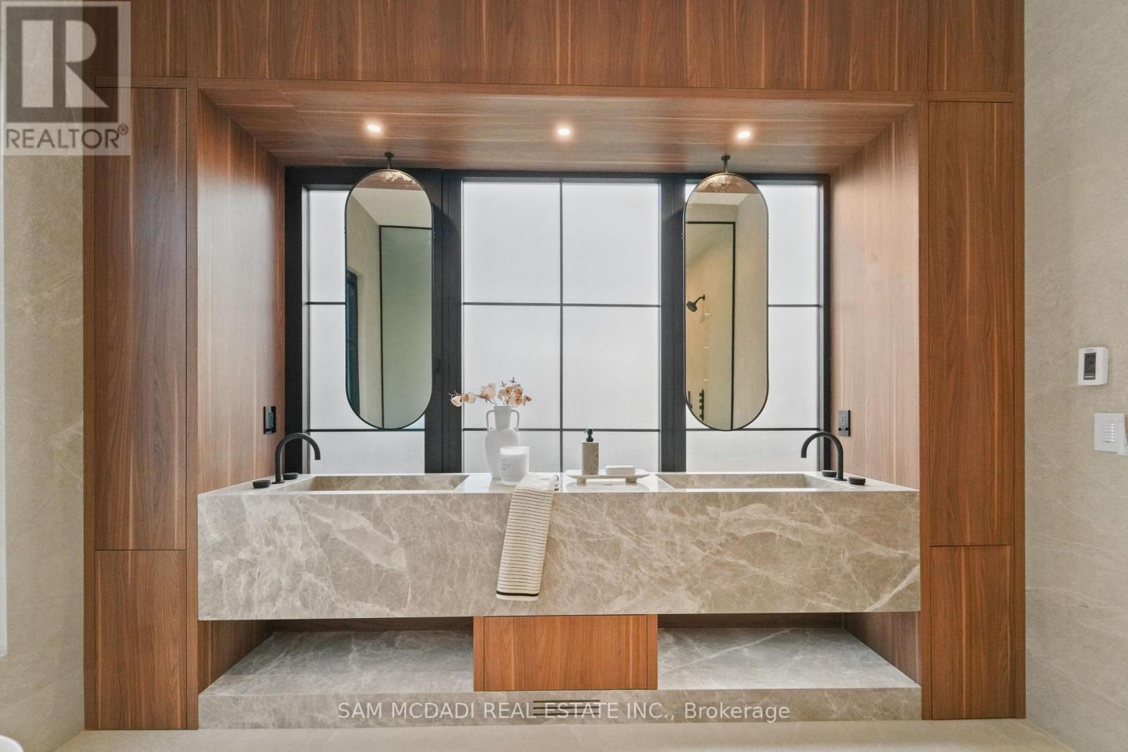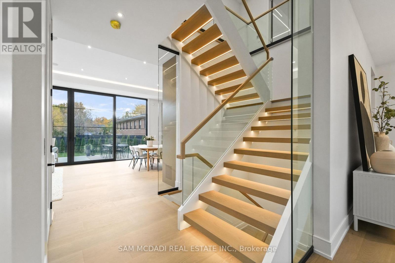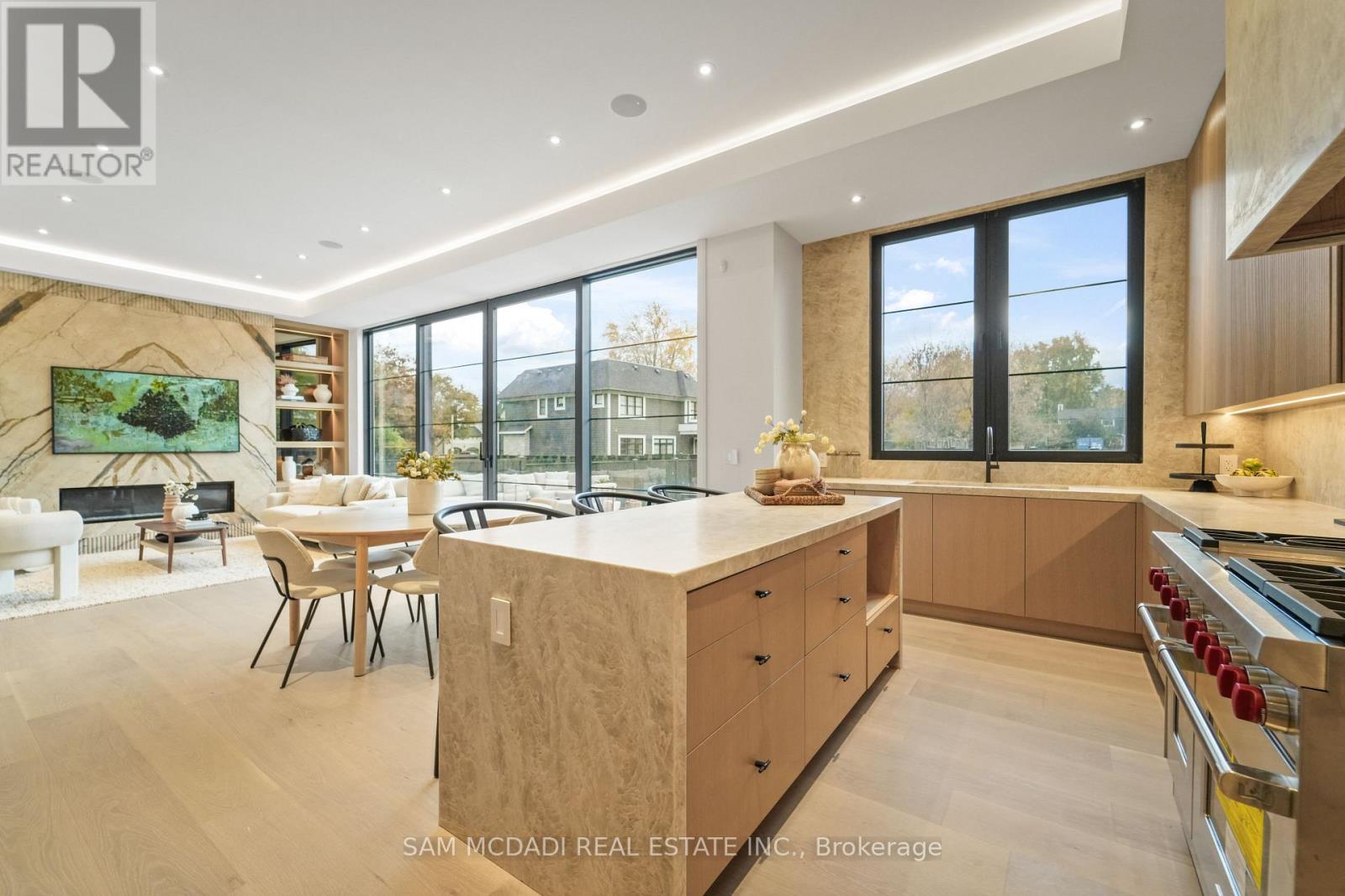Welcome to 152 Third Line, an architectural masterpiece in Oakville's prestigious Bronte neighbourhood. Set on a 75 x 140 ft lot, this newly built custom home offers over 5,500 sqft. across three levels, blending modern sophistication with timeless craftsmanship. The striking limestone stucco exterior with clean lines and expansive windows creates elegant curb appeal. Inside, a grand foyer with Taj Mahal marble flooring and brass inlay leads to light-filled living spaces with 9" white oak floors and a dramatic book-matched marble fireplace. Two kitchens impress: a show kitchen with Sub-Zero and Wolf appliances and oversized island, and a secondary chef's kitchen with bespoke cabinetry, Taj Mahal marble counters and matching backsplash. A solid oak staircase with glass railings and step lighting connects all three levels, complemented by a private elevator. The 641 sqft. primary suite features a meticulously crafted 5-star hotel-inspired ensuite and custom walk-in closet. Three additional bedrooms have private ensuites and built-in closets. Bathrooms are finished in a curated selection of exquisite marbles, with coordinating stone vanities and niches for a seamless, luxurious look. The finished lower level includes a home theatre, den, recreation room, home office, bar, and walk-out to the rear yard - perfect for entertaining or relaxing. Year-round comfort is ensured with a zoned HVAC system, heat pump, furnace, tankless water heater, HRV, humidifier, and smart thermostat. Control4 smart home integration, integrated audio, smart lighting, and security cameras provide effortless modern living. Outdoors, a 375 sqft. raised patio offers a stylish entertaining space or a private retreat. Sophisticated, functional, and beautifully executed, 152 Third Line redefines modern luxury in one of Oakville's most sought-after communities. (id:4555)