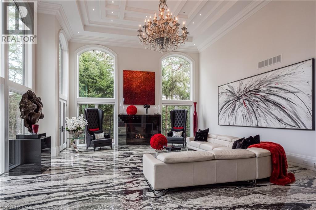 15 Chartwell Rd offers a lifestyle of unparalleled luxury.Drive through the gates & discover the grandeur of this palatial estate.South of Lakeshore,1 door from the lake on a half acre lot.Painstakingly curated, the contemporary limestone masterpiece you’ve been waiting for. Solid iron doors lead to a grand foyer revealing the opulent book matched marble floors.Floor to ceiling windows & French doors flood the house with light. Cascading waterfalls flank the hall.The Dining Room has statement lighting & servery making hosting a breeze.Soaring 18ft ceilings & a grand gas f/p are focal points of the Great Room,w/captivating views of the resort style yard.Experience culinary excellence in the black lacquer & glass kitchen by NEFF that features top of the line appliances & a B/I coffee machine & butlers pantry.The intimate Living Room w/ f/p is the ideal retreat.A main floor office w/built-in cabinetry.2 powder & 2 laundry rooms.The backyard oasis has a gunite pool,waterfalls,fire bowls,covered terrace & outdoor kitchen & f/p.The pool house has a change room,3-pc bath & servery.Towering trees surround the home & are positioned to create privacy.A stone driveway,circular fountain & lush gardens create a breathtaking landscape.Floating marble stairs divide the 3 levels of this home or, you can take the elevator.Skylights make the upstairs airy & bright.The principal suite has nearly 13ft ceilings, an exquisite 6-pc ensuite &2 walk-in closets. A private balcony overlooks the yard.3 add'l bedrms have 10-ft ceilings,private ensuites & walk-in closets.The LL caters to all family members.A 5th bedroom/ensuite makes an ideal guest suite.Gym,R/I Golf Simulator,home theatre,Wine Cellar & doggie Spa.The Games & Rec Rooms have a 2nd kitchen & walkout.Heated garage,baths & LL floors.Automation.Designed by Bill Hicks & features the artistic creativity of the KT Design Group. Located on Oakville’s Street of Dreams,this is an iconic living space designed to impress. LUXURY CERTIFIED (id:4555)