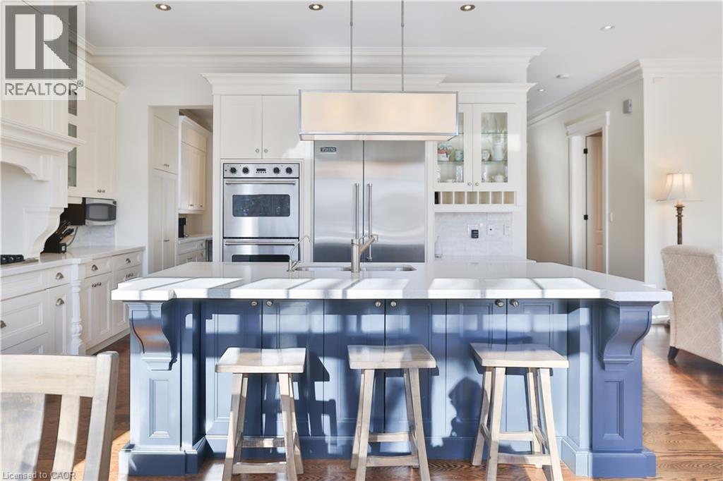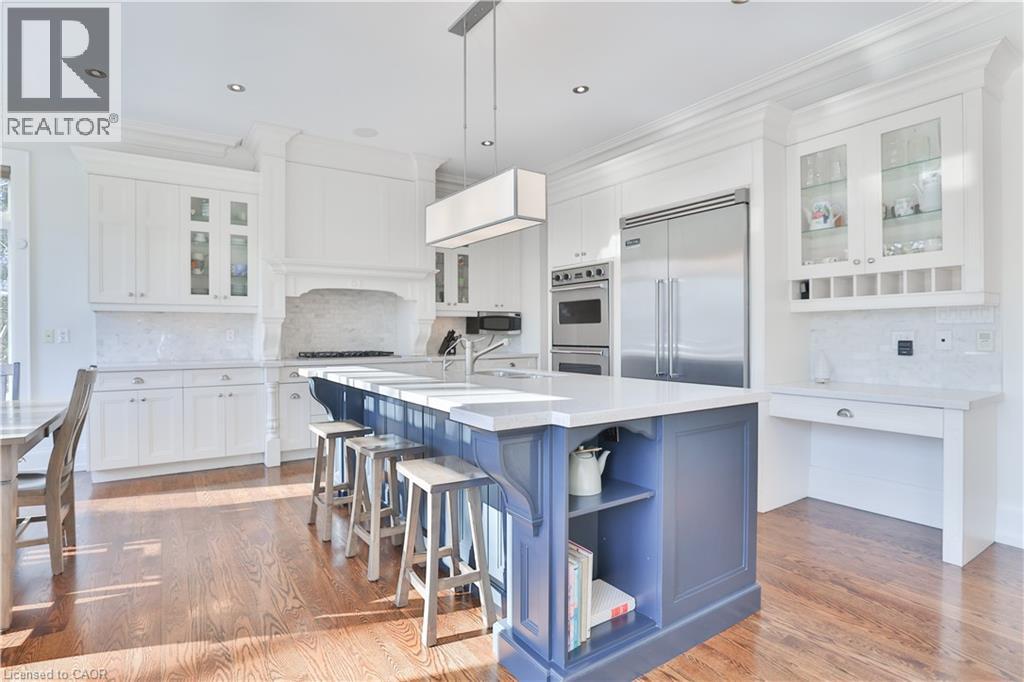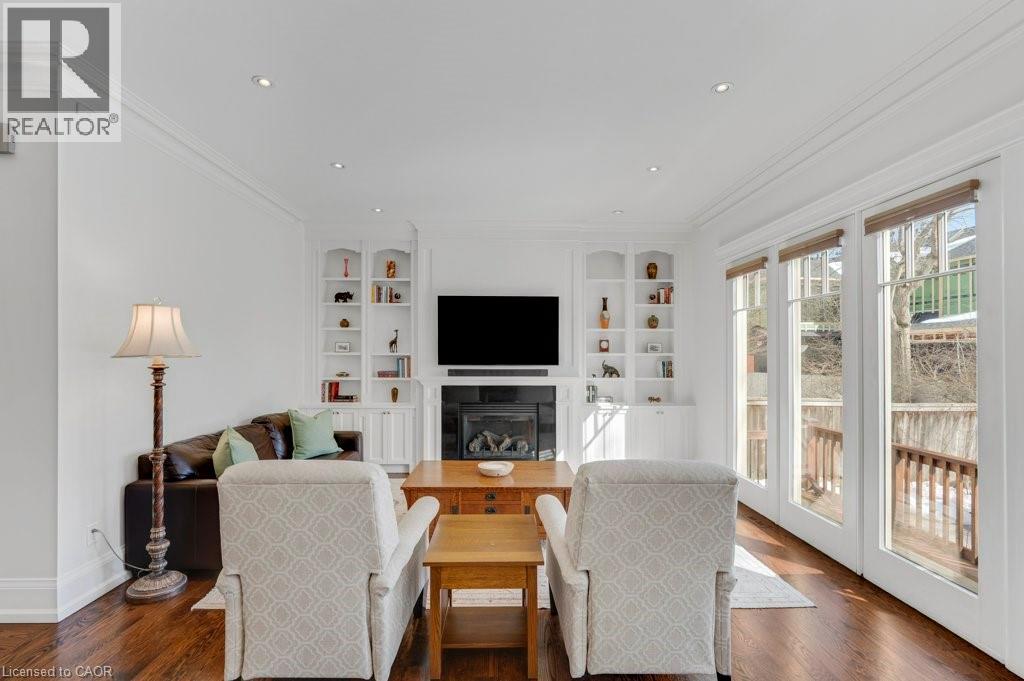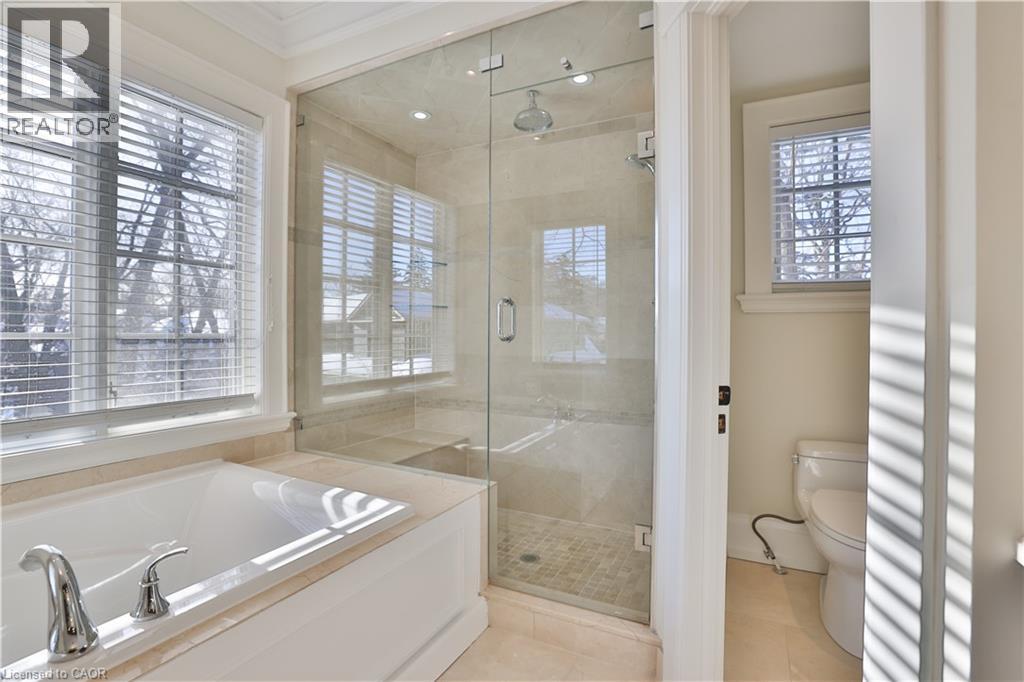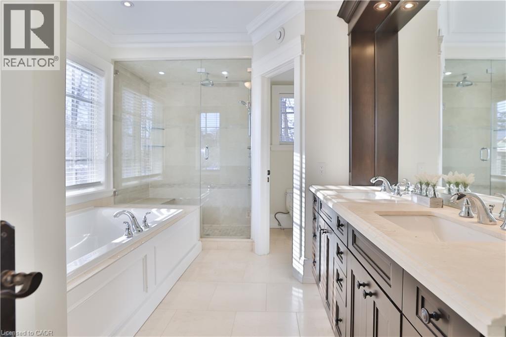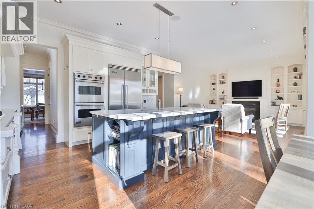 One of the best locations in old Oakville! This exceptional custom home on a quiet side street features a bright freshly painted interior with 10' main floor ceilings, crown mouldings, 3 gas fireplaces, a Control4 full house hard wired entertainment system, elevator rough-in, and site-finished oak hardwood throughout. The main floor features an bright open-concept kitchen, breakfast, and family room area with a full wall of windows overlooking the backyard. The chef’s kitchen has quartz counters, a large centre island, premium cabinetry, and Viking Professional appliances. The family room has a gas fireplace with built-in bookcases. A butler’s pantry with wine fridge and sink leads to the separate dining room finished with a coffered ceiling. The main floor mudroom offers garage access with built-in closet and storage. A powder room completes this level. The second level features 9' ceilings, a bright skylit hallway, laundry with built-ins, and 4 generously sized bedrooms. The spacious primary suite features a gas fireplace, walk-in closet, and spa-inspired ensuite. The lower level has 9' ceilings, radiant floor heating, oversized windows, a separate entrance, recreation room with built-ins, gas fireplace and wet bar. A fifth bedroom, 3-piece bath, cold room, and additional storage complete this level. A private low maintenance backyard has a south facing view which extends a full city block. It is fully landscaped with mature plantings and quality hardscaping (id:4555)