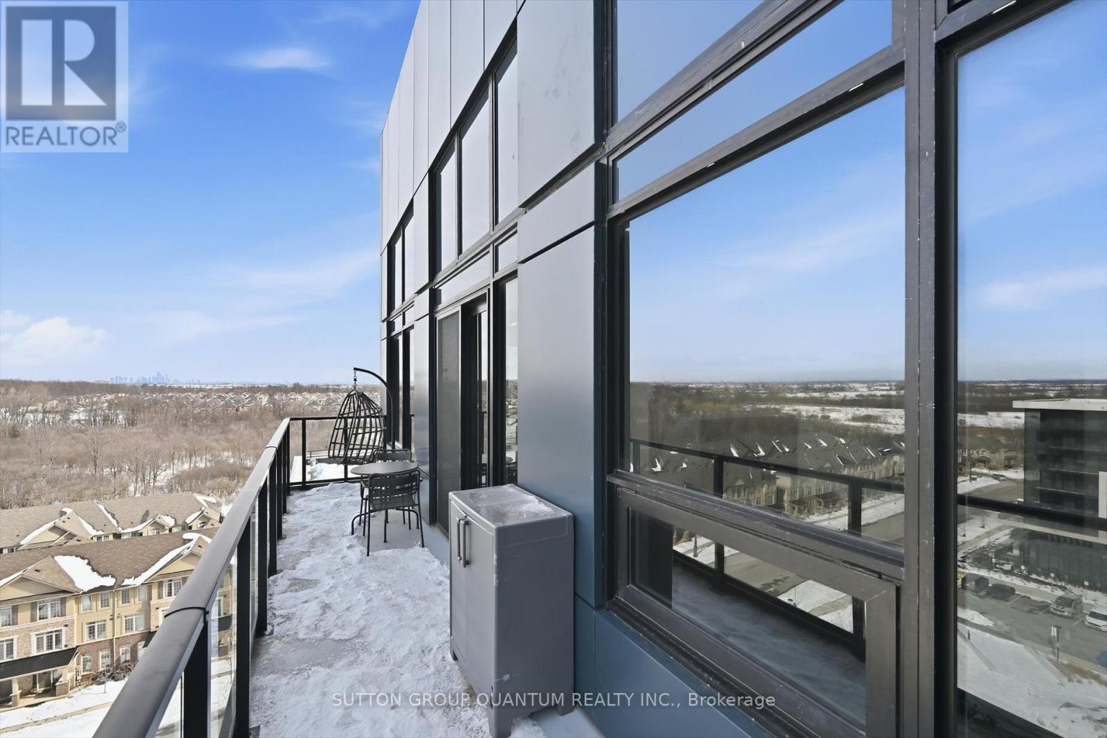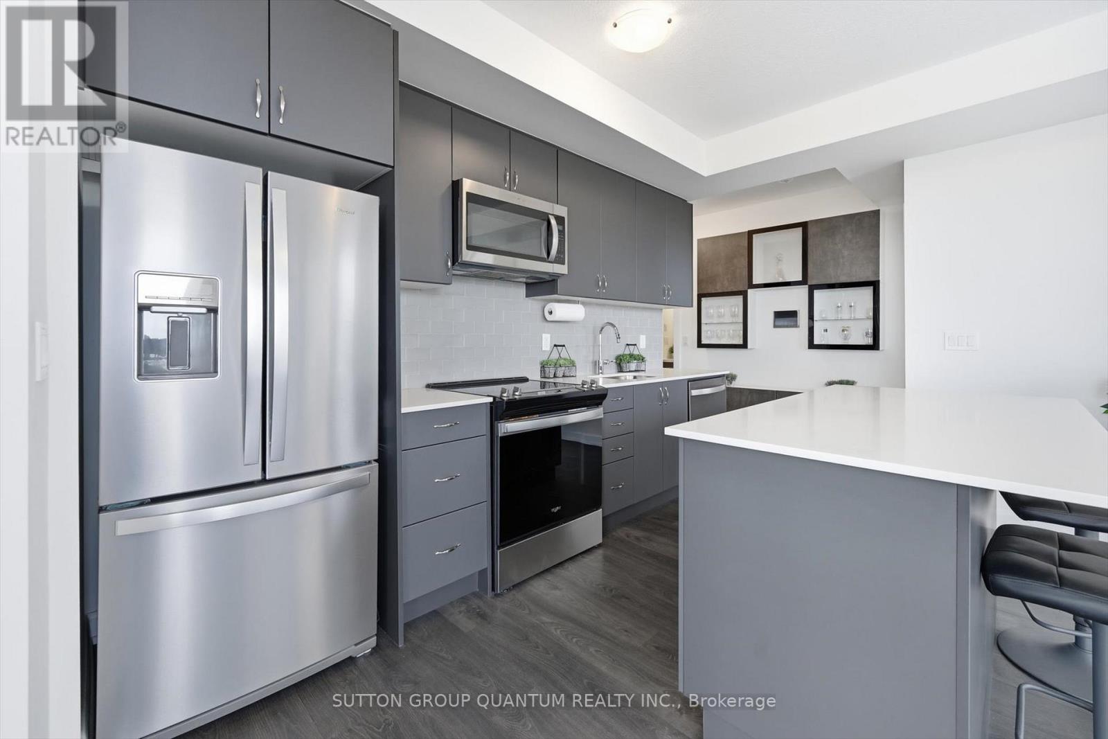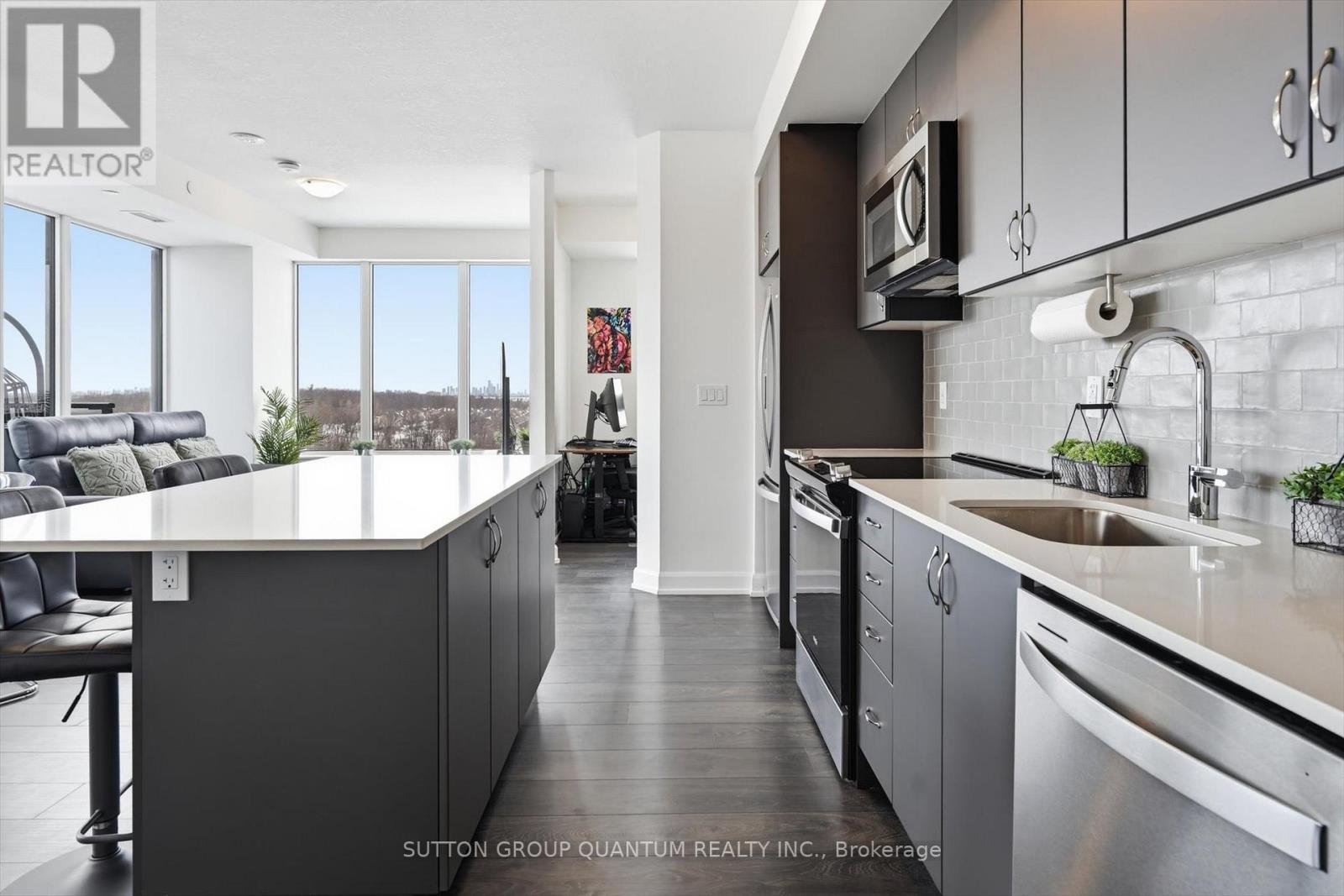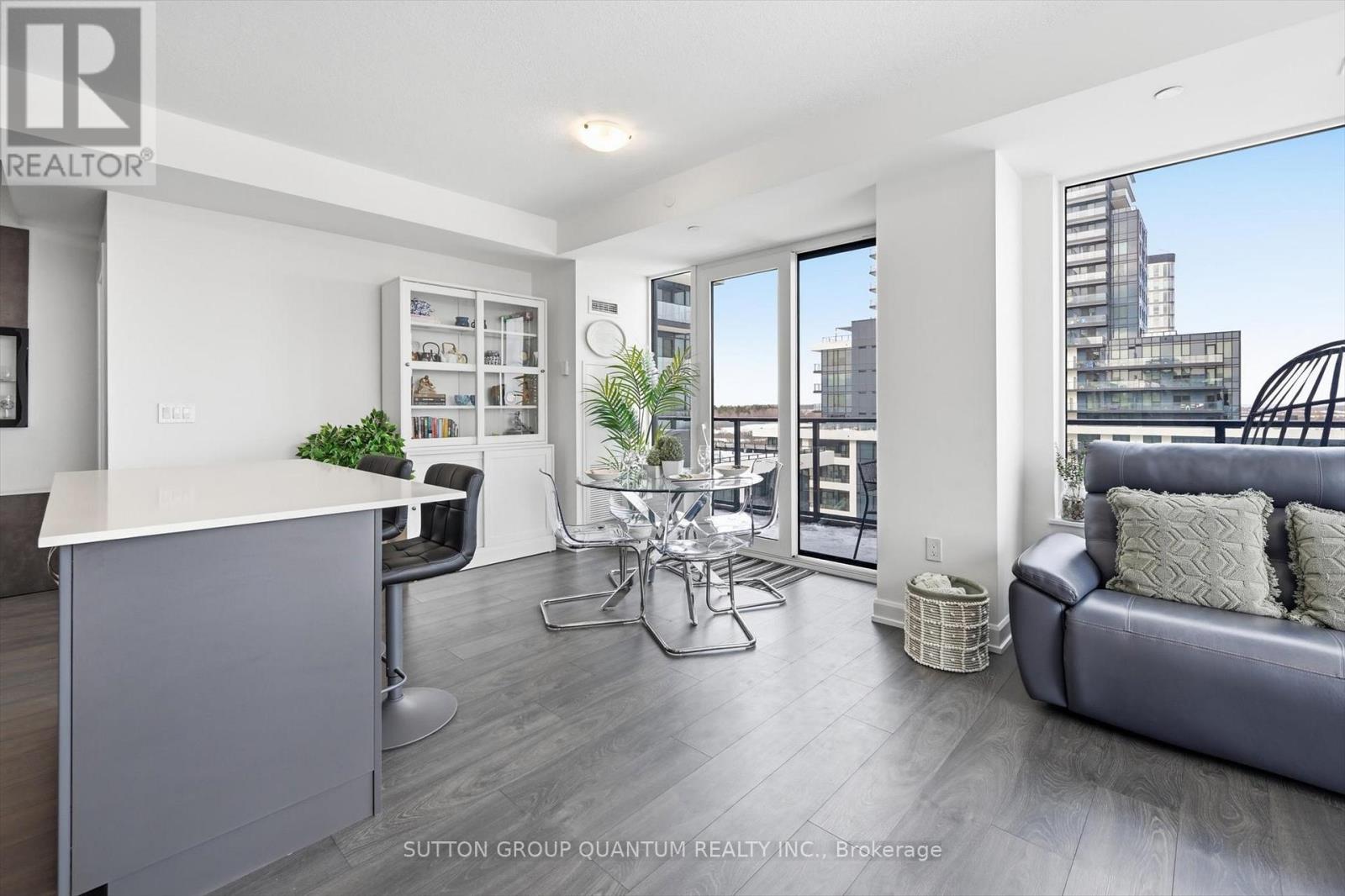 Finally!.. A top-suite, corner unit with (rare) dining room space... and on the quiet side of the building! Top 7 Reasons to Buy #1004: 1. Proper dining area; Finally a condo where you can actually entertain guests with a nice sit-down dinner. 2. This top floor location has no one above and only one next door neighbour; + 9ft ceilings. That combined with being on the quiet East facing side of the building makes it arguably the most peaceful and serene you can find! 3. Experienced condo buyers make light a priority, and 1004 gets so much light you feel like you're outside! 4. The view is what makes a condo special, And a Corner unit with unobstructed skyline views throughout the main living space and the den is rarely offered like this. 5. The Upper West Side Condos (by Branthaven) is known for its gorgeous common areas, high-end amenities, and central location; Concierge, secure automated parcel management, fitness centre with yoga studio, communal office spaces with a meeting room, upscale rooftop BBQ terrace with a fancy party room, pet spa and plenty of visitor parking. Lastly, the geothermal heating and cooling means eco friendly living with cost-savings. 6. Sought-after Joshua Meadows Location! Conveniently located near all major amenities and yet strategically tucked away; Minutes from Oakville's New State-of-the-art hospital, 407 and QEW. Walk 10 min to Oakville's main plaza, anchored by Walmart/Superstore, Starbucks and many restaurants and shops; also Buttonbush Woods Park is just around the corner. 7. 100% move-in-ready with top-quality finishes including the trendy open concept grey kitchen with a matching backsplash of hand-made style tile, quartz counters, full-size stainless-steel appliances, island upgrade, and matching extra storage built-ins. The bathroom includes an extra wide vanity with a chrome faucet, and congruent greys throughout the cabinets, flooring and shower tile; $10,000 of builder upgrades. Book this rare "one of one" before it's gon (id:4555)