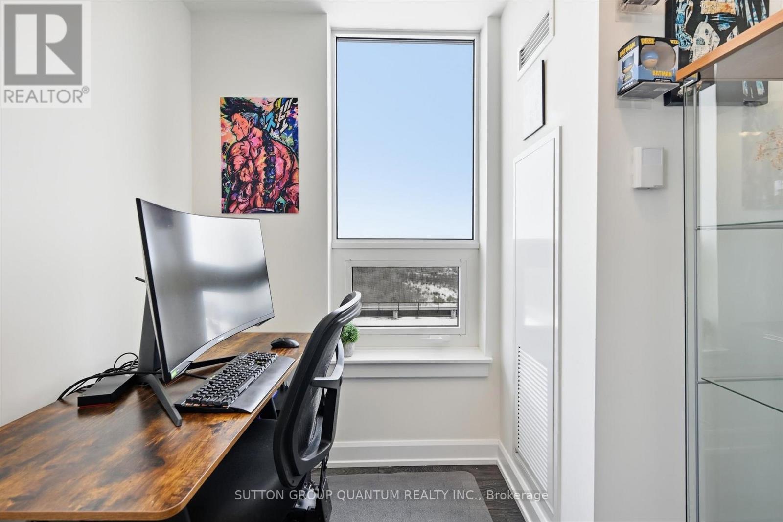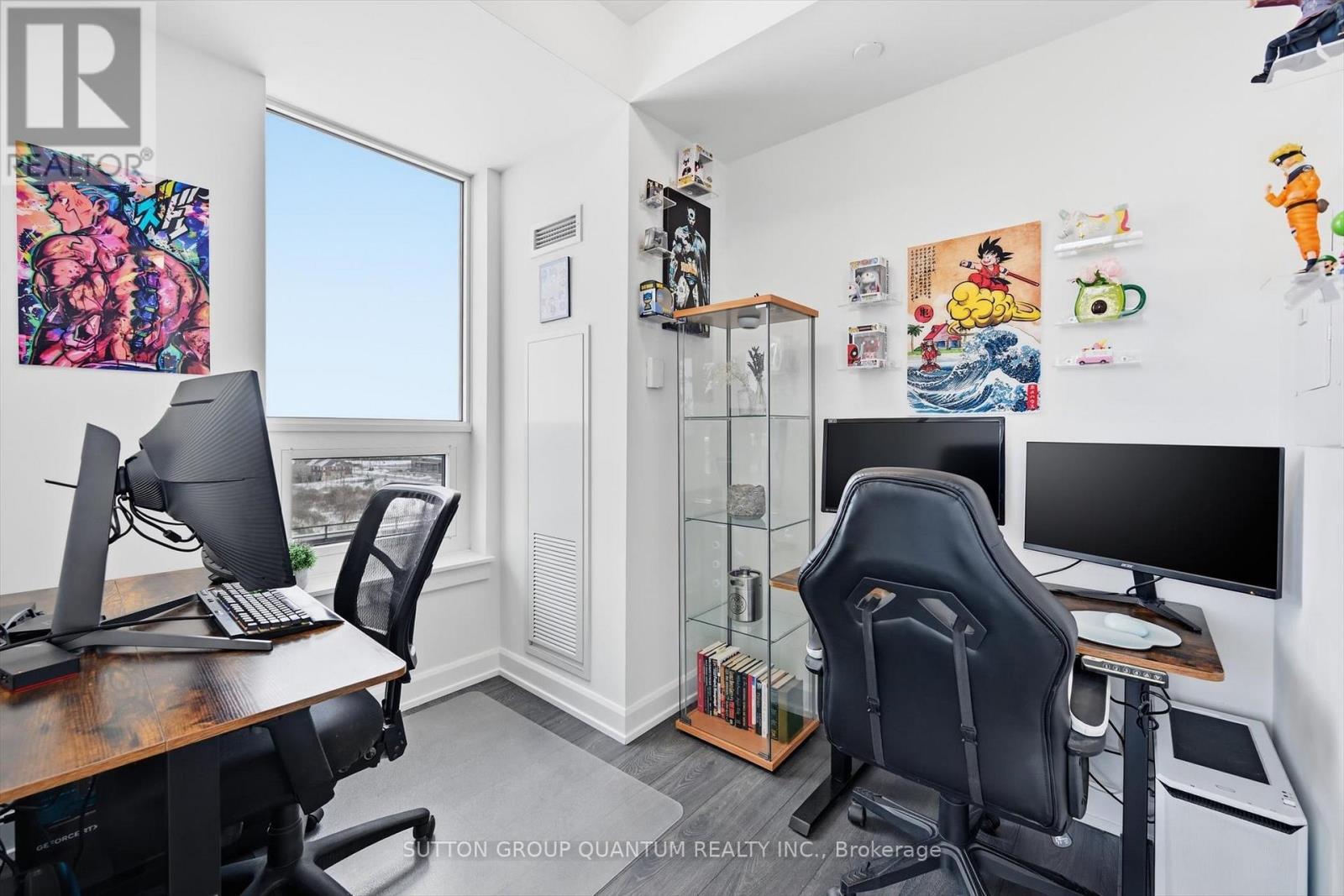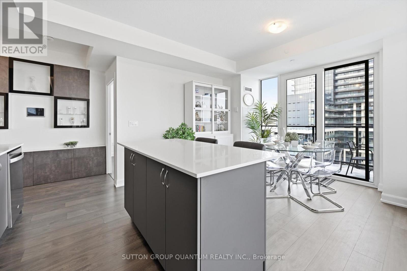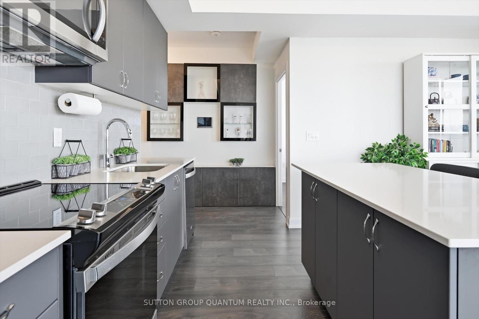 Finally!.. A top-suite, corner unit with (rare) dining room space... and on the quiet side of the building! Top 7 Reasons to Buy #1004: 1. Proper dining area; Finally a condo where you can actually entertain guests with a nice sit-down dinner. 2. This top floor location has no one above and only one next door neighbour; + 9ft ceilings. That combined with being on the quiet East facing side of the building makes it arguably the most peaceful and serene you can find! 3. Experienced condo buyers make light a priority, and 1004 gets so much light you feel like you're outside! 4. The view is what makes a condo special, And a Corner unit with unobstructed skyline views throughout the main living space and the den is rarely offered like this. 5. The Upper West Side Condos (by Branthaven) is known for its gorgeous common areas, high-end amenities, and central location; Concierge, secure automated parcel management, fitness centre with yoga studio, communal office spaces with a meeting room, upscale rooftop BBQ terrace with a fancy party room, pet spa and plenty of visitor parking. Lastly, the geothermal heating and cooling means eco friendly living with cost-savings. 6. Sought-after Joshua Meadows Location! Conveniently located near all major amenities and yet strategically tucked away; Minutes from Oakville's New State-of-the-art hospital, 407 and QEW. Walk 10 min to Oakville's main plaza, anchored by Walmart/Superstore, Starbucks and many restaurants and shops; also Buttonbush Woods Park is just around the corner. 7. 100% move-in-ready with top-quality finishes including the trendy open concept grey kitchen with a matching backsplash of hand-made style tile, quartz counters, full-size stainless-steel appliances, island upgrade, and matching extra storage built-ins. The bathroom includes an extra wide vanity with a chrome faucet, and congruent greys throughout the cabinets, flooring and shower tile; $10,000 of builder upgrades. Book this rare "one of one" before it's gon (id:4555)