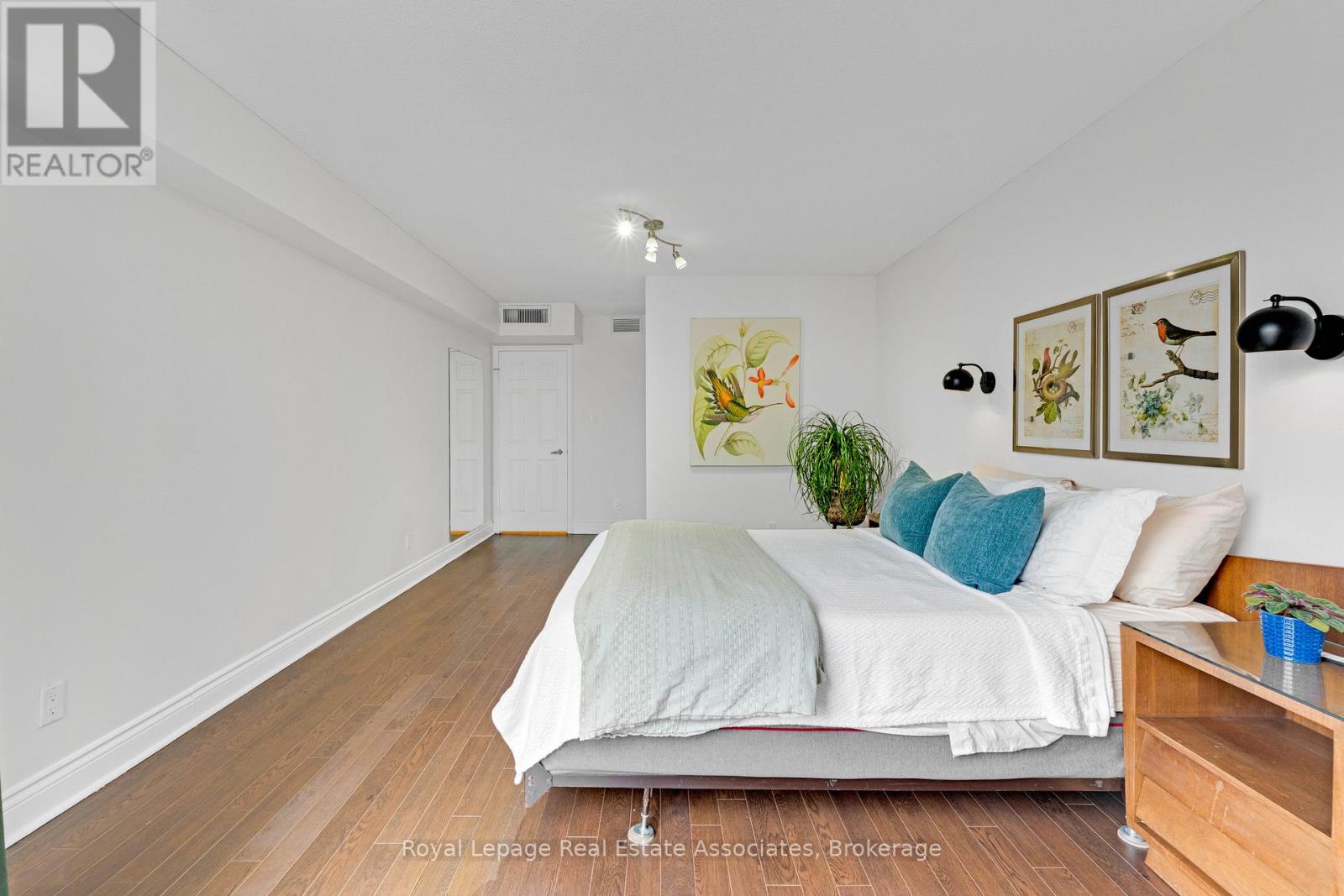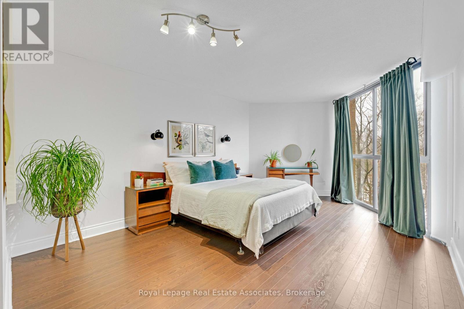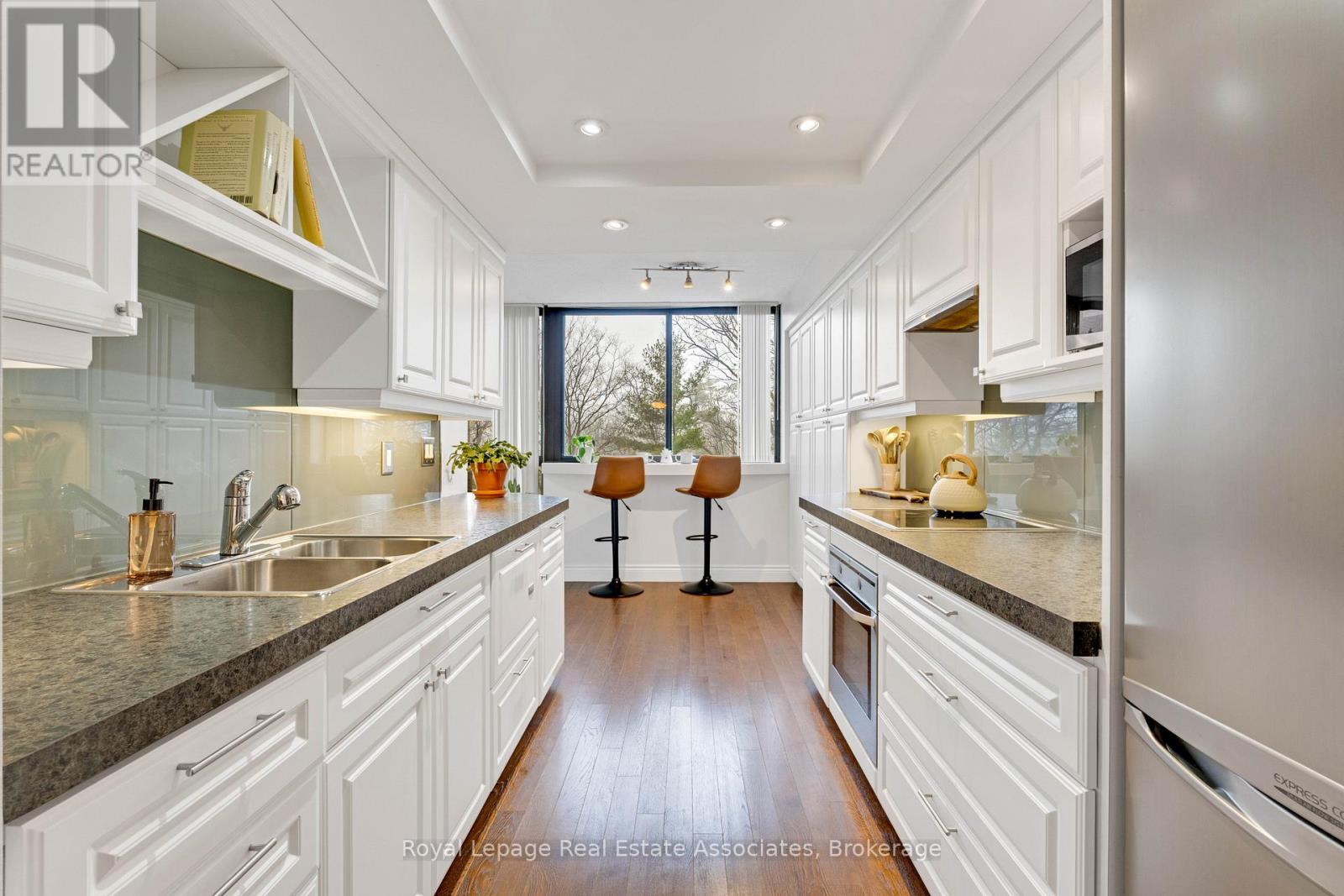 Stunning Ravine Views & Modern Comfort Await! Wake up every day to breathtaking vistas through dramatic floor-to-ceiling windows in this bright and spacious one-bedroom suite, offering over 900 sq. ft. of beautifully updated living space. The open-concept living and dining area is bathed in natural light and features a built-in bookcase with an electric fireplace, creating a cozy and stylish focal point. The updated kitchen flows seamlessly into the main living space and includes a breakfast bar-perfect for morning coffee with ravine views or entertaining guests. The generous primary bedroom easily accommodates a king-size bed and includes a walk-in closet for ample storage. The monthly condo fee of $873.89 covers building insurance, common elements, water, cable, high-speed internet, and parking, providing exceptional value. Residents enjoy fantastic amenities, including an indoor pool (currently under renovation), a fully equipped fitness centre, sauna, and party room. Ideally located close to the GO Train, QEW, and public transit, and just minutes to Sheridan College and Oakville Place, this suite offers the perfect combination of comfort, convenience, and serene ravine living. (id:4555)