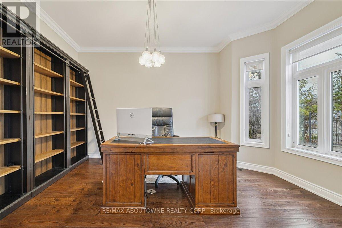 Welcome to this exceptional home in the heart of sought-after West Oakville, where timeless design meets modern comfort. Discover refined living, where elegance, space, and privacy come together on a premium lot with gated driveway, double car garage & landscaped front & back yards. This large home offers an ideal balance, perfect for both executive entertaining & a family home. An impressive cathedral-ceiling entrance with stunning chandelier fills the home with natural light & creates a grand first impression. The main floor features a spacious open-concept living area that offers elegant finishes & seamless flow throughout. The large gourmet kitchen with wine & bar fridge, & space for a large kitchen table for those informal get togethers is a home chef's delight. Family room, with gas fireplace and built-in bookshelves, can be closed off with large French doors. Separate dining & living rooms for more formal entertaining. A large main floor office, walk-in closet, powder room & mud room with access to the attached double car garage complete this level. The second floor delivers comfort & privacy for family members & guests alike. The primary bedroom has ample storage with beautifully designed built-in closets, a separate walk-in closet & 5-pc ensuite. Each bedroom is generously sized. Two bedrooms share a 5-pc ensuite & the 4th bedroom offers a 4-pc ensuite & walk-in closet. The beautifully finished walk-out basement provides incredible versatility, complete with in-law suite capability, good size bedroom with large walk-in closet, 3-pc bath, entertaining area, & kitchenette, ideal for multi-generational living, extended family, or potential income opportunities. Located in one of Oakville's most desirable neighbourhoods, close to top-rated schools, parks, lakefront trails, Walmart, Metro, LCBO & QEW, this home offers the perfect blend of luxury, functionality, & lifestyle. A rare opportunity in West Oakville - don't miss your chance to call it home. (id:4555)