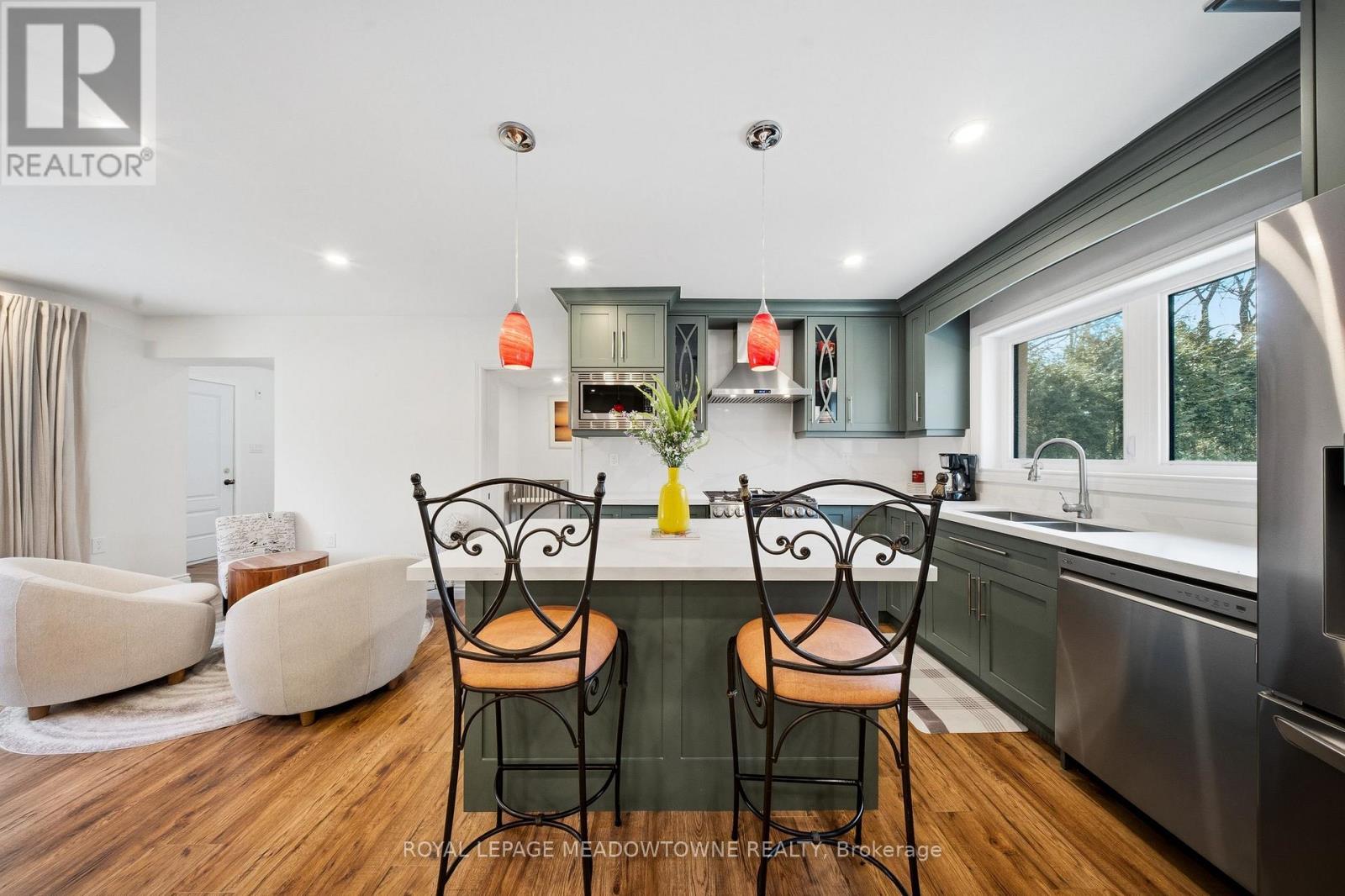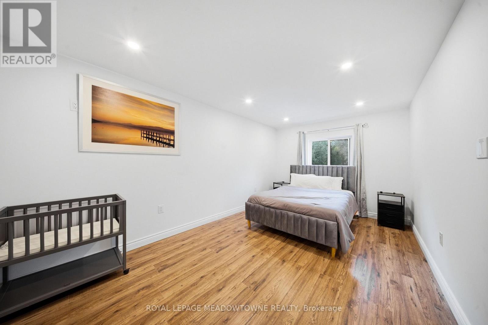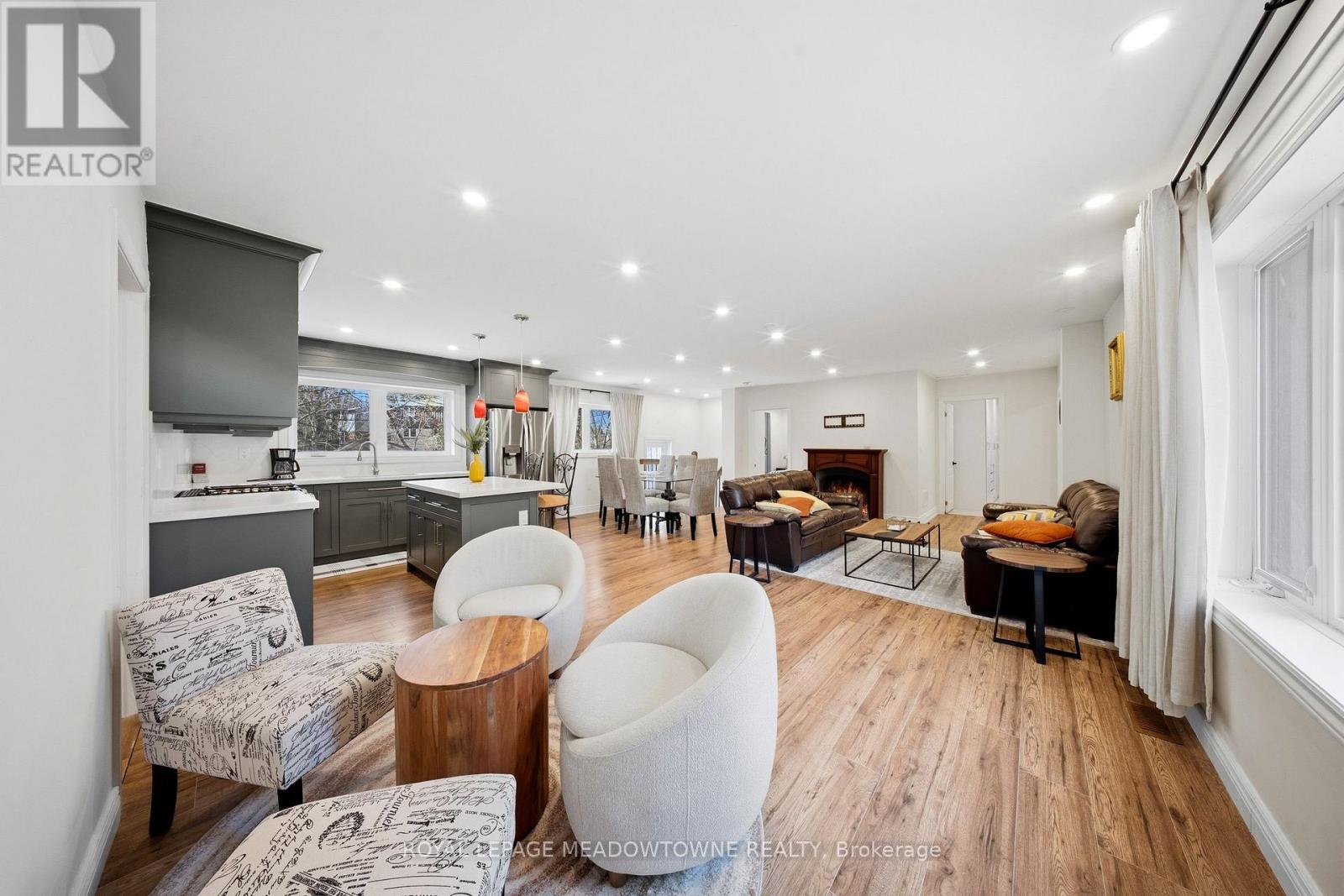 Beautifully renovated bungalow in prestigious community of Oakville. A private foyer welcomes you into the open-concept main living space, featuring a custom kitchen with quartz countertops and backsplash, centre island, and high-end stainless steel appliances. The kitchen overlooks the bright living and dining areas, highlighted by large windows and pot lights. The primary bedroom offers a walk-in closet and a private ensuite bathroom. Two additional bedrooms and a full bathroom complete the main level. The finished basement features a spacious recreation room with wet bar, pot lights, bright windows, and a second fireplace. A bonus bedroom, 3-piece bathroom, and finished laundry room add functionality and flexibility to the space. Enjoy the private backyard with a large patio and gazebo, surrounded by mature trees and backing onto a wooded ravine for added privacy. (id:4555)