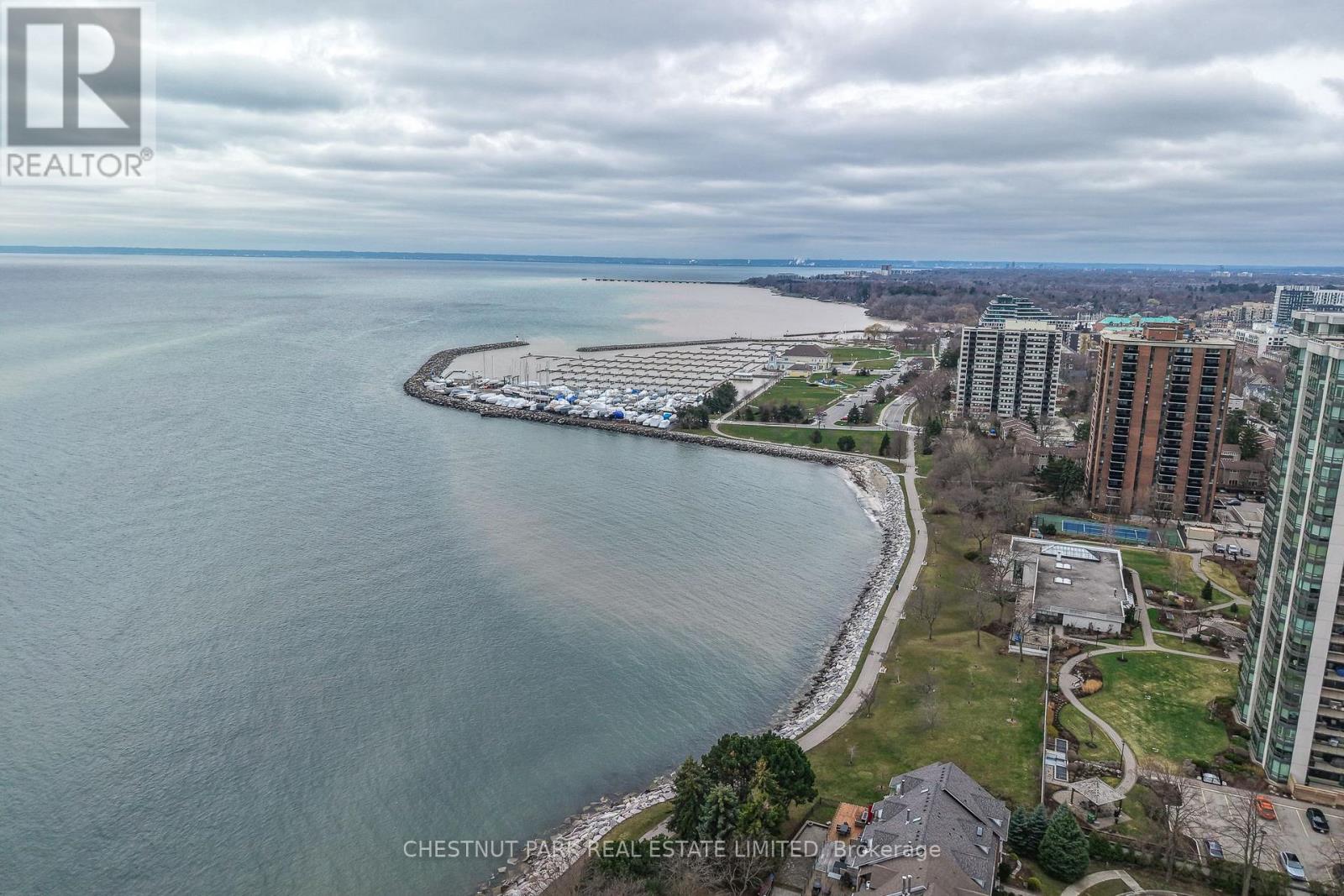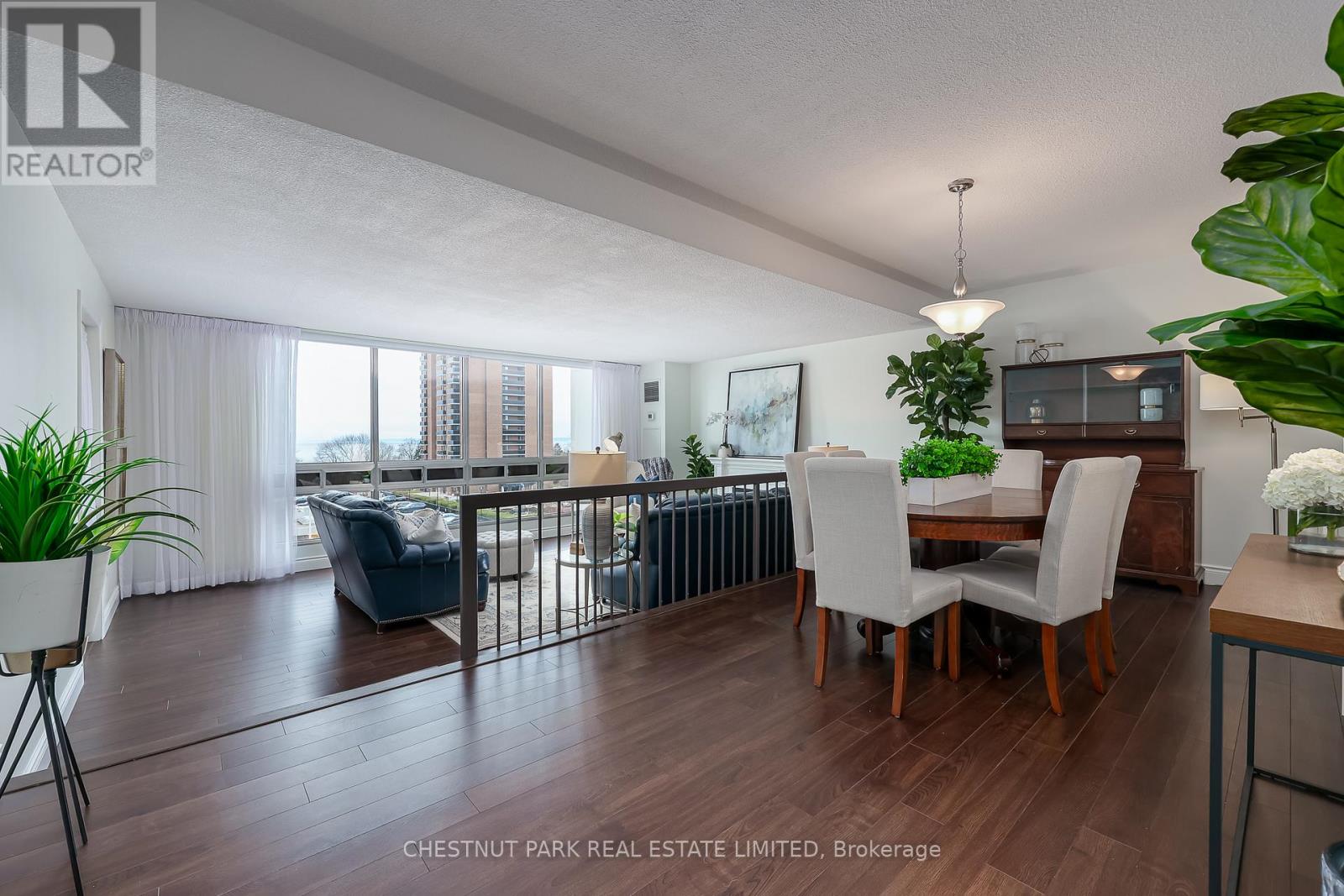 Enjoy captivating views of Lake Ontario from every room in this bright and spacious 2-bedroom + den residence in the highly desirable Ennisclare on the Lake community. Offering over 1,500 sq. ft. of well-designed living space plus a large private balcony, this condo provides a relaxed and effortless lakeside lifestyle. Expansive windows fill the home with natural light and hardwood floors extend throughout the home, enhancing its elegance and flow. The spacious dining area flows seamlessly into the living room and features a walkout to the balcony - perfect for enjoying fresh air and lake views. The updated kitchen with breakfast area provides style and functionality for everyday living.The primary bedroom is a private retreat, complete with a sunken sitting area, double closets, and an ensuite with a walk-in shower. The second bedroom and versatile den offer flexible space for guests, a home office, or family. Ensuite laundry with additional storage, makes this home as practical as it is inviting. Residents enjoy an impressive range of amenities, including an indoor pool, exercise room, sauna, lounge and library, party room, billiards, indoor golf range, squash court, woodworking shop, paint room, games room, and a variety of social activities. Outdoor features include tennis/pickleball court and visitor parking. All-inclusive condo fees cover heat, hydro, water, cable, building insurance & maintenance; ensuring truly effortless living. Includes one parking space and one locker. Ideally located just steps from the waterfront, Bronte Harbour, shops, and dining, this well-managed building offers an exceptional lifestyle in a private lakeside setting. (id:4555)