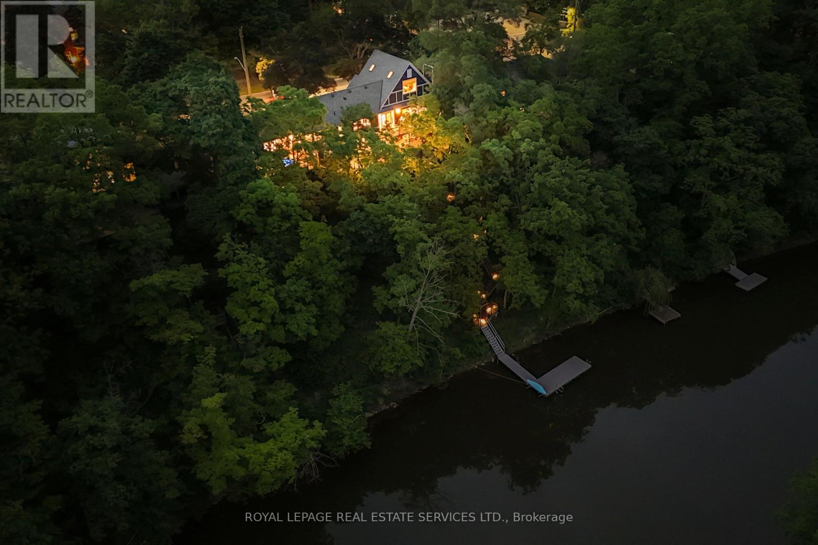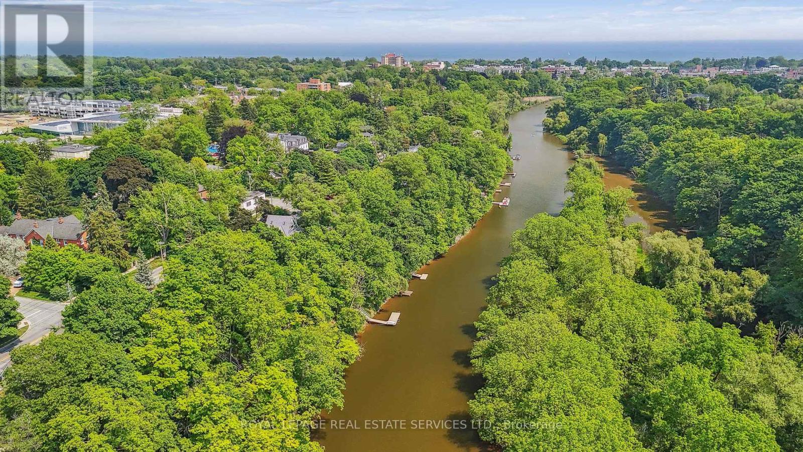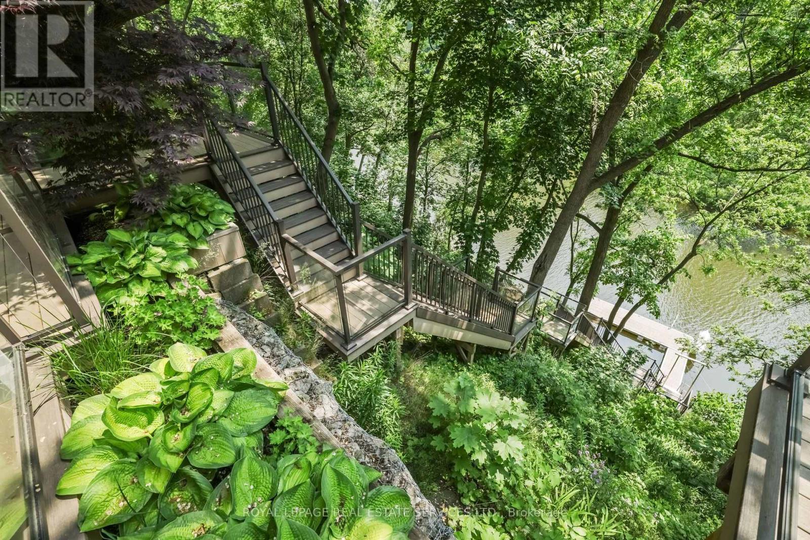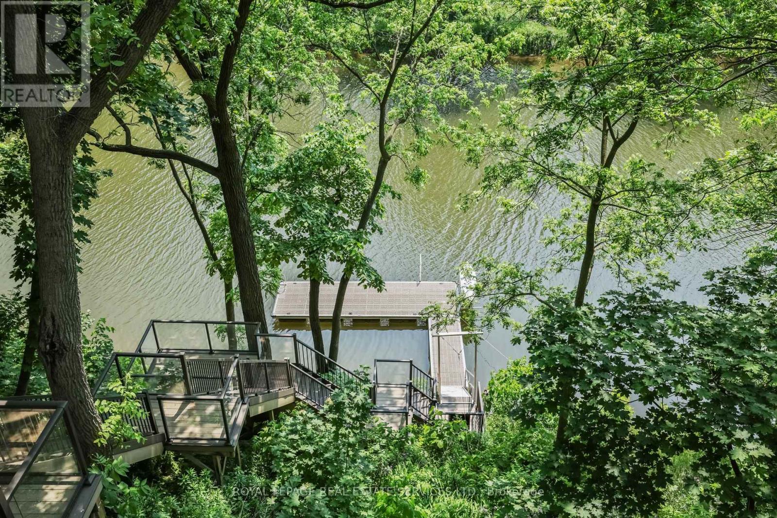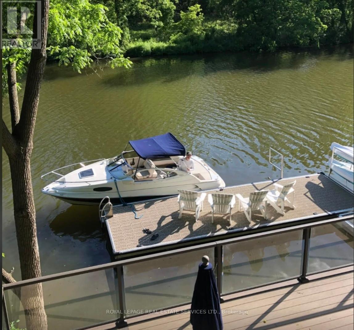 Private, elevated, and unlike anything else in Old Oakville - A true four-season outdoor retreat, your private playground for the outdoor enthusiast-where each day invites skating, paddling, kayaking, hiking, fishing, boating and cross-country skiing, alongside wildlife watching and refined al fresco dining, embracing nature in all its seasons. This lofted waterfront residence commands breathtaking views and unmatched privacy along the tranquil 16 Mile Creek. A testament to craftsmanship and design, this waterfront retreat boasts exclusive riparian rights and a private dock, inviting you to embrace the beauty of Oakville's scenic waterways year-round. .A meticulous 2016 renovation elevated this residence with rich hand-scraped oak floors, solid wood doors, custom millwork, and elegant tray ceilings. The sprawling 1,700 sq. ft. premium Wolf PVC deck includes a hot tub oasis, integrated fire table, and motorized awnings, leading to a dock with a kayak launch, swim ladder, and floating dock. Glass-encased staircases on helical piers deliver striking architectural presence and unbroken sight lines to the creek. Inside, sophistication defines every detail. Floor-to-ceiling windows in the living room frame stunning ravine views and dramatic sunsets, while a gas fireplace with a live-edge mantel adds warmth. The chef's kitchen impresses with a leathered Taj Mahal quartzite island, Wolf and Miele appliances, and an integrated Sub-Zero fridge. Heated floors run throughout, including in the spa-like primary ensuite with marble floors, a rain shower, and double vanity. The lower level offers a linear fireplace, built-in bar, and walkout to the deck. A concrete-lined storage room playfully known as the Bomb Shelter provides additional functionality. Blending natural beauty, refined design, and year-round outdoor living, this one-of-a-kind property is just steps to downtown Oakville and the GO Train offering luxury, serenity, and convenience in equal measure. (id:4555)