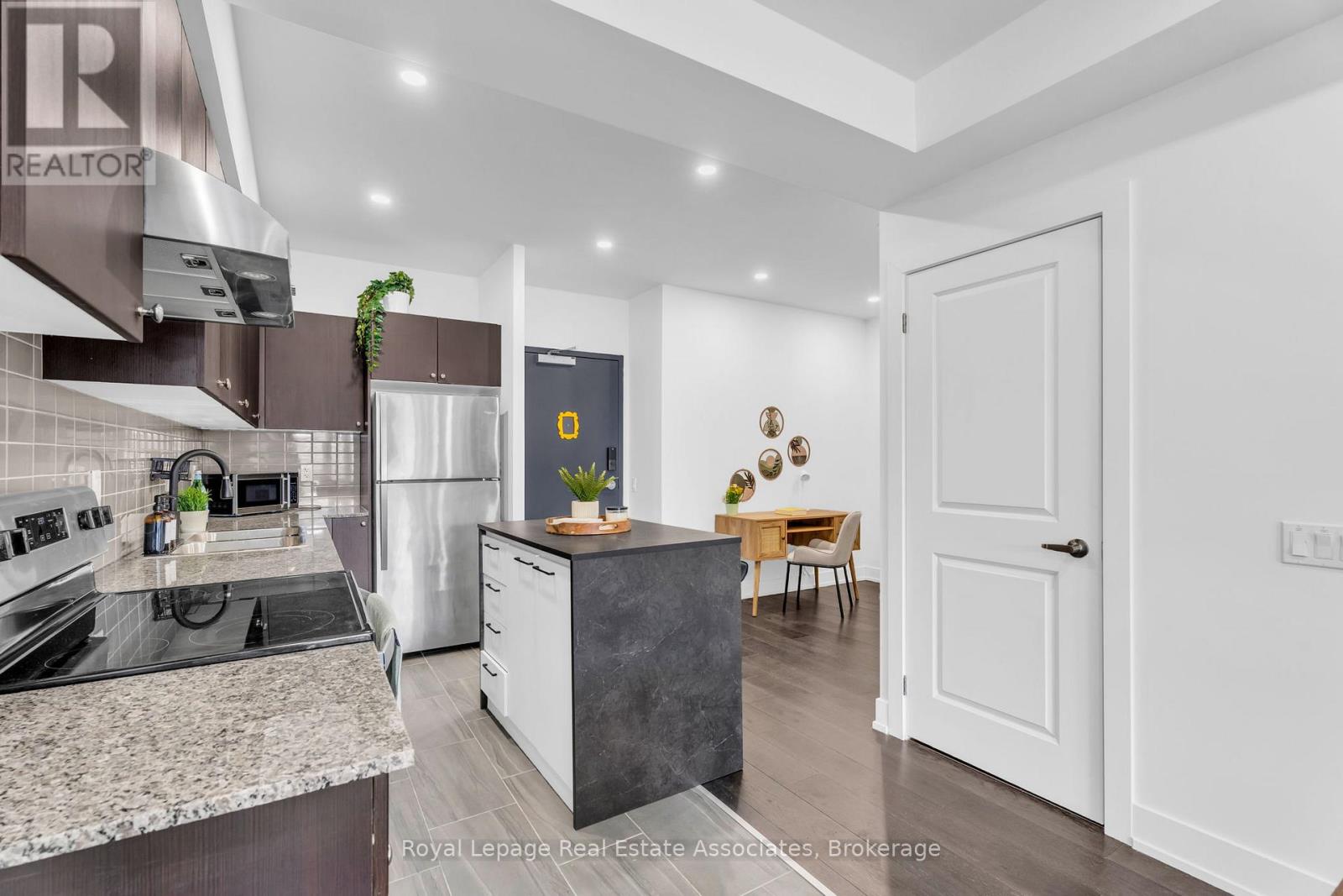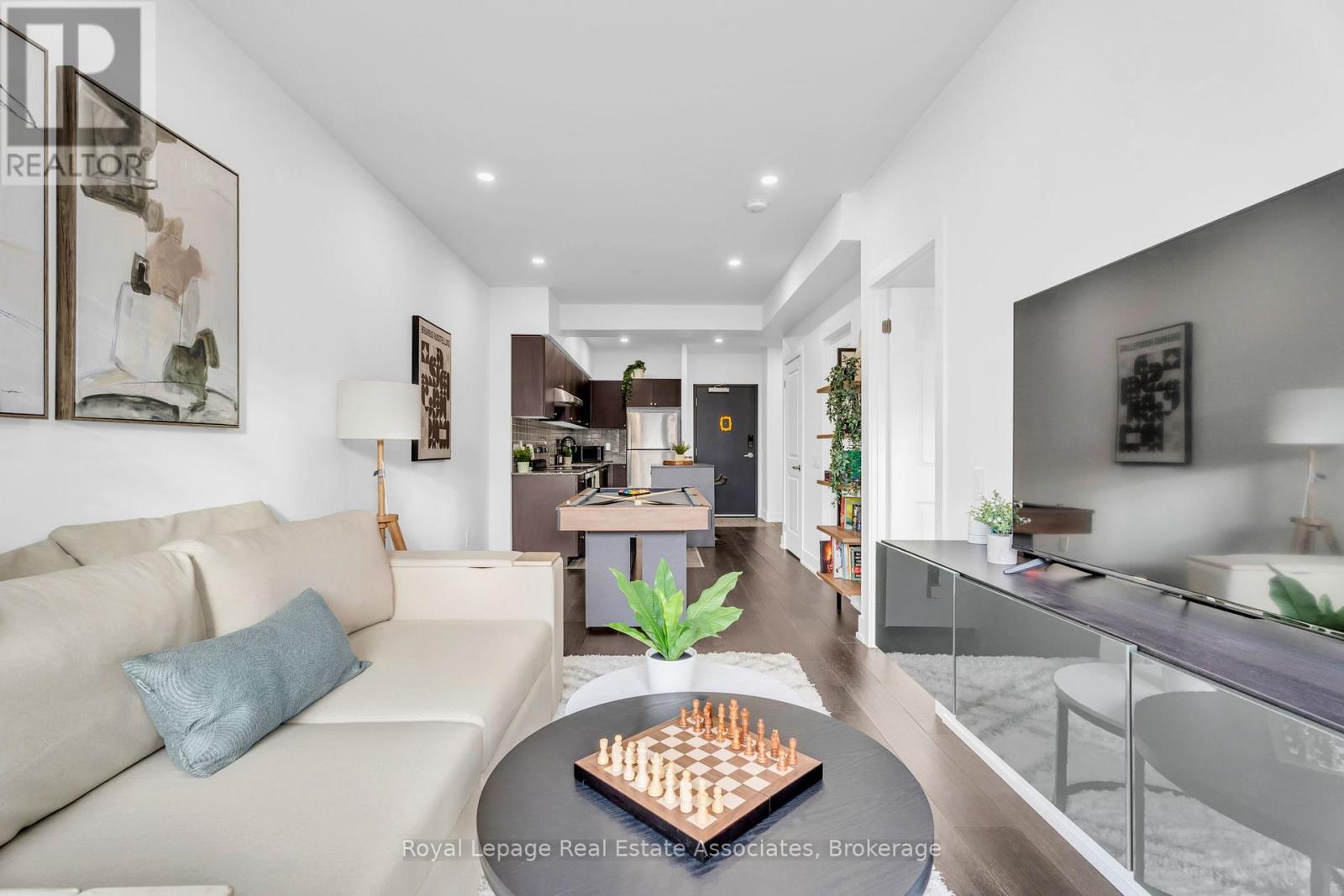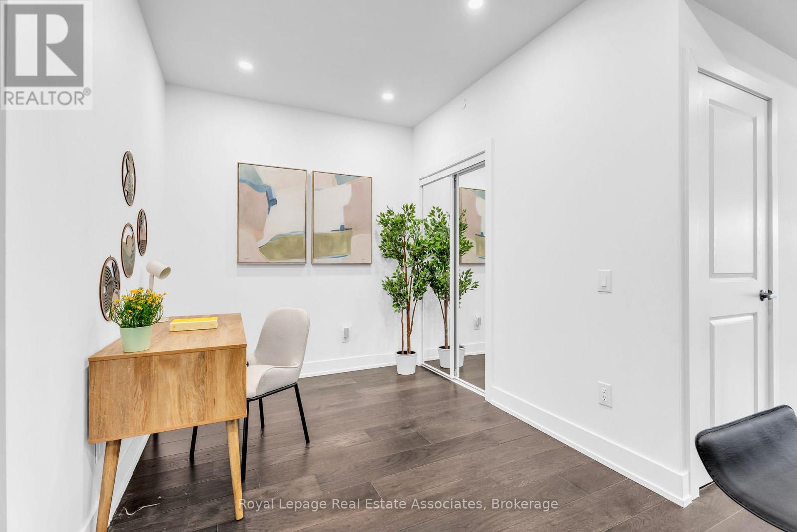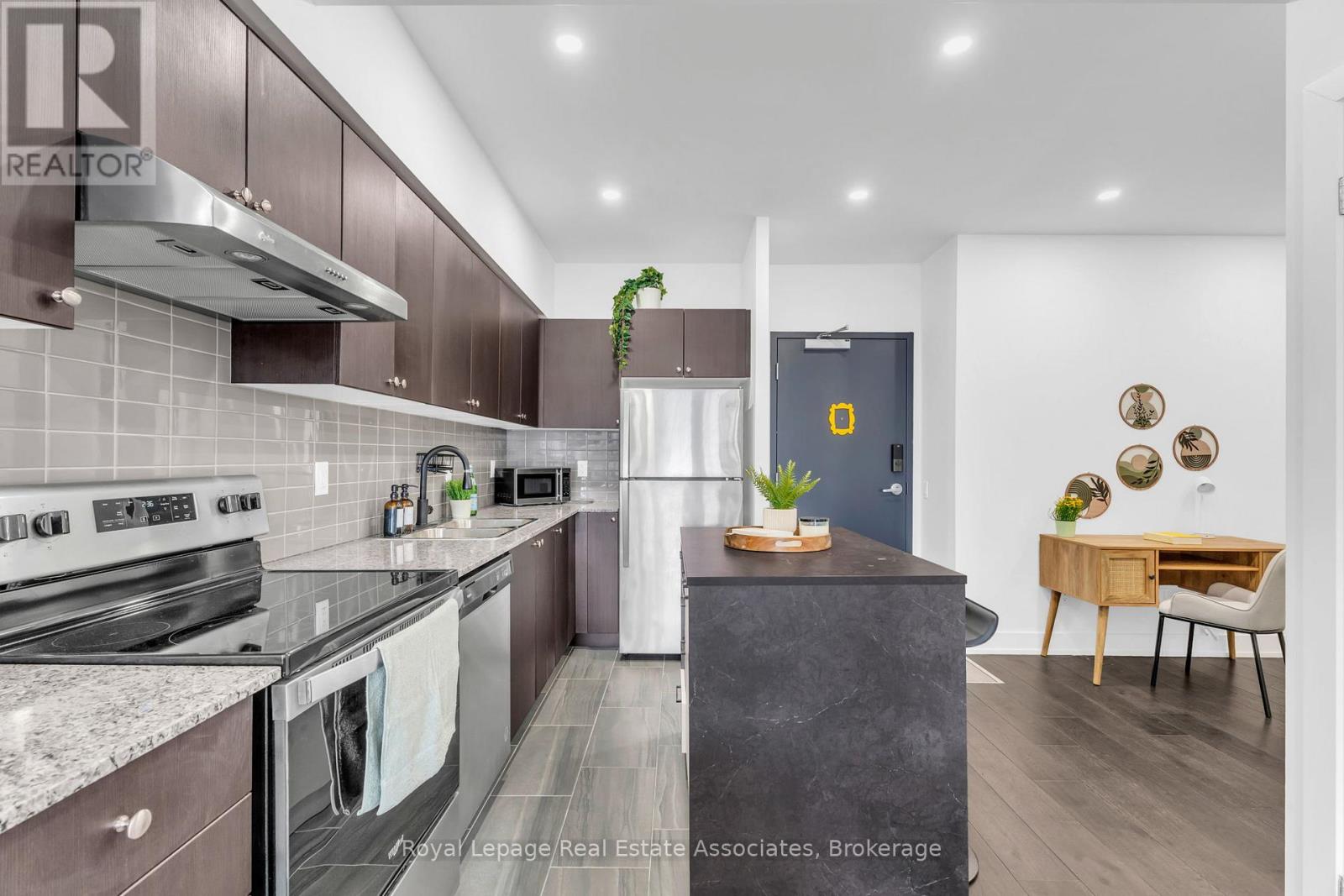 Set just moments from the heart of downtown Orangeville, this one bedroom plus den residence offers a thoughtfully composed balance of modern living and small-town ease. Positioned along Broadway Street and within easy walking distance to cafés, shops, restaurants, and everyday amenities, the home feels both connected and comfortably removed. Inside, the Madison model reveals a well-considered layout where light and proportion guide the experience from room to room. Large windows draw natural light deep into the living space, creating an atmosphere that feels open yet grounded. The flow is effortless, with a dedicated den offering flexibility for a home office, reading nook, or guest space, quietly set apart.The kitchen is clean-lined and contemporary, anchored by elegant porcelain tile flooring and a refined porcelain tile backsplash that bring both durability and understated sophistication. Designed for both function and calm, the space opens naturally to the living and dining areas, ideal for everyday living or effortless entertaining. From here, step outside to a rare and generous 220 square foot private walk-out patio-an extension of the living space that encourages morning coffee outdoors, evening unwinding, or simple moments of fresh air rarely found in condominium living.The bedroom is serene and well-proportioned, offering ample storage and a true sense of retreat at the end of the day. The modern four-piece bathroom is finished with porcelain tile flooring, echoing the home's cohesive design language. In-suite laundry and individually controlled heating and air conditioning in each room ensure comfort is both seamless and precisely tailored.Completing the offering are a private parking space, storage locker, and convenient visitor parking-details that quietly enhance daily life. This residence is ideal for first time homebuyers, downsizers or those seeking a refined, low-maintenance lifestyle just steps from the charm and vitality of downtown Orangeville. (id:4555)