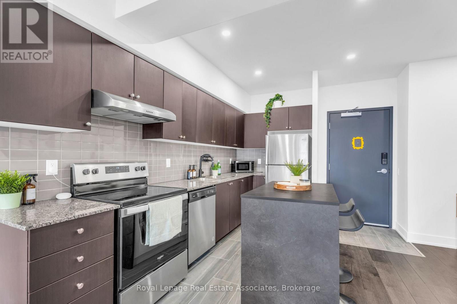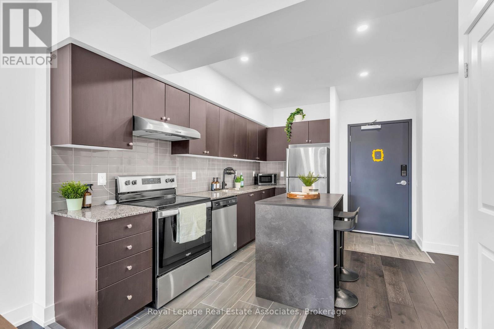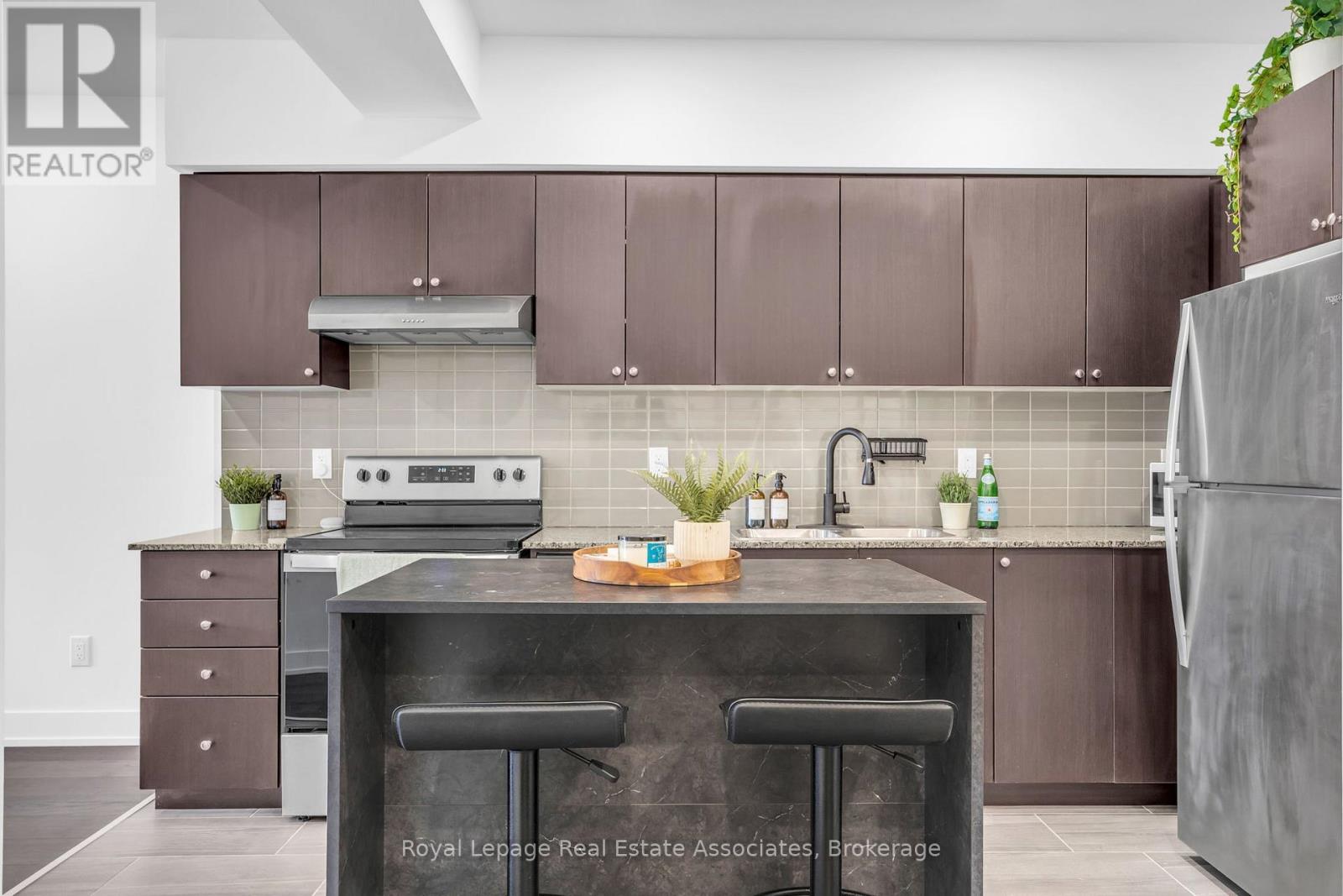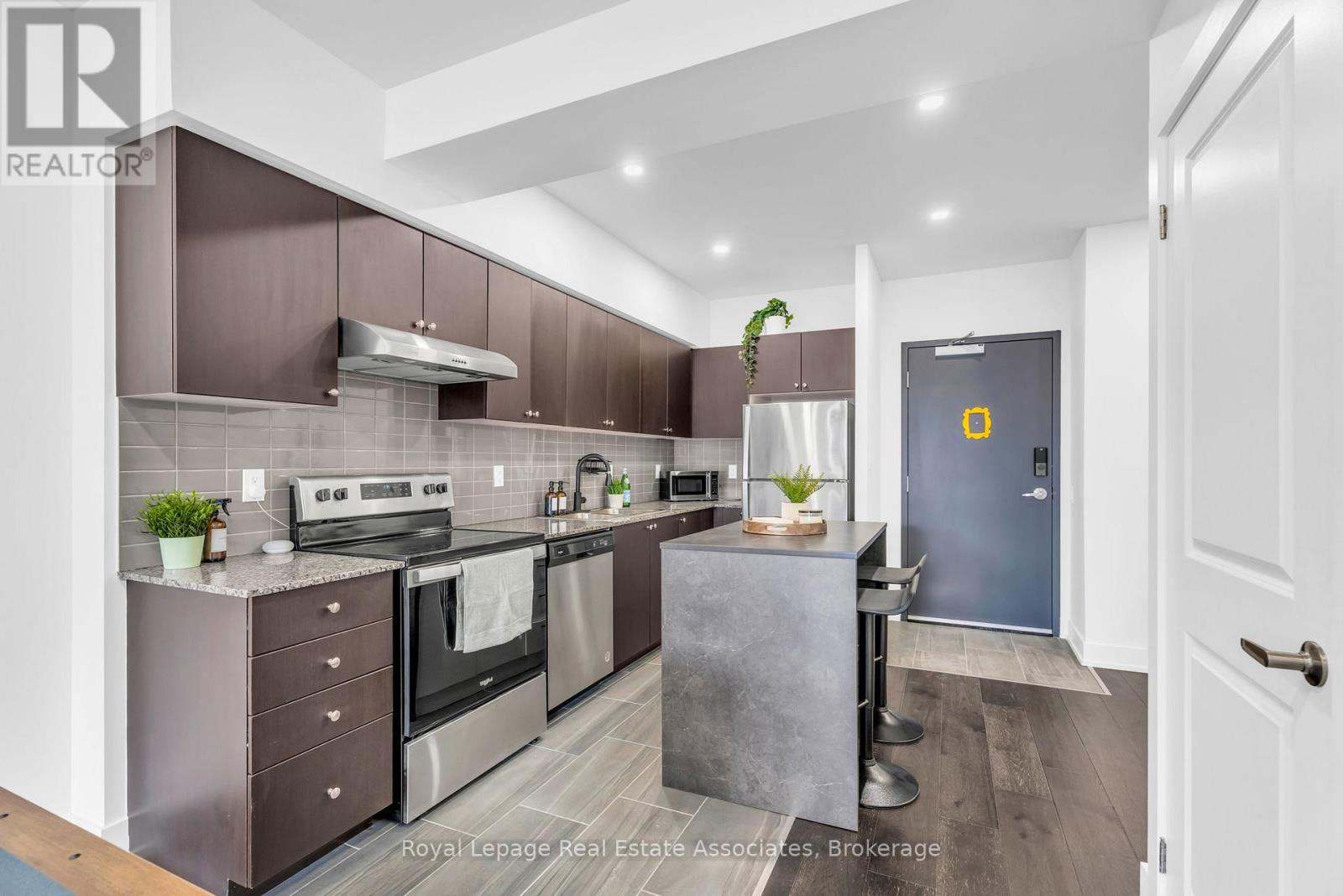 Set just moments from the heart of downtown Orangeville, this one bedroom plus den residence offers a thoughtfully composed balance of modern living and small-town ease. Positioned along Broadway Street and within easy walking distance to cafés, shops, restaurants, and everyday amenities, the home feels both connected and comfortably removed. Inside, the Madison model reveals a well-considered layout where light and proportion guide the experience from room to room. Large windows draw natural light deep into the living space, creating an atmosphere that feels open yet grounded. The flow is effortless, with a dedicated den offering flexibility for a home office, reading nook, or guest space, quietly set apart.The kitchen is clean-lined and contemporary, anchored by elegant porcelain tile flooring and a refined porcelain tile backsplash that bring both durability and understated sophistication. Designed for both function and calm, the space opens naturally to the living and dining areas, ideal for everyday living or effortless entertaining. From here, step outside to a rare and generous 220 square foot private walk-out patio-an extension of the living space that encourages morning coffee outdoors, evening unwinding, or simple moments of fresh air rarely found in condominium living.The bedroom is serene and well-proportioned, offering ample storage and a true sense of retreat at the end of the day. The modern four-piece bathroom is finished with porcelain tile flooring, echoing the home's cohesive design language. In-suite laundry and individually controlled heating and air conditioning in each room ensure comfort is both seamless and precisely tailored.Completing the offering are a private parking space, storage locker, and convenient visitor parking-details that quietly enhance daily life. This residence is ideal for first time homebuyers, downsizers or those seeking a refined, low-maintenance lifestyle just steps from the charm and vitality of downtown Orangeville. (id:4555)