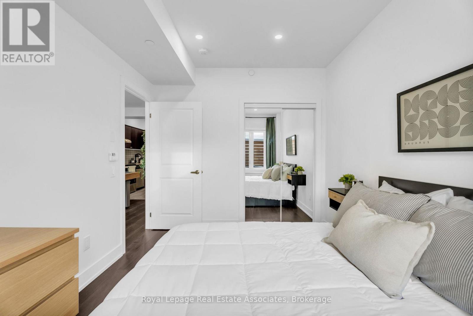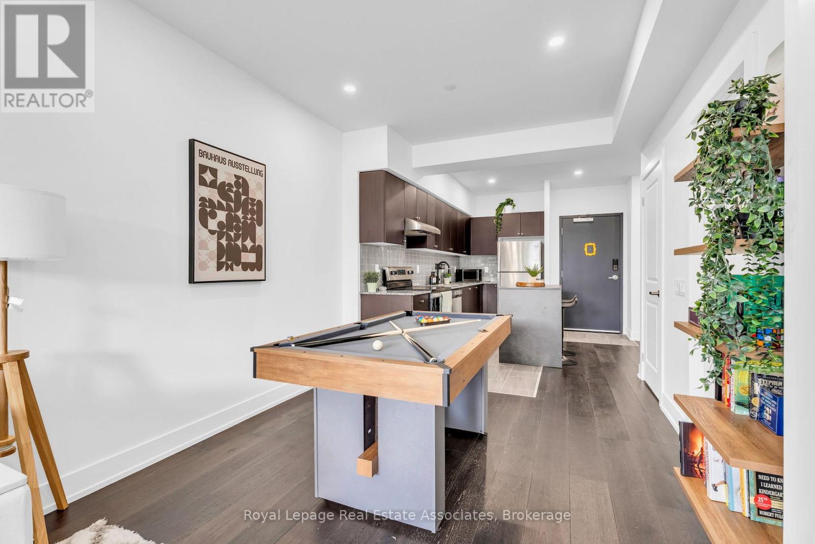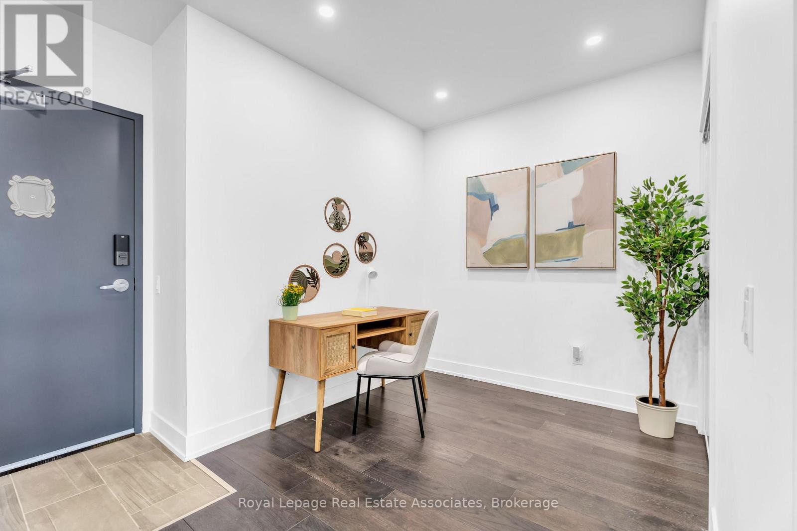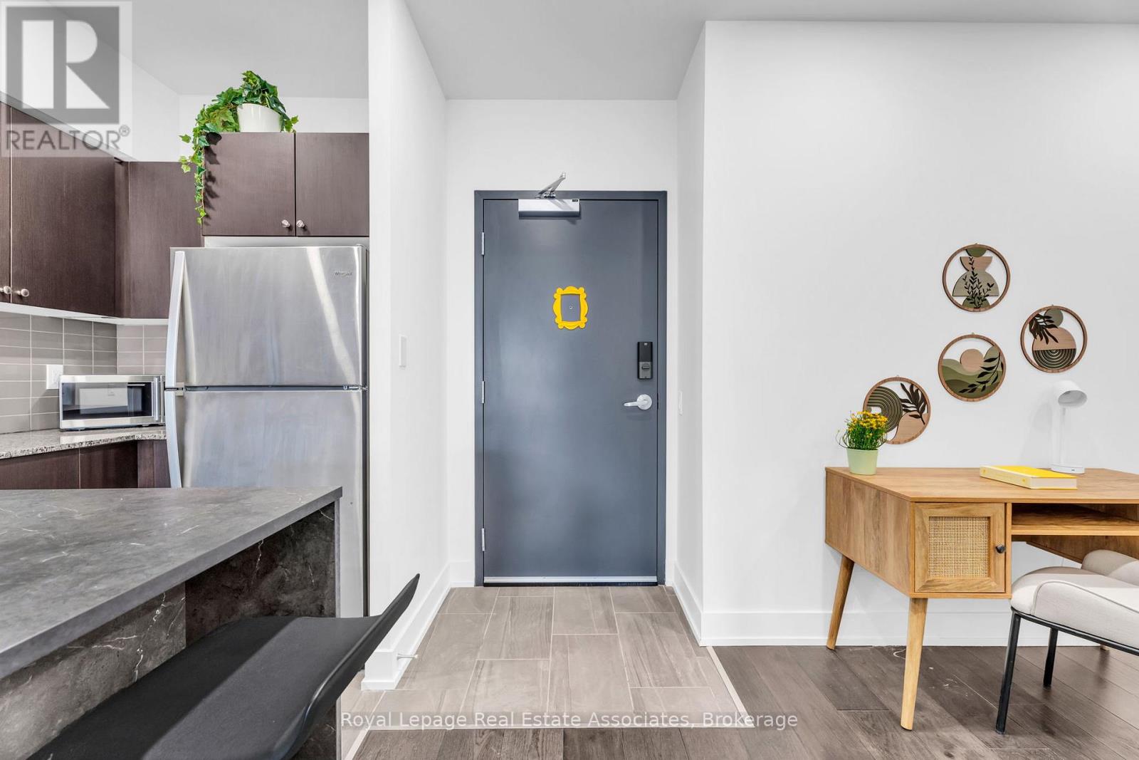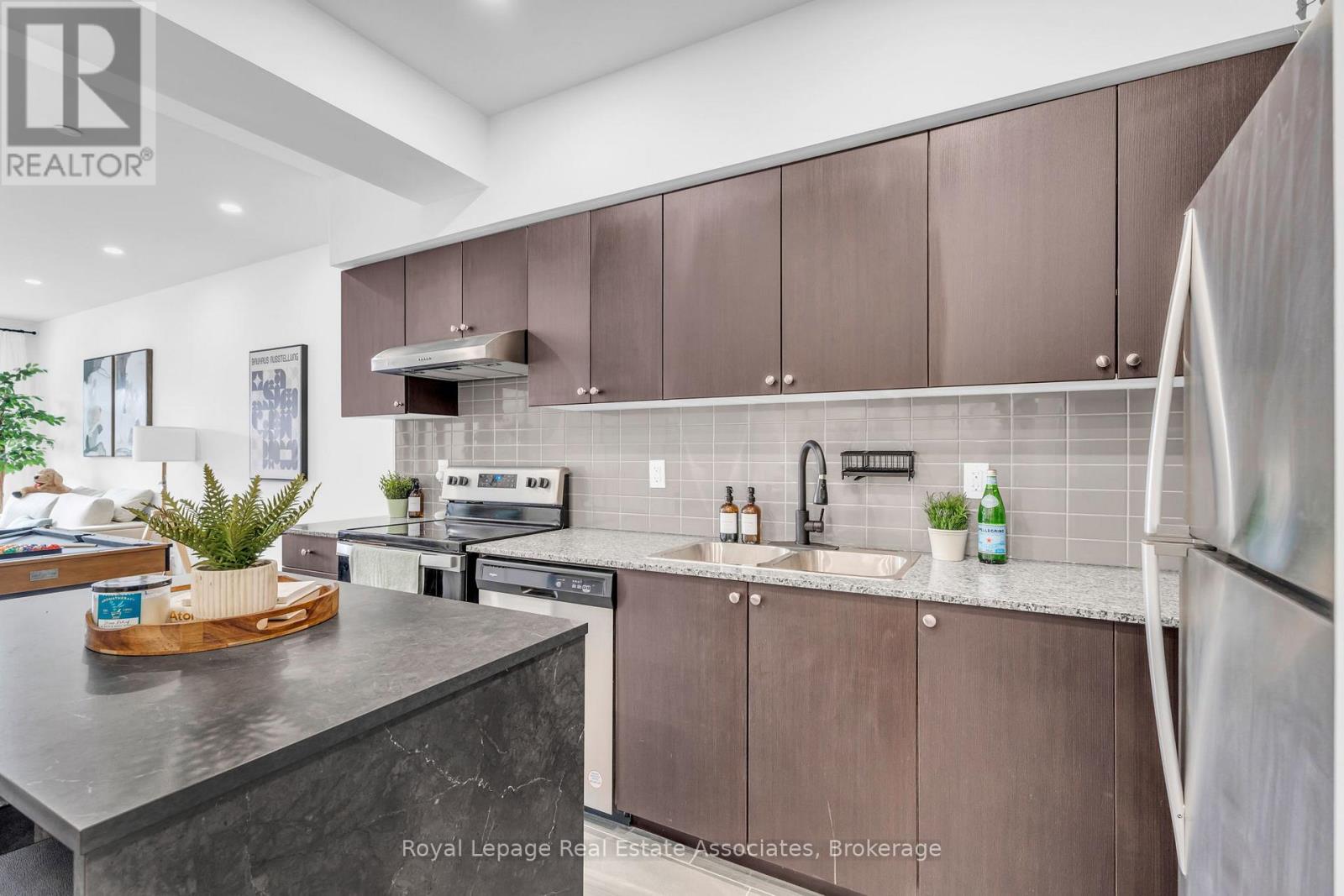 Set just moments from the heart of downtown Orangeville, this one bedroom plus den residence offers a thoughtfully composed balance of modern living and small-town ease. Positioned along Broadway Street and within easy walking distance to cafés, shops, restaurants, and everyday amenities, the home feels both connected and comfortably removed. Inside, the Madison model reveals a well-considered layout where light and proportion guide the experience from room to room. Large windows draw natural light deep into the living space, creating an atmosphere that feels open yet grounded. The flow is effortless, with a dedicated den offering flexibility for a home office, reading nook, or guest space, quietly set apart.The kitchen is clean-lined and contemporary, anchored by elegant porcelain tile flooring and a refined porcelain tile backsplash that bring both durability and understated sophistication. Designed for both function and calm, the space opens naturally to the living and dining areas, ideal for everyday living or effortless entertaining. From here, step outside to a rare and generous 220 square foot private walk-out patio-an extension of the living space that encourages morning coffee outdoors, evening unwinding, or simple moments of fresh air rarely found in condominium living.The bedroom is serene and well-proportioned, offering ample storage and a true sense of retreat at the end of the day. The modern four-piece bathroom is finished with porcelain tile flooring, echoing the home's cohesive design language. In-suite laundry and individually controlled heating and air conditioning in each room ensure comfort is both seamless and precisely tailored.Completing the offering are a private parking space, storage locker, and convenient visitor parking-details that quietly enhance daily life. This residence is ideal for first time homebuyers, downsizers or those seeking a refined, low-maintenance lifestyle just steps from the charm and vitality of downtown Orangeville. (id:4555)