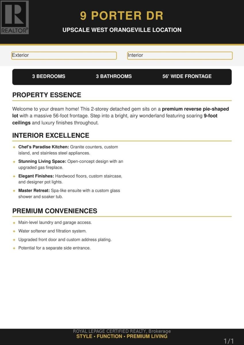 Stunning Family Home on Premium 56 feet front Lot in Sought-After West OrangevilleWelcome to 9 Porter Drive, nestled in one of Orangeville's most desirableneighbourhoods. This beautifully maintained, 2017-built detached home sits on apremium lot and offers the perfect blend of modern upgrades, comfort, and futurepotential-ideal for growing families.Step inside to a bright and inviting entryway filled with natural light. The mainlevel features 9-foot ceilings, elegant hardwood flooring, and a thoughtfullydesigned open-concept layout. The spacious living and dining area is perfect forentertaining, complete with a cozy upgraded gas fireplace and stylish finishesthroughout.The kitchen truly is the heart of the home, showcasing granite countertops, upgradedwhite cabinetry, a premium backsplash, stainless steel appliances, and a customisland. Enjoy seamless indoor-outdoor living with a walkout to the backyard-offeringplenty of space for summer BBQs and even the potential for a pool.Additional main floor highlights include California shutters, pot lights, premiumlight fixtures, garage access, and a convenient laundry area.Upstairs, you'll find three generously sized bedrooms, including a luxurious primarysuite with a spa-like ensuite featuring a custom glass shower and soaker tub. Themain bathroom offers a double vanity-perfect for busy families.The unfinished basement includes a bathroom rough-in and offers incredible potentialfor customization, with the possibility of a future side entrance.Highlighted Features :Premium 56 feet Front lot in a family-friendly neighbourhoodHardwood flooring & California shutters .Custom hardwood staircase with iron picketsPot lights on Main & 2nd FloorCentral air conditioning & Furnace ( owned )Water softener & filtration system ( owned )Upgraded front door with custom address letteringGarage door openerPotential for side Entrance to Basement. (id:4555)