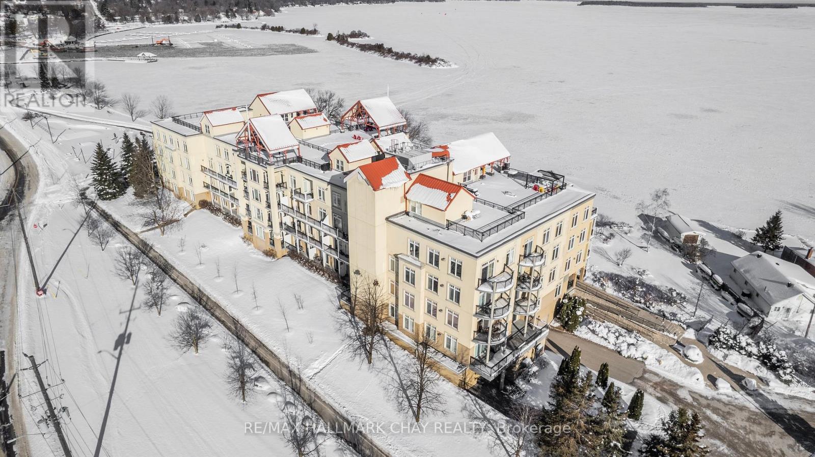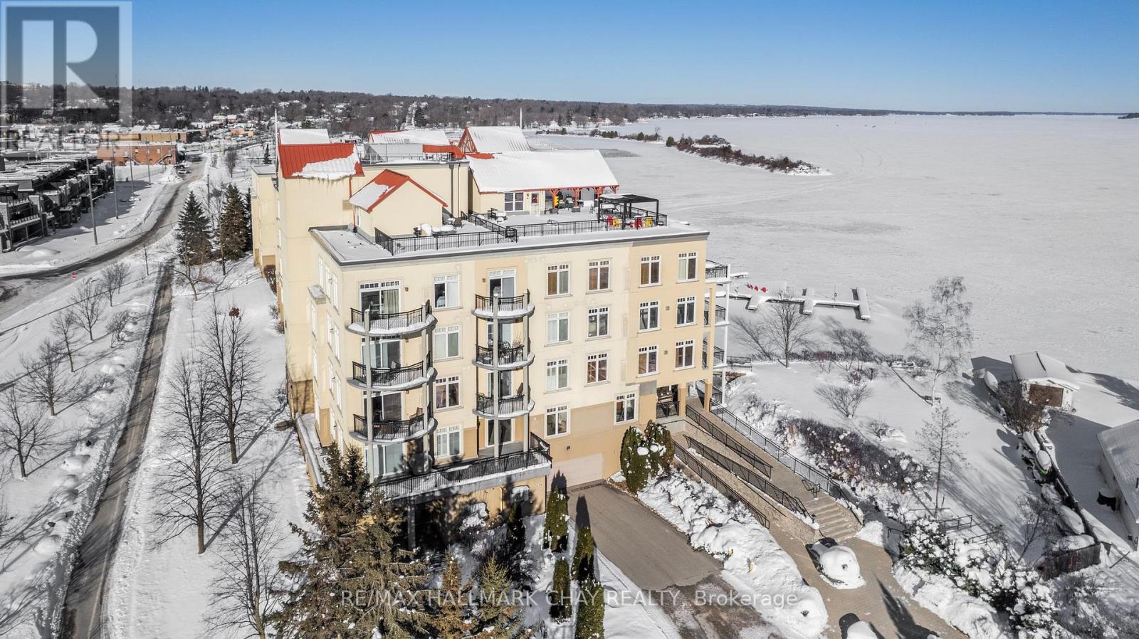 Barrie Condo Corner presents - elegant waterfront living nestled on the serene shores of Lake Couchiching. Own your very own private boat slip and condo unit in Orillia's premiere Elgin Bay Club Condos. This 1 bedroom, 1 bathroom gem boasts granite countertops, gleaming hardwood floors, tall baseboards and exquisite moulding, under the grace of 9ft ceilings. Revel in the abundant natural light, amplifying a bright & spacious ambiance. The open concept unit features a gorgeous living area with a gas fireplace to relax and unwind after a long day. Step out onto your quaint balcony overlooking lush greenery and the Millennium Trail, or entertain atop the rooftop terrace with breathtaking panoramic views of the water. The bedroom is a great size with an oversized closet and a separate walkout to a private patio. Included in the unit for your added convenience is a large laundry room with extra storage. Exclusive amenities include a party room, a private waterfront and heated underground parking. This unit also comes with a rare owned dock (only 25 units in this building) perfect for you to pull your boat right up to while getting to enjoy time outdoors on the water amidst the picturesque setting. For the days you don't want to take your boat out, also included is complimentary kayak storage. The location cant be beat. It is a short walk to Orillia's historic downtown district that features excellent restaurants, grocery, shopping, entertainment and more. It's also right next door to the Royal Canadian Legion. For nature enthusiasts there is direct access to Millennium Trail for year-round hiking and exploring. Your tranquil retreat awaits. (id:4555)