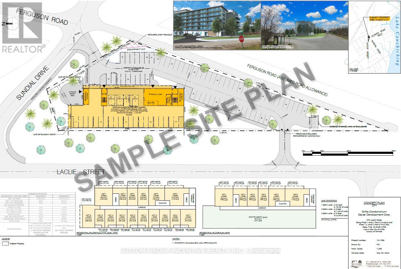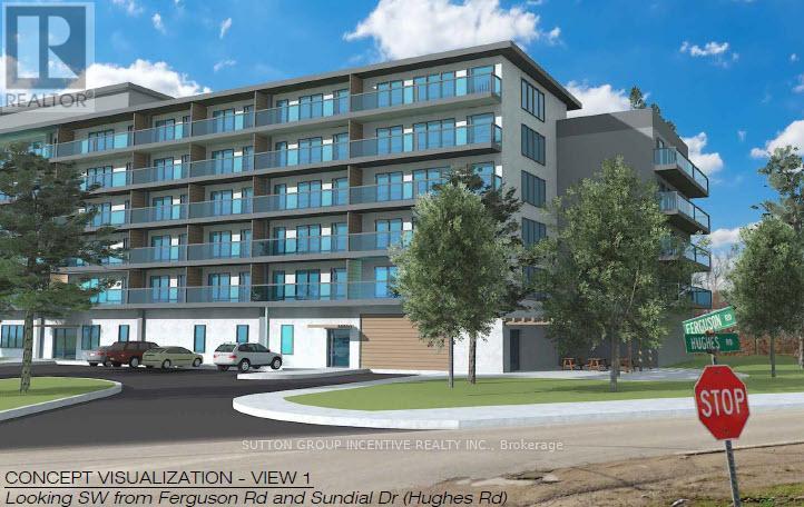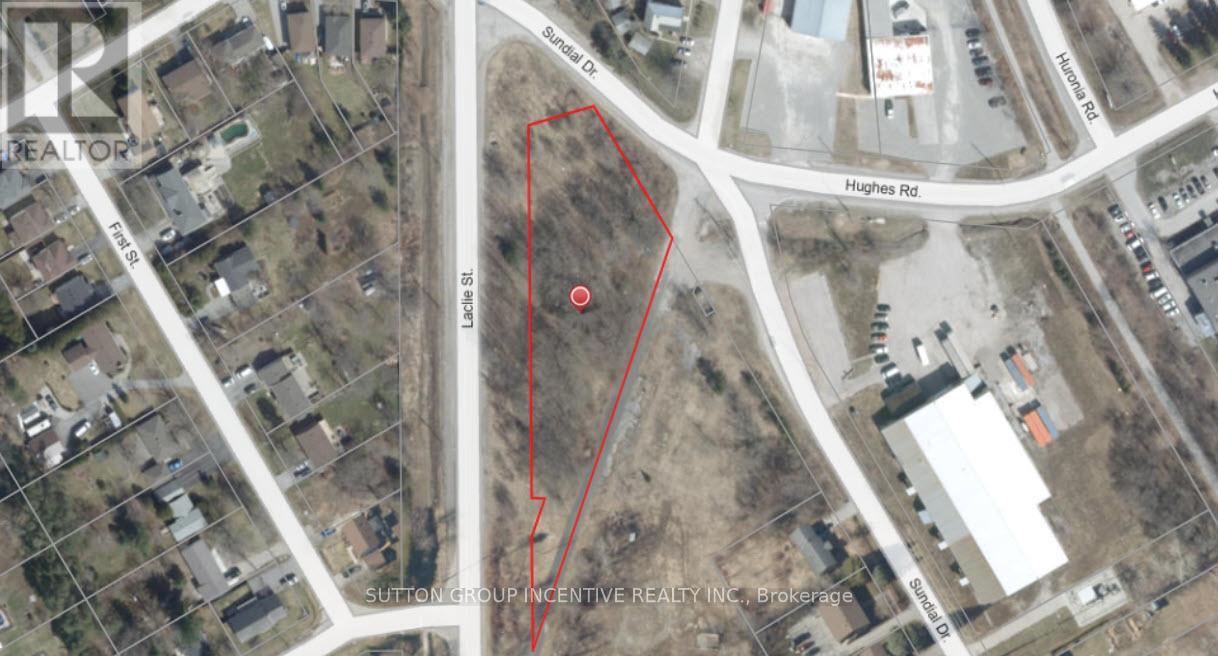 New Price -- New Opportunity! 570 Laclie Street is located in north Orillia at the intersection of Laclie Street, Hughes Road and Ferguson Road. The 1.287 AC triangular parcel has approximately 600' of frontage on the east side of Laclie Street. Property borders Ferguson Road at the rear of the parcel which appears to be an unassumed road / opened allowance that intersects with Hughes & Sundial Drive at the north and south boundaries. Property can be serviced as municipal water and sanitary lines / storm sewers, as well as natural gas, electricity, high speed interest and telephone, are located on all surroundings streets. This parcel is located just 750m west of the shores of Lake Couchiching and 750m south of closest Highway 11 interchange. In 2021, the City of Orillia approved a rezoning from C4(i)H2 to R5-13i(H2) to allow for a 7-storey building with 70 dwelling units. While the site has been rezoned for a 70 unit, 7 storey building, the current rendering and site plan indicates ground floor parking with five floors of residential for a total of 6 storeys. consisting of 70 residential condo units and 91 parking spaces. Unit mix: 52 One-Bedroom Suites, 8 Two-Bedroom Suites and 10 Three-Bedroom Suites, with a 1.3 parking ratio. Total GFA = 91,446SF / Total NSA = 82,271 SF - Site coverage of 23.15%. Zoning By-Law Amendment 2021-37 allows for density of 133.89 units / hectares. Current Development charges for project estimated to be $1,295,588 based on current DC for residential - but subject to review following approval of Site Plan. To be re-assessed - estimated to be $11,000 for 2026. (id:4555)