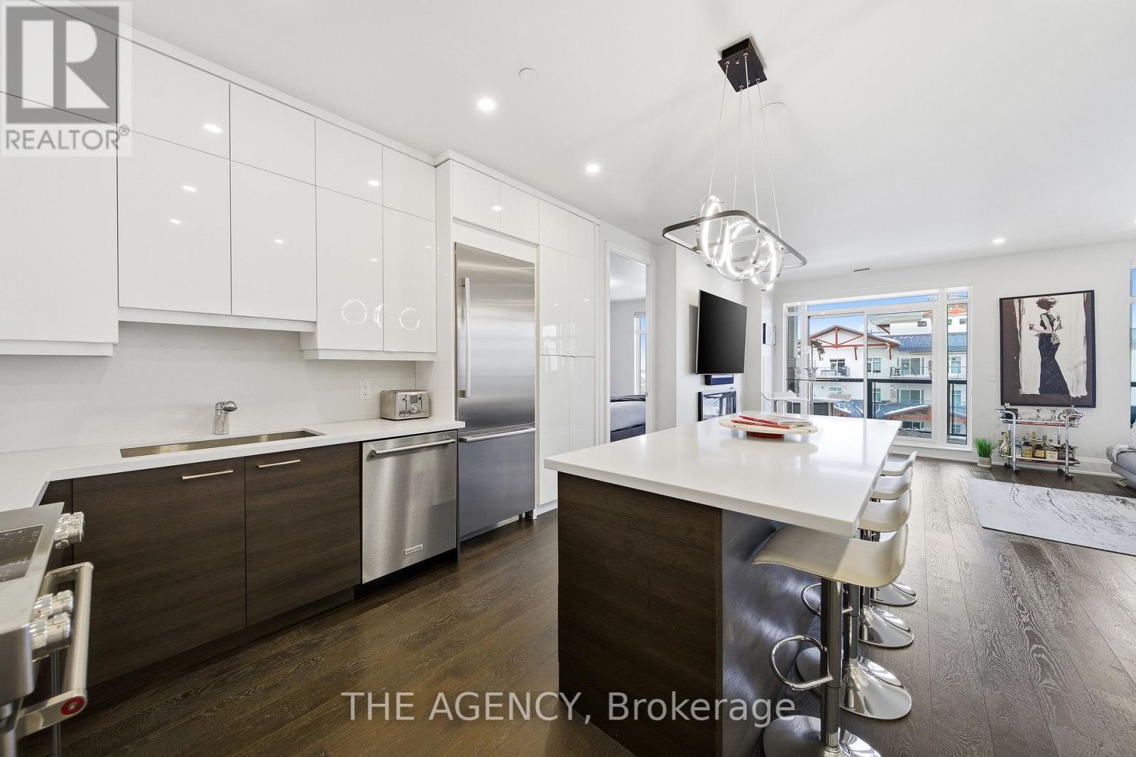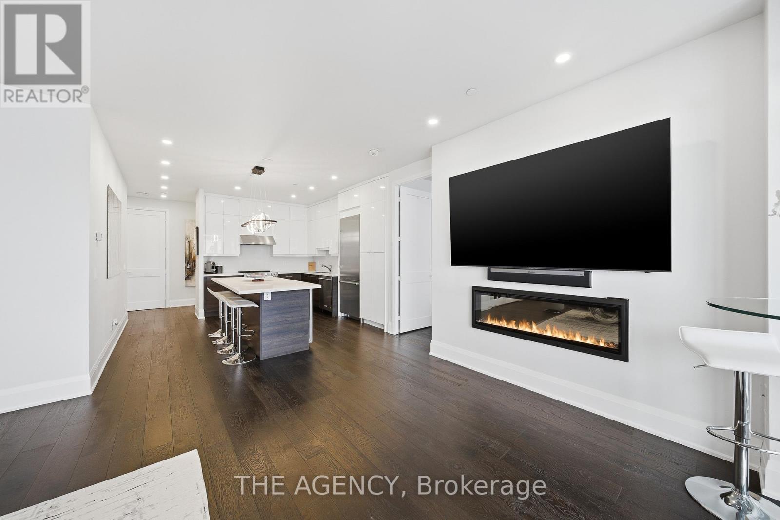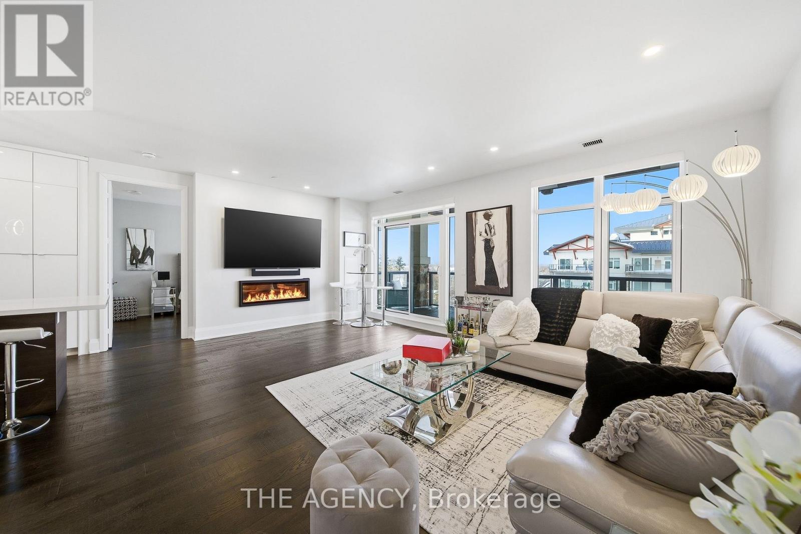 Perched at the north end of Lake Simcoe and just minutes from downtown Orillia and Casino Rama, this luxurious 2-bedroom, 2-bath waterfront condo offers over 1,200 sq. ft. of maintenance-free living. Featuring soaring 10-ft ceilings, wide-plank flooring, and a custom chef's kitchen with quartz countertops, upgraded stainless steel appliances, and oversized island with breakfast bar. The sun-filled great room includes a modern linear electric fireplace and sliding doors to a private lakefront balcony with gas BBQ hookup-perfect for enjoying stunning sunrises and sunsets. The spacious primary suite accommodates a king-size bed and offers walk-through closets and a spa-inspired 5-piece ensuite. A versatile second bedroom with French doors is ideal as a guest room, den, or office, located next to a stylish 3-piece bath. Enjoy resort-style amenities including fitness centre, sauna, pool, hot tub, theatre, party room, outdoor terraces, guest suite, and more. Boat slips available for rent right outside your door. Includes 2 parking spaces and storage locker. Four-season lakeside living at its finest. (id:4555)