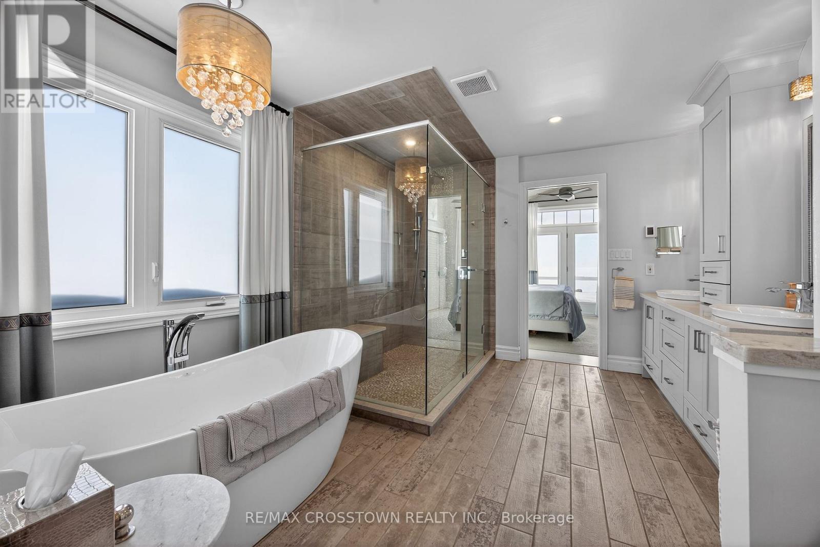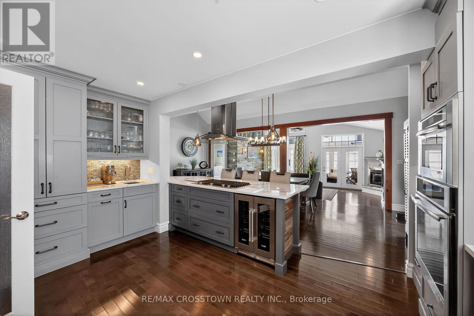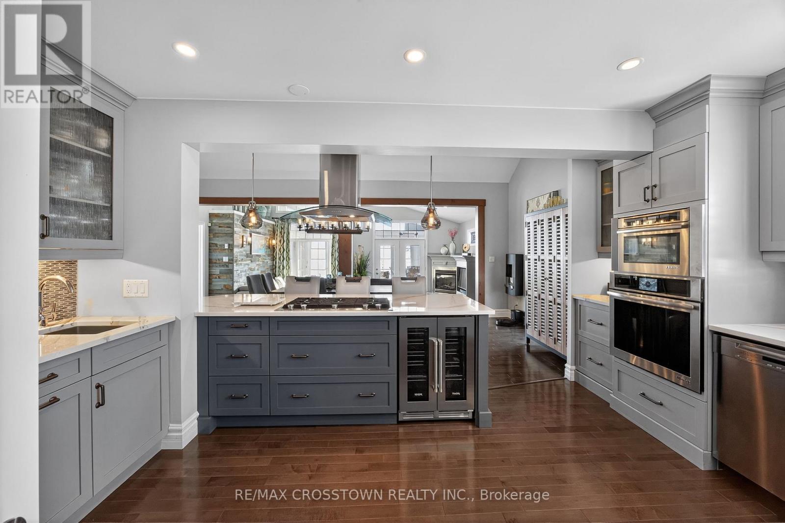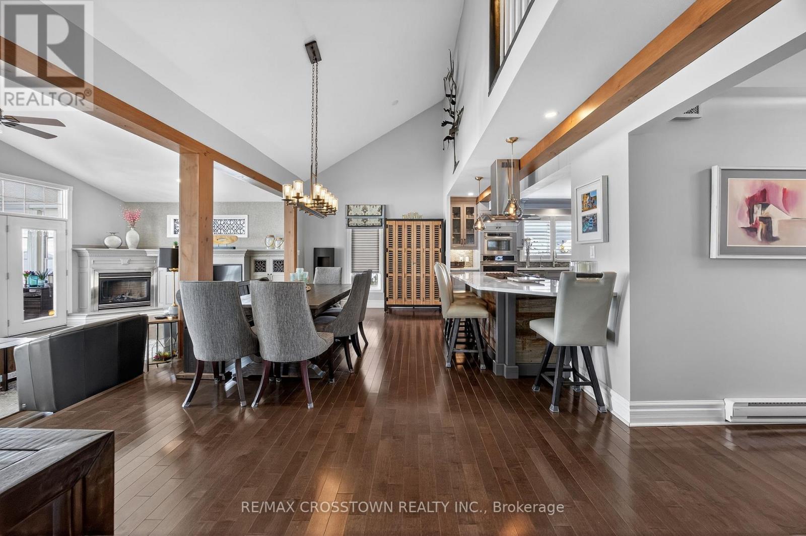 What a treat! Delightful home, meticulously cared for. Custom Designed Kitchen with top quality Cambria Counters. Jennair Gas Range, built in double oven and terrific breakfast bar (Ideal for guests while entertaining & chef duties are happening)... that makes me think of the handy wine fridge.! Spacious dining area, suitable for large table & vaulted ceiling adds drama... flowing beautifully to the sunken living room, with built-in cabinets and cozy gas fireplace. All of this with gorgeous view of the sparkling sun on the water. (Isn't that what lakefront living is all about?) Main floor Primary Bedroom offers convenient privacy and another amazing view of the lake...along with a walkout to the deck and waterfront. The Primary Ensuite is awesome, heated floors, stand along tub, glass shower...just so nice! Then the large walk-in closet is perfectly positioned and well suited to handle your wardrobe. The main floor laundry and garage entrance make for handy access and convenience. Walk up the hardwood stairs, across the loft view over the great living areas and find a private bedroom area, with it's own 4pc ensuite (heated floors, no less). The waterfront is easy access, gently sloping with a terrific dock system (composite surface) approx 60ft long. Now, you can't miss the gracious size and high ceiling in the amazing sun room (very adjustable windows & screens) which can extend your enjoyment so much of the year. The Vieto Radiant heaters and custom blinds ensure you have all the comfort options you can imagine. All year long you can surely relax in the Jacuzzi Hot Tub, and there are 2 separate gas line hook-ups for BBQ etc. Worry free is a good thing, hence the full home Generac Generator is standing by at your service to ensure no interruptions...even during that dinner party, or waterfront gathering. Nice! (id:4555)