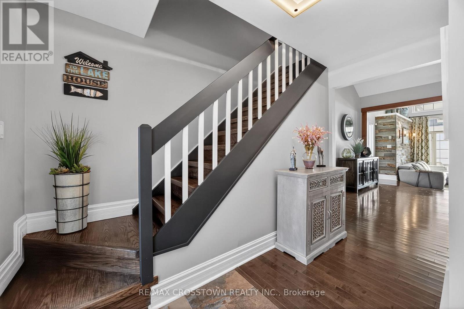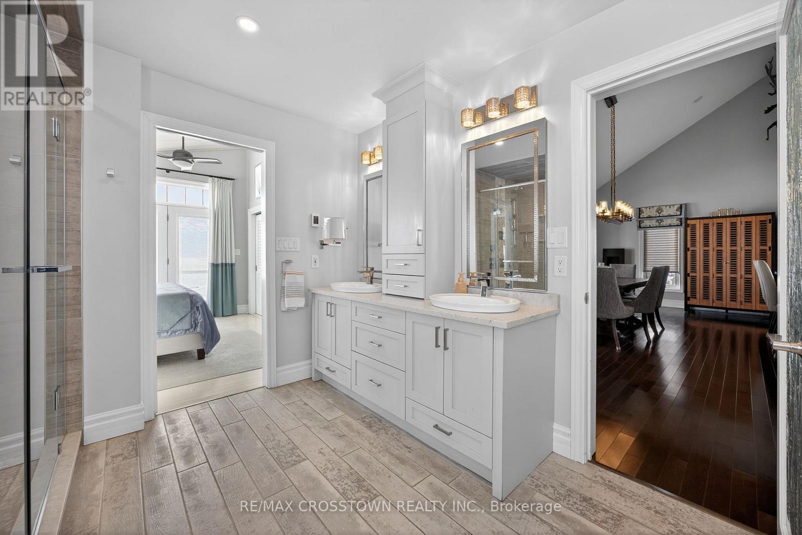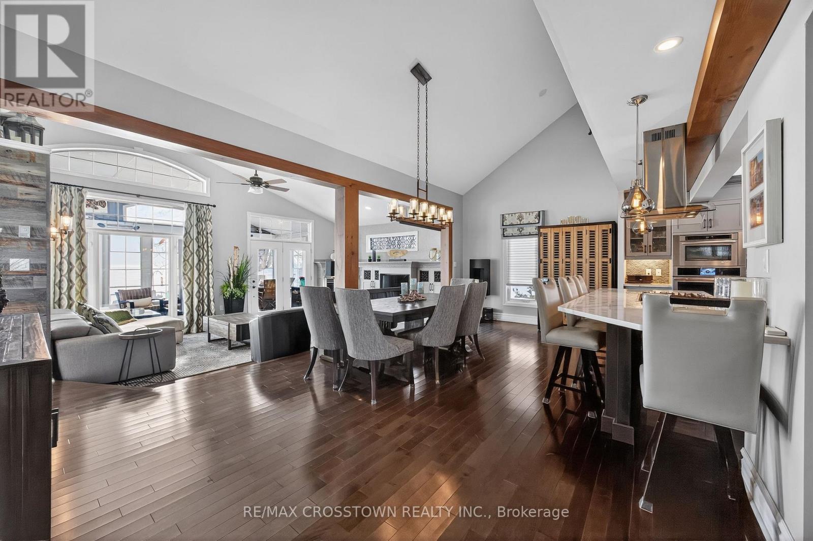 What a treat! Delightful home, meticulously cared for. Custom Designed Kitchen with top quality Cambria Counters. Jennair Gas Range, built in double oven and terrific breakfast bar (Ideal for guests while entertaining & chef duties are happening)... that makes me think of the handy wine fridge.! Spacious dining area, suitable for large table & vaulted ceiling adds drama... flowing beautifully to the sunken living room, with built-in cabinets and cozy gas fireplace. All of this with gorgeous view of the sparkling sun on the water. (Isn't that what lakefront living is all about?) Main floor Primary Bedroom offers convenient privacy and another amazing view of the lake...along with a walkout to the deck and waterfront. The Primary Ensuite is awesome, heated floors, stand along tub, glass shower...just so nice! Then the large walk-in closet is perfectly positioned and well suited to handle your wardrobe. The main floor laundry and garage entrance make for handy access and convenience. Walk up the hardwood stairs, across the loft view over the great living areas and find a private bedroom area, with it's own 4pc ensuite (heated floors, no less). The waterfront is easy access, gently sloping with a terrific dock system (composite surface) approx 60ft long. Now, you can't miss the gracious size and high ceiling in the amazing sun room (very adjustable windows & screens) which can extend your enjoyment so much of the year. The Vieto Radiant heaters and custom blinds ensure you have all the comfort options you can imagine. All year long you can surely relax in the Jacuzzi Hot Tub, and there are 2 separate gas line hook-ups for BBQ etc. Worry free is a good thing, hence the full home Generac Generator is standing by at your service to ensure no interruptions...even during that dinner party, or waterfront gathering. Nice! (id:4555)