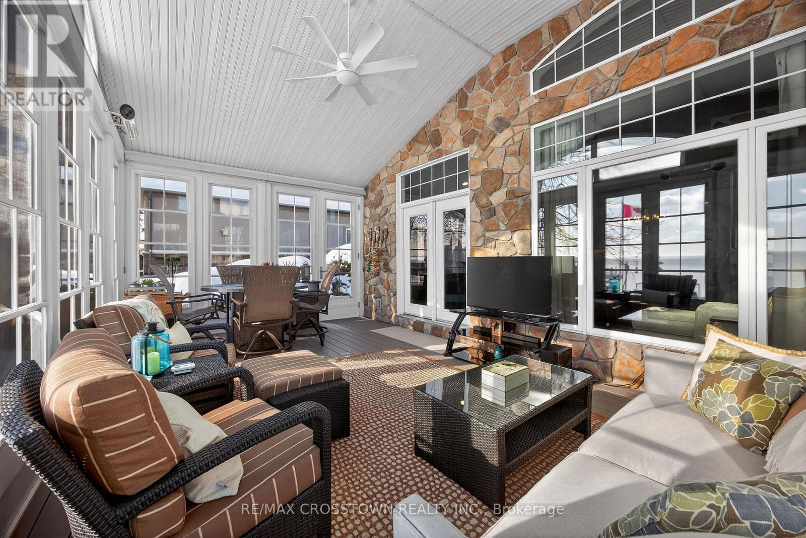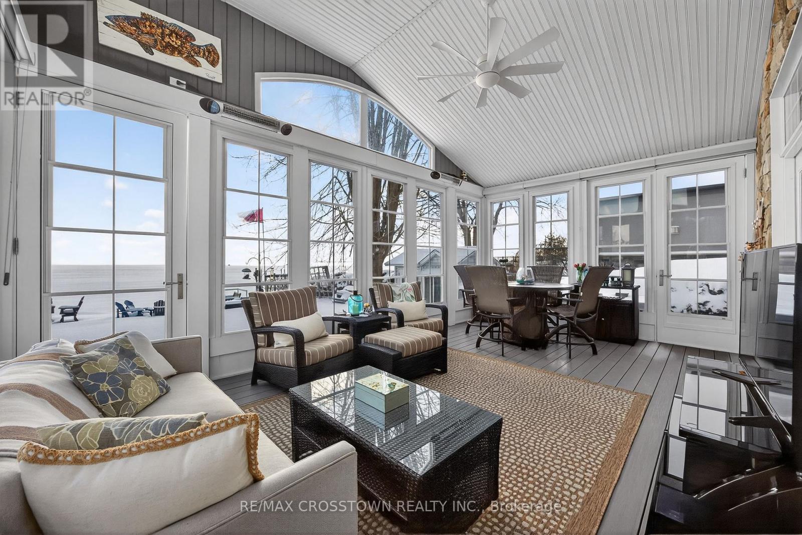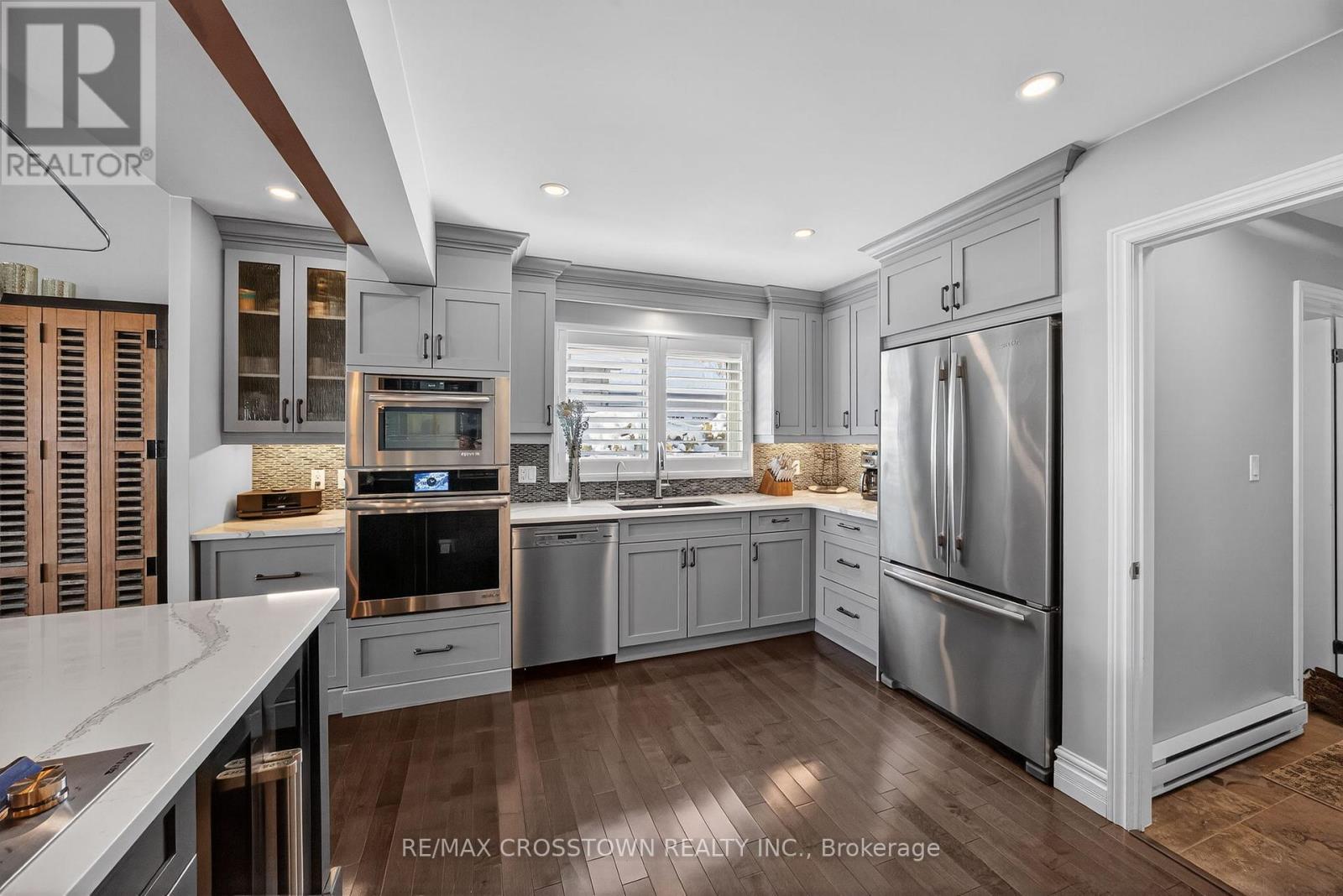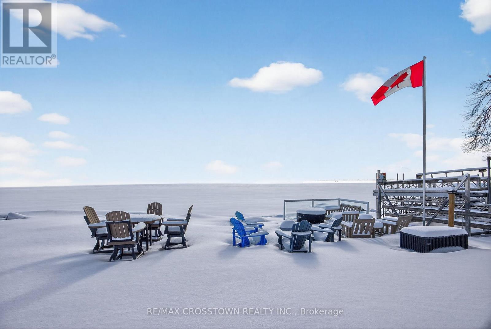 What a treat! Delightful home, meticulously cared for. Custom Designed Kitchen with top quality Cambria Counters. Jennair Gas Range, built in double oven and terrific breakfast bar (Ideal for guests while entertaining & chef duties are happening)... that makes me think of the handy wine fridge.! Spacious dining area, suitable for large table & vaulted ceiling adds drama... flowing beautifully to the sunken living room, with built-in cabinets and cozy gas fireplace. All of this with gorgeous view of the sparkling sun on the water. (Isn't that what lakefront living is all about?) Main floor Primary Bedroom offers convenient privacy and another amazing view of the lake...along with a walkout to the deck and waterfront. The Primary Ensuite is awesome, heated floors, stand along tub, glass shower...just so nice! Then the large walk-in closet is perfectly positioned and well suited to handle your wardrobe. The main floor laundry and garage entrance make for handy access and convenience. Walk up the hardwood stairs, across the loft view over the great living areas and find a private bedroom area, with it's own 4pc ensuite (heated floors, no less). The waterfront is easy access, gently sloping with a terrific dock system (composite surface) approx 60ft long. Now, you can't miss the gracious size and high ceiling in the amazing sun room (very adjustable windows & screens) which can extend your enjoyment so much of the year. The Vieto Radiant heaters and custom blinds ensure you have all the comfort options you can imagine. All year long you can surely relax in the Jacuzzi Hot Tub, and there are 2 separate gas line hook-ups for BBQ etc. Worry free is a good thing, hence the full home Generac Generator is standing by at your service to ensure no interruptions...even during that dinner party, or waterfront gathering. Nice! (id:4555)
