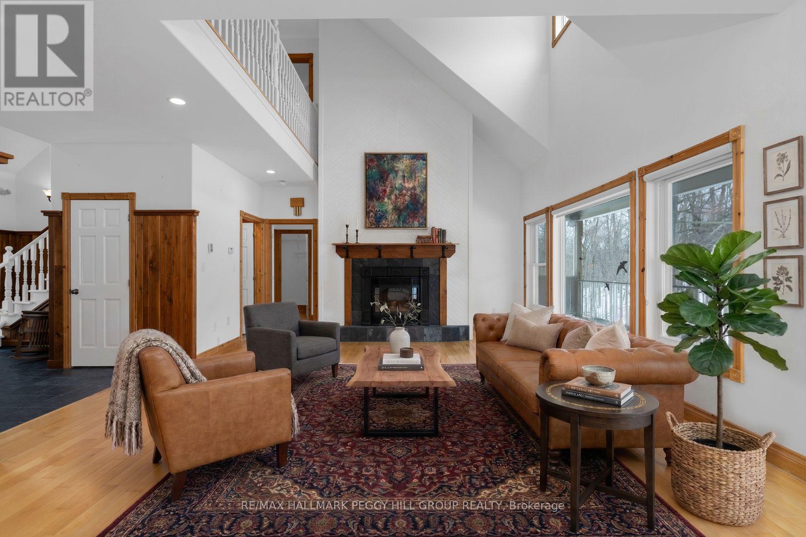 METICULOUSLY KEPT 4000+ SQ FT ESTATE ON 1.33 ACRES WITH A WALKOUT BASEMENT & EXCLUSIVE ACCESS TO 52 ACRES! Set on 1.33 acres in a prestigious estate neighbourhood in sought-after Horseshoe Valley, this well-maintained 2-storey home enjoys a treed setting with no homes directly in front or behind. A peaceful cul-de-sac address, lovely dormer windows, a large covered front porch, and an attached 2-car garage give this home a memorable first impression. Enjoy exclusive access to approximately 52 acres of private land for Trillium Trail residents, featuring nature trails, lookout points, open field space, and shared use of a storage shop. Hardwood flooring carries throughout the main and second level, while the combined living and dining room is defined by a soaring vaulted ceiling, oversized windows, a fireplace, and a double garden door walkout. Beautifully finished, the kitchen features quartz counters, built-in stainless steel appliances, white cabinetry with some glass inserts, a centre island, and breakfast bar seating. Main floor laundry with garage access adds function, while the main floor primary bedroom offers a private walkout to the back deck and a 5-piece ensuite with a soaker tub, separate shower, and water closet. Upstairs, 2 additional bedrooms, a full bathroom, and a loft-style family room with a gas fireplace create an upper level with plenty of character. The fully finished walkout basement with garage access and in-law potential extends the home's living space with a large rec room featuring a fireplace and double garden door walkout, along with a wet bar, bedroom, full bathroom, and large storage area. A new furnace in 2026 adds peace of mind. This exceptional location places you minutes from golf courses, Copeland Forest, ski hills, country clubs, and Vettä Nordic Spa, while the new Horseshoe Heights Public School is within walking distance, and Orillia and downtown Barrie are both under 25 minutes away. (id:4555)