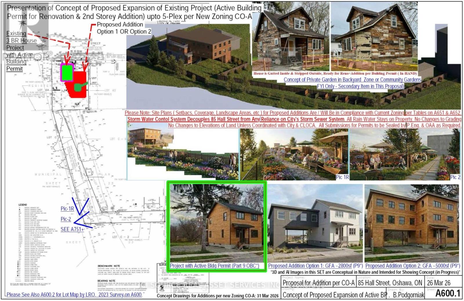 Attention Builders & Investors: For Sale Shovel-Ready House Renovation Project on Ravine Lot in Oshawa - Approx. 800m away from Newly proposed Go-Station. Property is Completely along Green Space - see Survey, LRO plan, and images. The Place is Green Space. Existing HOUSE was built of old solid wood and all finishes have been already Stripped Outside & Gutted Inside - READY for Renovation, which includes Addition of FULL 2nd Storey. NEW SURVEY. ACTIVE BUILDING PERMIT IN HAND: 3 BEDROOMS Upstairs. Kitchen Living on 1st Floor. GFA Approx. 1360 Square Feet. Basement. Building Permit in Hand for 3 Bedroom in full height 2nd Story. Note, the Listing Price incudes the House As Is now, along with Current Building Permit [ for 1360 sf one family house ]. Buyer to do own due diligence and use their own discretion in assessment of Cost of Construction for the Approved (1) Dwelling Unit shown on Building Permit Drawings. The price listed here includes the House "AS-IS" now and Building Permit drawings in-hand - subject to coordination of transfer of permits as per procedures by city and conservation authority. *For Additional Property Details Click The Brochure Icon Below* (id:4555)