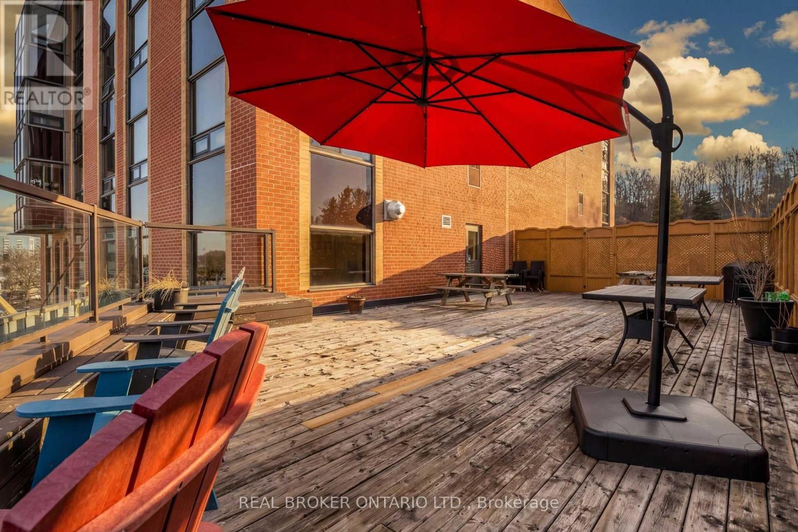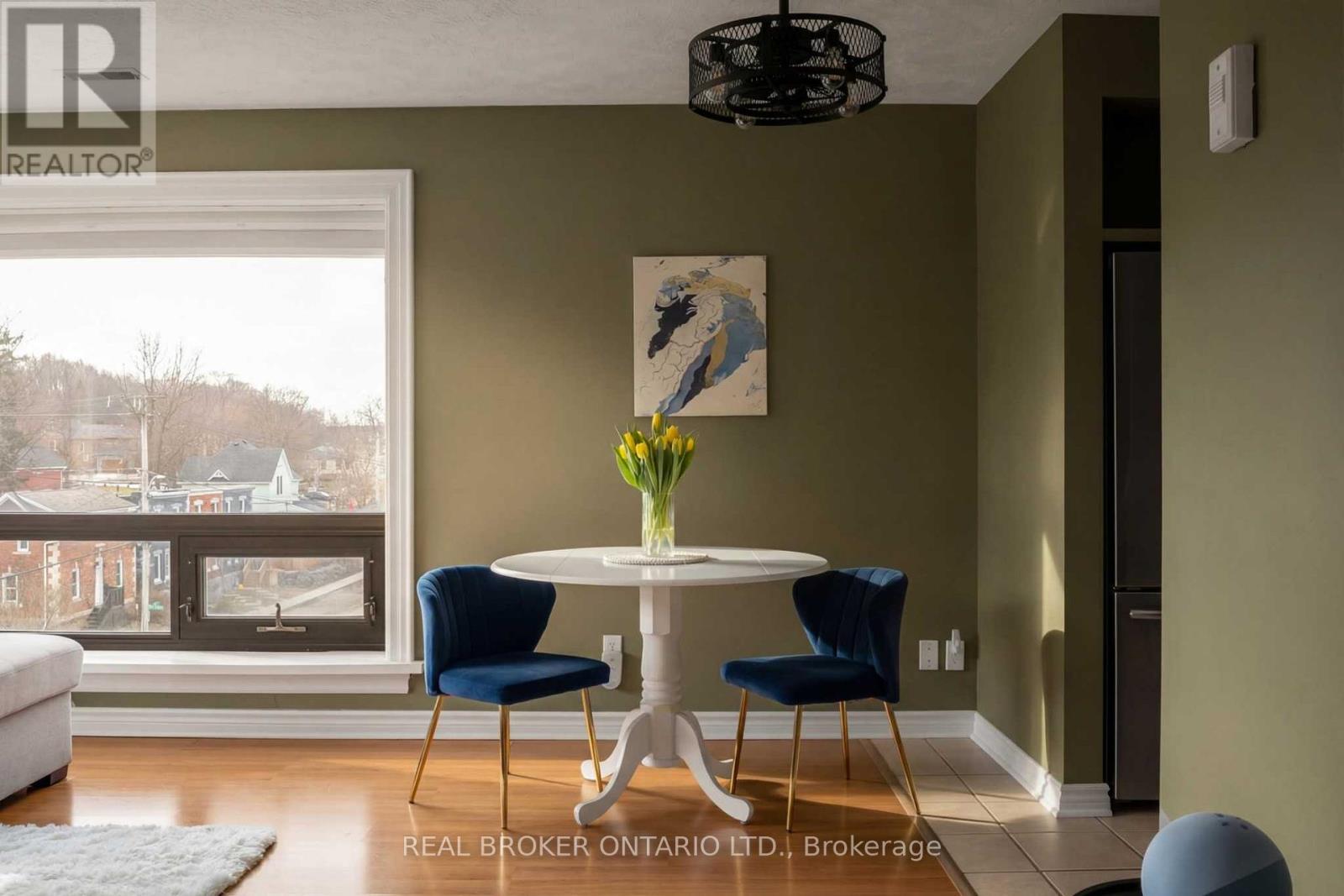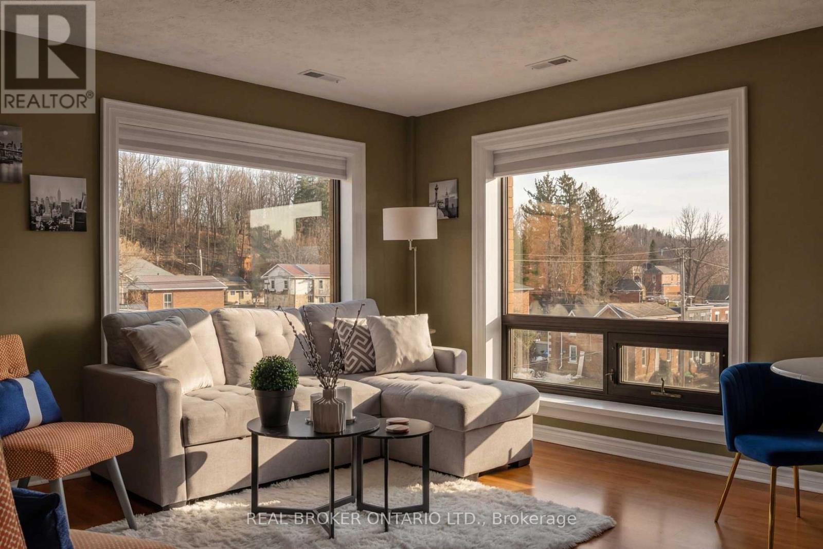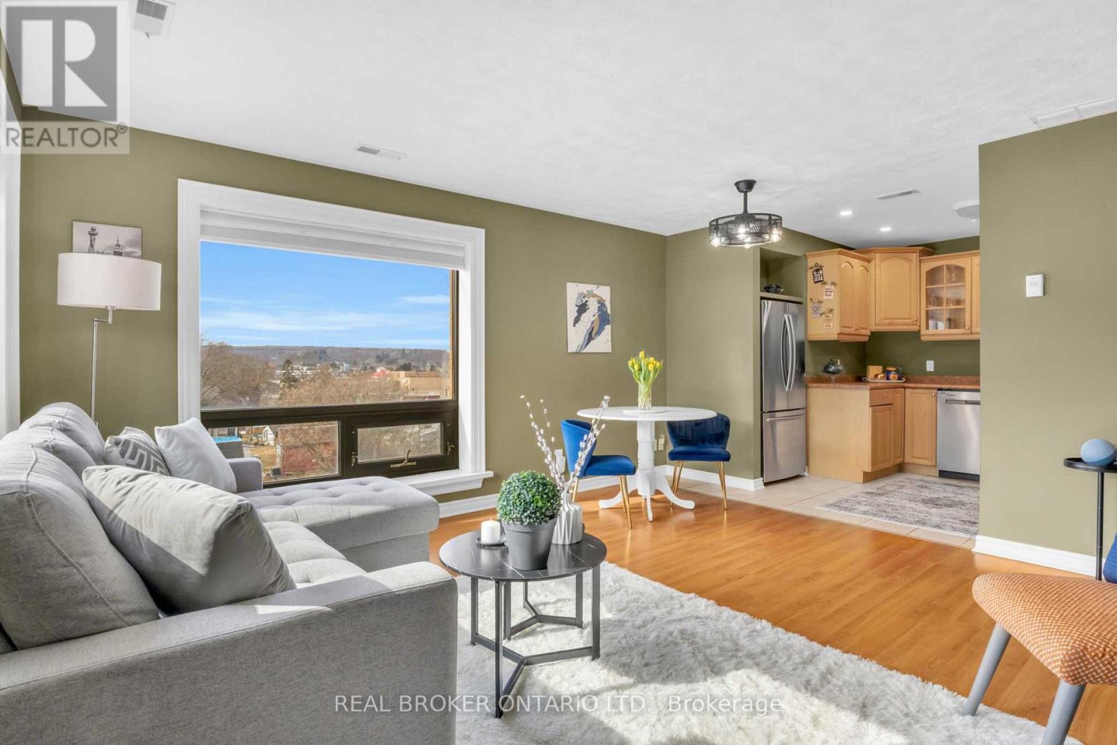 Welcome to 1717 2nd Avenue East, Unit 505 - a bright and spacious 2-bedroom plus den corner suite in one of Owen Sound's most sought-after boutique condominium buildings. Ideally located just steps from the waterfront, scenic walking and biking trails, parks, gardens, playgrounds, Kelso Beach, and local art galleries, this home combines convenience with a vibrant lifestyle. Inside, the open-concept layout is brimming with natural light from expansive corner windows. Elegant wainscoting and low-maintenance flooring create a refined, modern feel throughout, while the kitchen offers ample cabinetry and workspace, perfect for everyday living or entertaining. The primary bedroom provides a peaceful retreat, while the second bedroom and versatile den offer flexible space for family, guests, or a home office. In-suite laundry adds practicality and ease to daily living. With only 15 residential units, this well-managed five-storey building delivers an intimate, exclusive atmosphere. Residents enjoy secure elevator access, ample parking, a large personal storage locker, and convenient garbage facilities on the same floor. A standout feature is the rooftop terrace - an inviting space to relax, entertain, and take in stunning water views and sunsets. Experience effortless, low-maintenance living in a prime location that truly has it all. (id:4555)