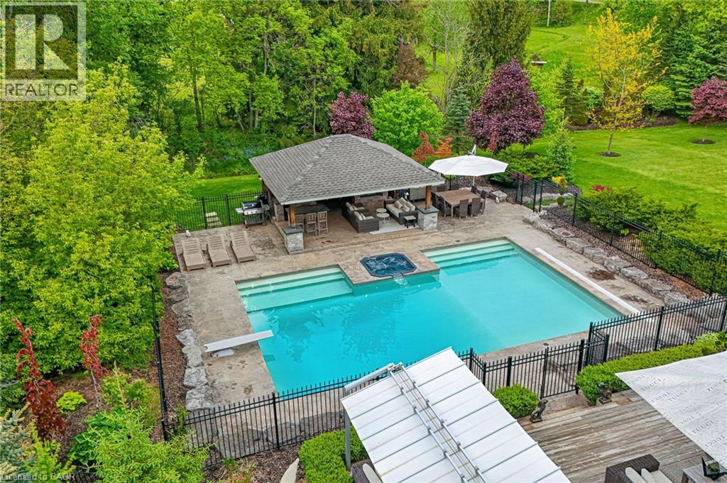 This is your Dynasty! Nestled on one of the most prestigious streets in Petersburg, this grand home sits on a 1.33-acre lot, showcasing craftsmanship and quality. Featuring 4 bedrooms, 5 baths, and triple-car garage. Step through the custom oversized wood front door or auxiliary entrance and experience clean, timeless décor. A two-story living room with coffered ceilings and a floor-to-ceiling fireplace sets the stage. A custom kitchen, with waterfall island, built-in Thermador appliances, and separate servery, alongside main-floor laundry, office, and a luxurious primary suite with walk-in closet and spa-like ensuite, including a two-person glass shower, soaker tub, heated floors, and high-end fixtures. Upstairs hosts 3 spacious bedrooms and 2 renovated bathrooms. The finished basement offers polished concrete floors, a central bar, wine cellar, games room, and updated bath. Professionally landscaped grounds feature trees, shrubs, rock, and lighting. The backyard is a paradise, with a heated 20x40 pool, built-in spa, pool house cabana with washroom, changeroom, dining area, and lounge with gas fireplace. A multi-level deck includes a hot tub, natural gas hookups for a fire table and BBQ. Adjacent greenspace offers potential for an outdoor rink, sports court, or workshop. This architectural masterpiece embodies luxury and convenience at every turn. With high-end finishes, state-of-the-art appliances, and thoughtfully designed spaces, it is the epitome of comfort and elegance; an unrivaled retreat. (id:4555)
