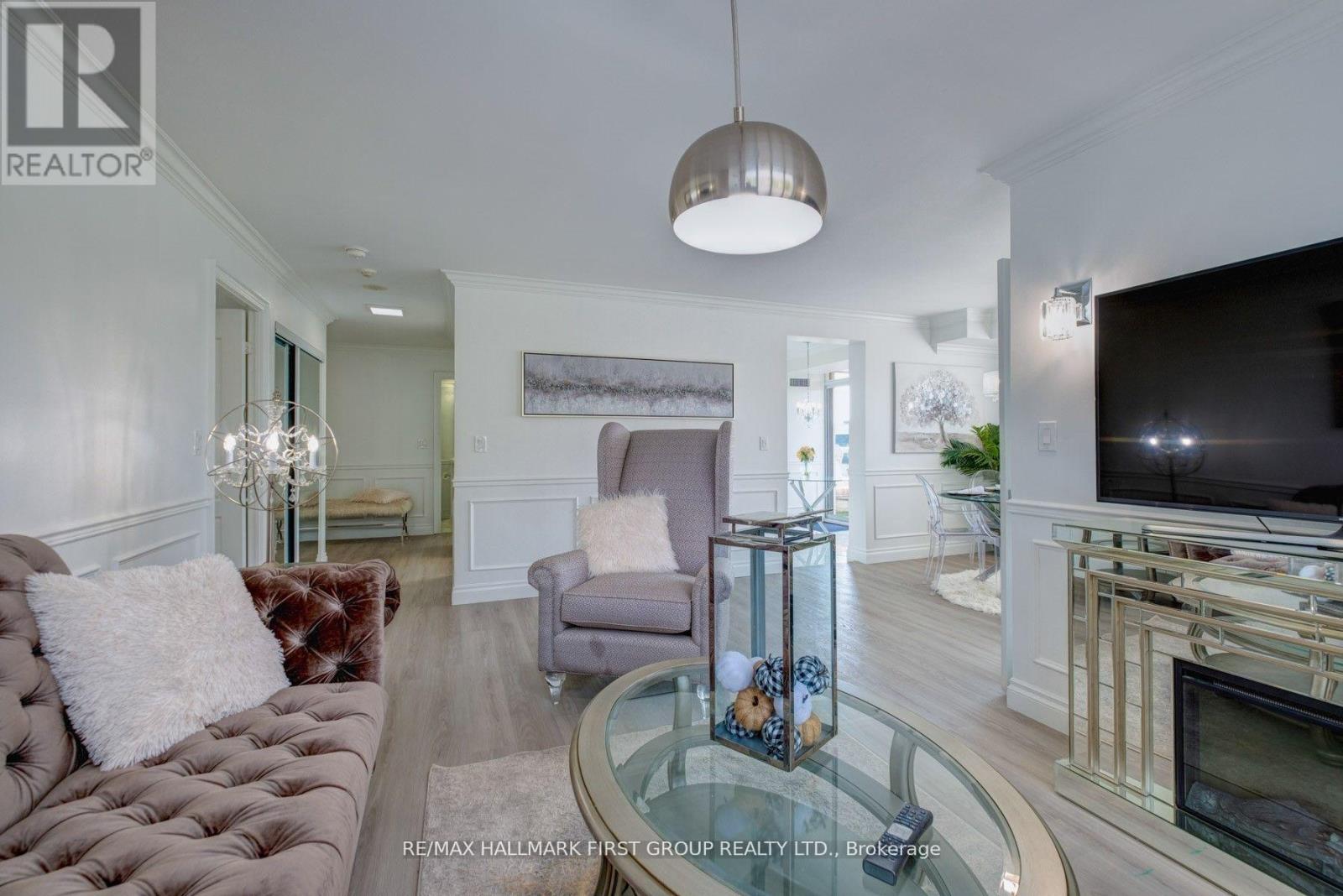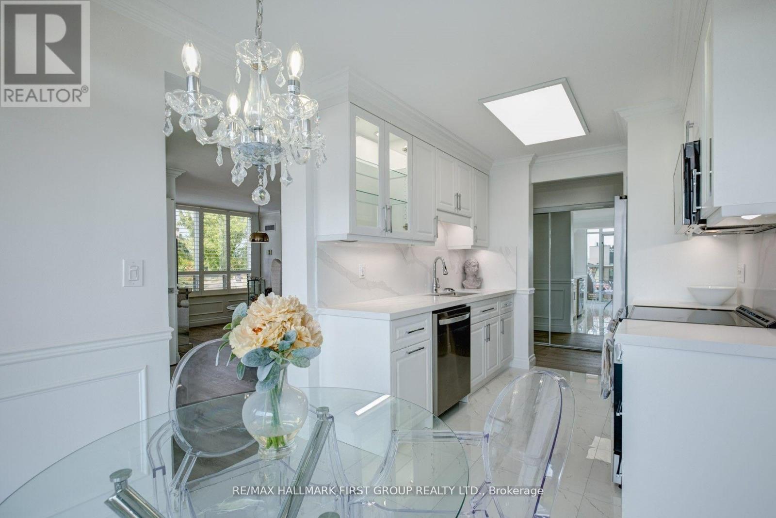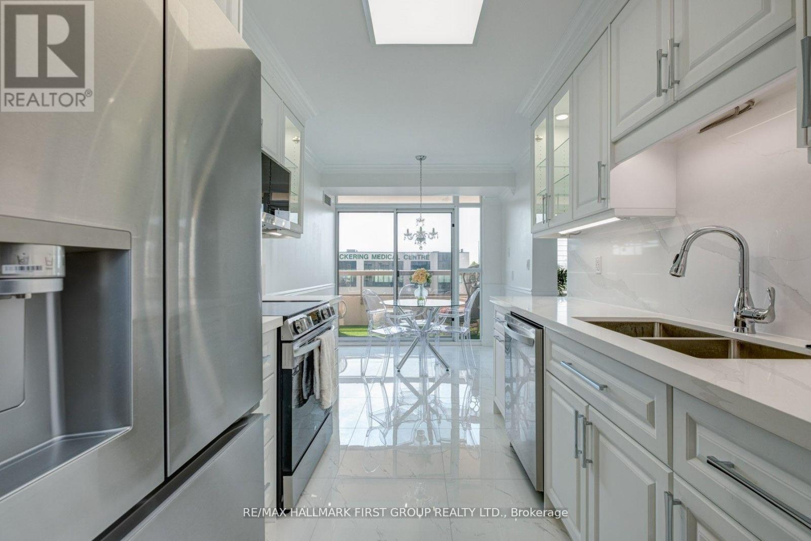 Location, Location, Location! Beautiful Completely Renovated 2 Bedroom Plus Den, 2 Bathrooms, 2nd Floor Condo with Balcony. Located Steps From Pickering Town Center and all Amenities. Includes 1 Parking Spot and 1 Storage Locker. Completely Renovated 1191sq ft. over 100k in Upgrades! New Waterproof Luxury Vinyl Flooring and Porcelain Tiles. Brand New Bright White Kitchen with Quartz Counter and Backsplash, under cabinet lighting, pullout garbage and recycling, moen facets and glass rinser. Brand new stainless steel appliances. Smooth ceilings with crown molding and wainscotting throughout and freshly painted. All matching 4000k lighting with multiple crystal chandeliers with dimmers and multiple USB Outlets. Spa like bathrooms with porcelain tiles, shower niches, potlights, glass shower door, quartz counters on custom vanities. Large primary bedroom can easily fit King size bed set. Spacious 2nd Bedroom and corner den with views, perfect for home office. Large balcony, Must See! (id:4555)