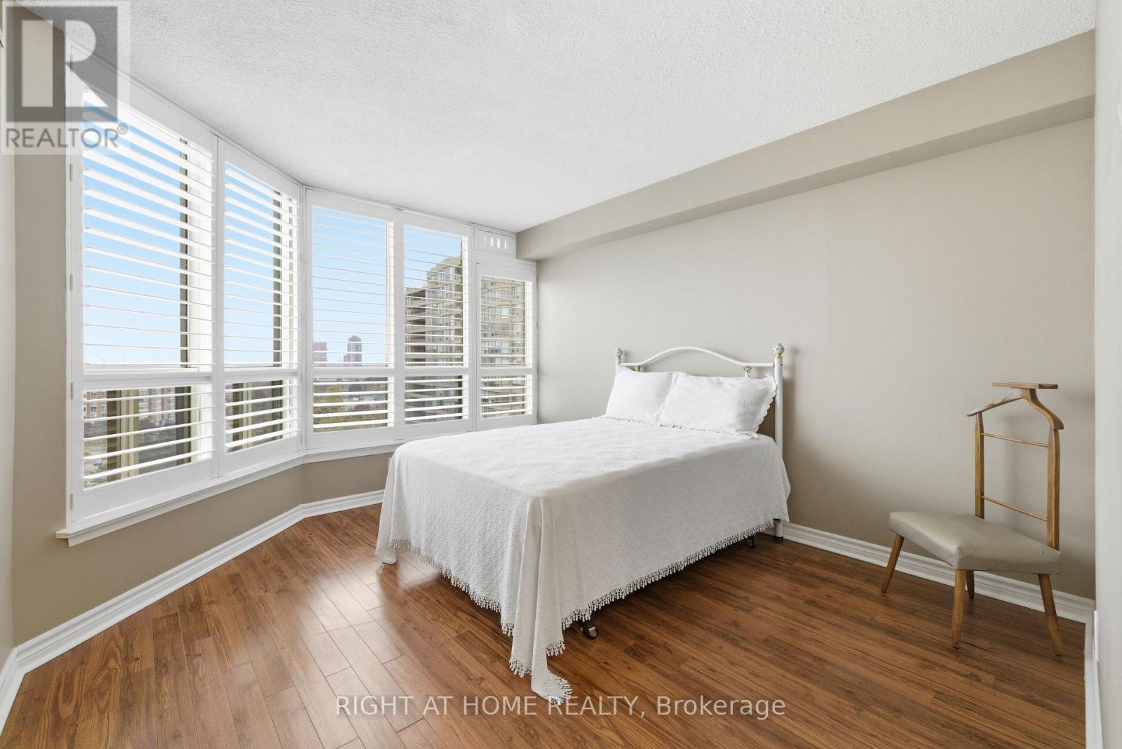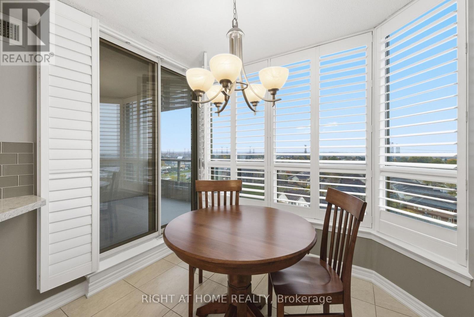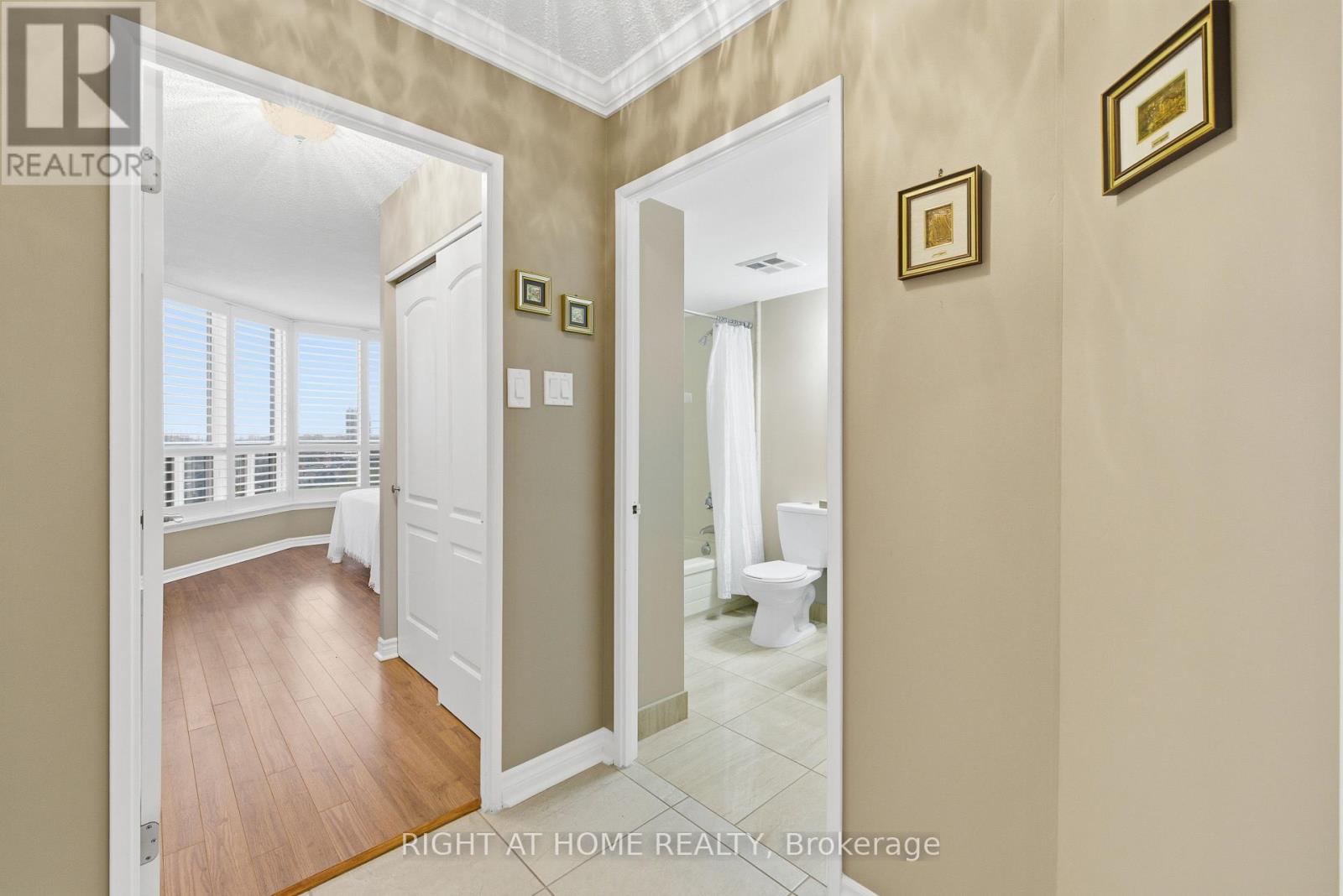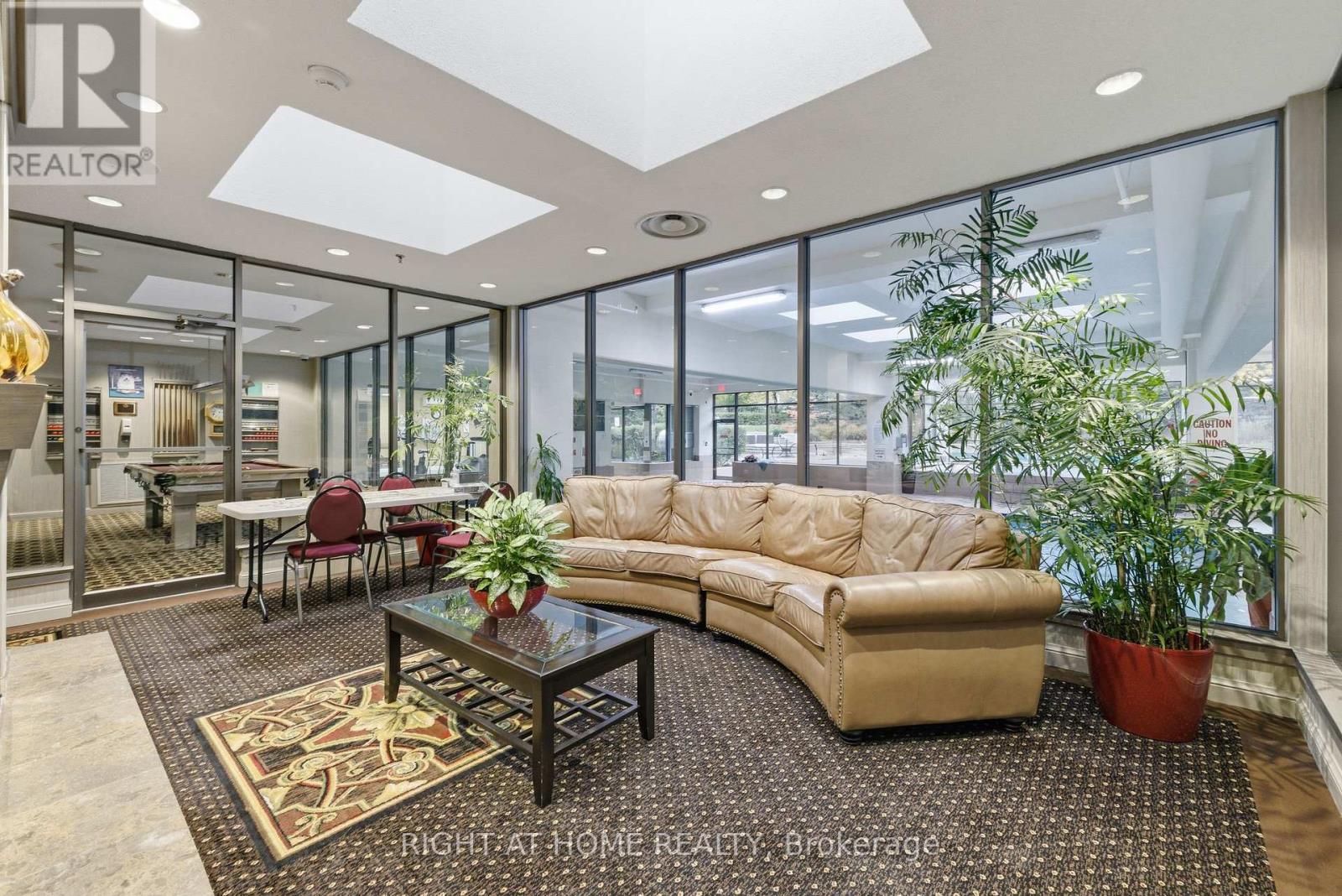 Step into the sought-after Cartier Model, an immaculate corner residence in Tridel's Discovery Place, showcasing nearly 1,500 sq. ft. of bright and well-designed living space. Sunlight pours in through the southeast-facing windows, highlighting the airy layout and offering seamless access to a private balcony-perfect for morning coffee or relaxing evenings. The suite features a spacious formal dining area within the living room, beautifully enhanced by crown moulding throughout, adding an elegant, refined touch to the main living space. The modern kitchen is ideal for everyday living, featuring an eat-in area and generous cabinetry for effortless organization. The entire suite is enhanced by California shutters, lending a bright, clean, uniform, and welcoming look. Both bathrooms are impressively sized and styled with contemporary finishes. For added convenience, the home includes oversized in-suite storage, an additional locker, and underground parking.Residents benefit from the exceptional lifestyle offered by this secure, resort-inspired community, complete with indoor and outdoor pools, hot tub, fully equipped fitness centre, tennis and squash courts, party rooms, guest suites, 24-hour security, and plenty of visitor parking. With all utilities included in the maintenance fees-water, heat, hydro, cable TV, and high-speed internet-daily living is simple and stress-free.Situated steps from Pickering Town Centre, the library, civic centre, parks, recreation facilities, and the GO Station, and minutes from Highway 401, this suite delivers the perfect blend of location, comfort, and convenience (id:4555)