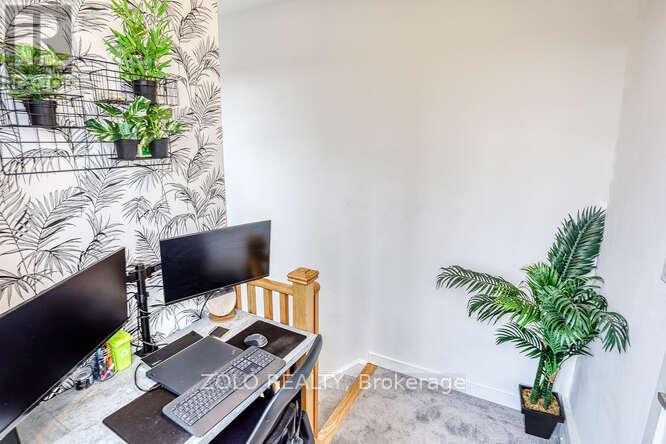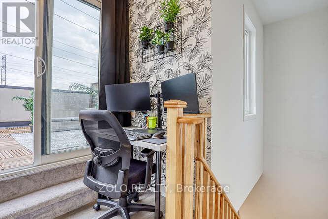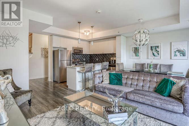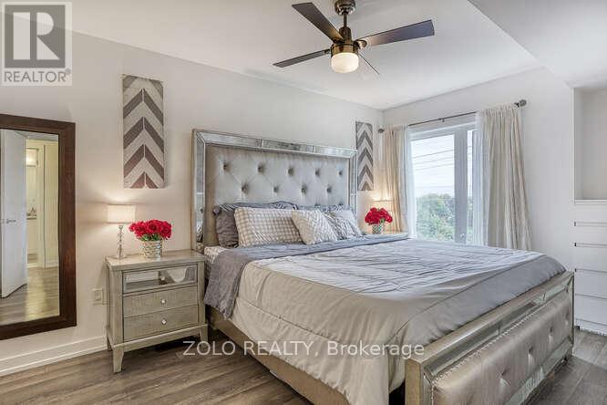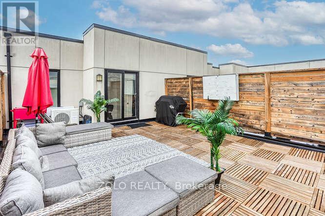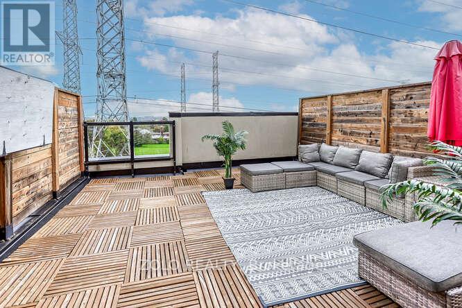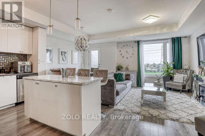 Welcome to UNIT #218 a lovely stacked townhouse by Marshall Homes in Pickering's sought-after Center Point Towns community. This stylish home offers a bright open-concept layout featuring a modern bright kitchen with a center island, stainless steel appliances, and a double sink, flowing into a cozy living area with laminate flooring and a balcony with sunny east exposure. The upper level offers a spacious primary bedroom boasts his-and-hers closets and a 4-piece ensuite, while the second bedroom includes a large window & double-door closet. Enjoy the convenience of a second full bath and in-unit laundry. Step up to the large sun filled private rooftop terrace with gas BBQ hookup, privacy fencing, hose bib, and plenty of room to relax or entertain, you won't be missing a yard with a this space and low maintenance living. Close to GO Transit, Hwy 401, shopping, restaurants, and more. A perfect turnkey home in a vibrant location. (id:4555)