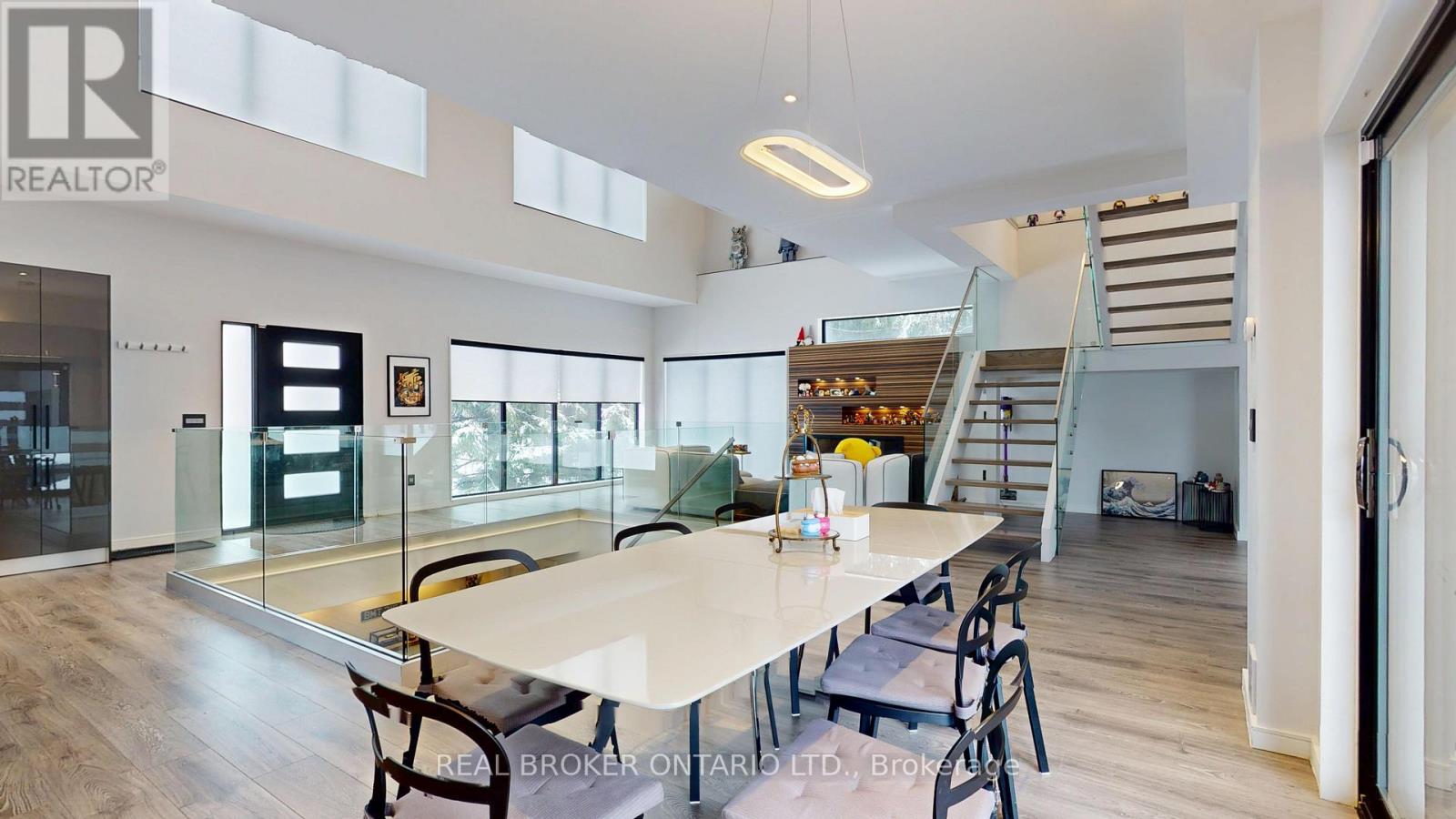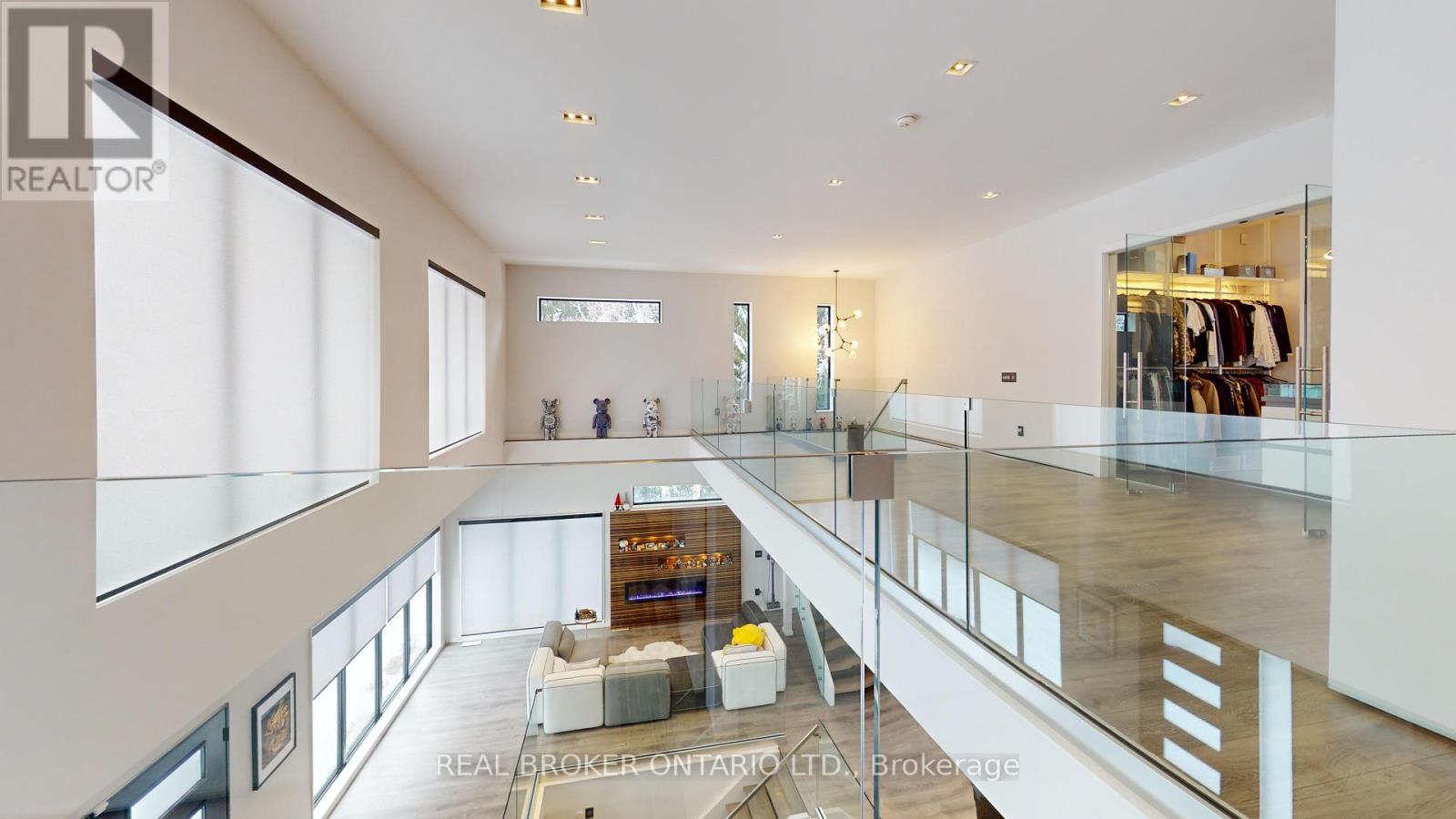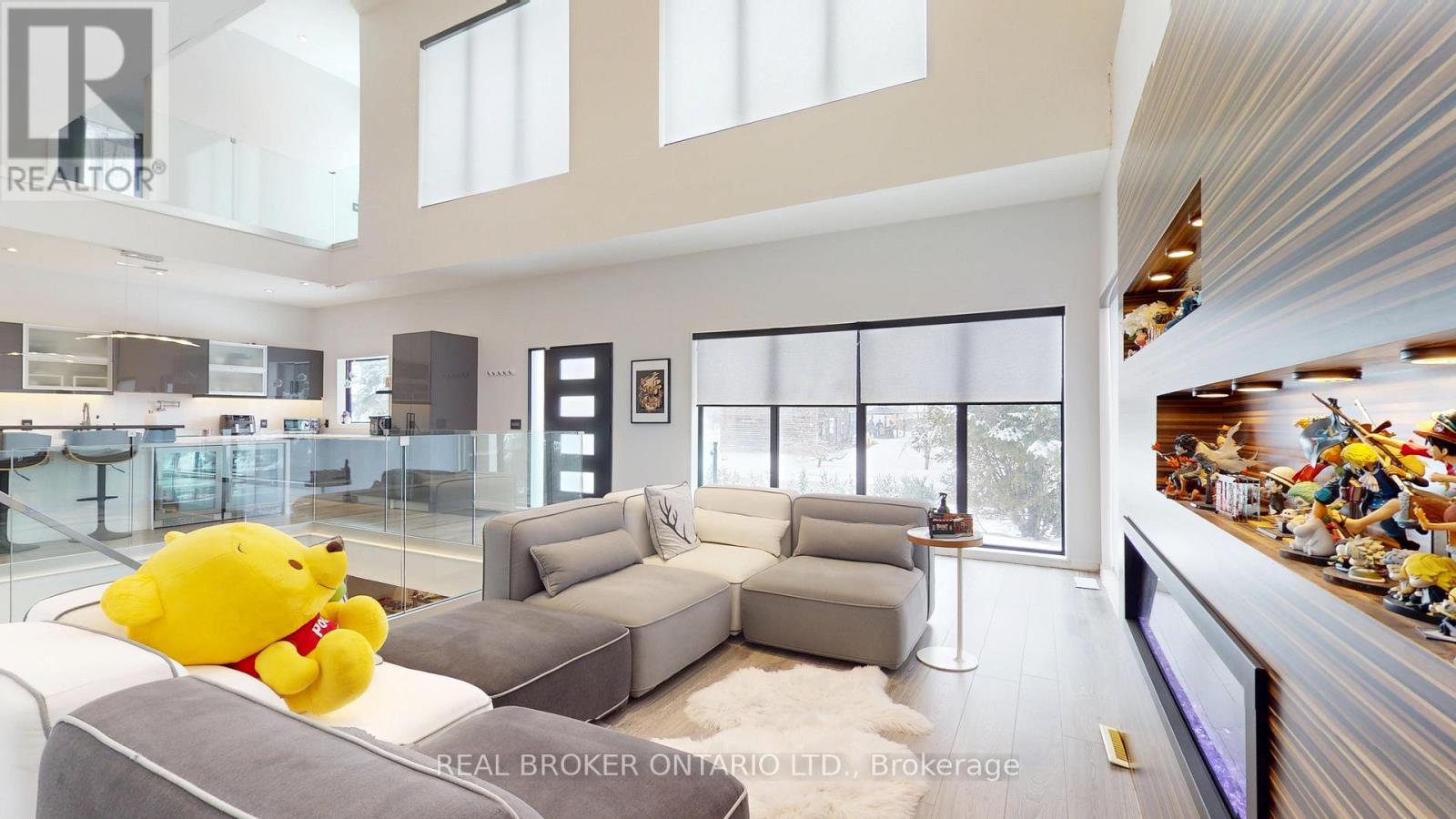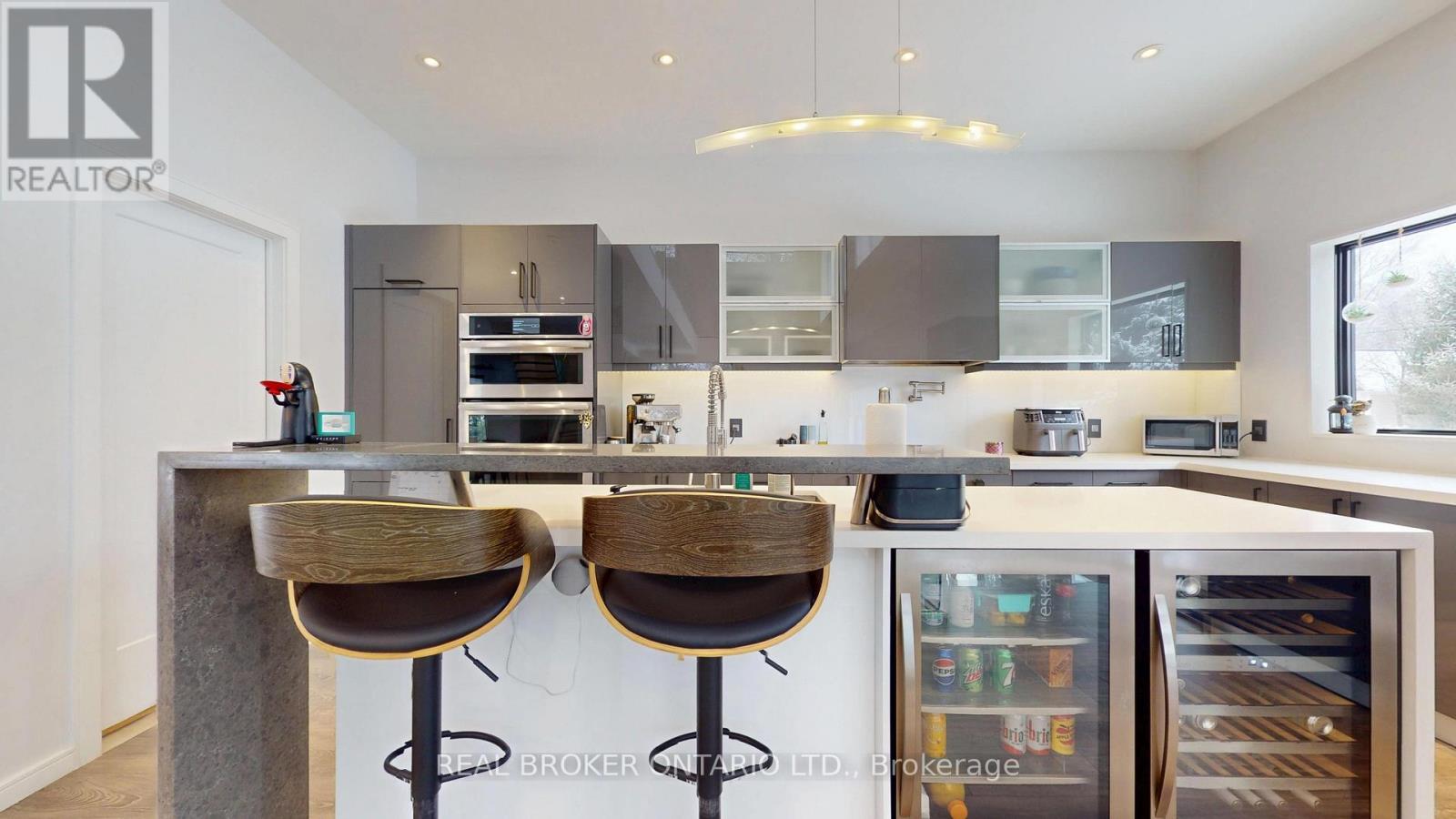 Bold architecture meets refined functionality in this striking custom-built contemporary residence. Designed across three finished levels, this home seamlessly blends luxury, productivity, and entertainment. The main level makes an unforgettable first impression with soaring open-to above ceilings, a floating wood staircase with glass railings, and expansive walls of glass that flood the space with natural light. The chef inspired kitchen is a true showpiece, featuring a dramatic dual-waterfall island, built-in wall ovens, gas cooktop with pot filler, wine storage, beverage fridge, and sleek high-gloss cabinetry - all flowing effortlessly into the dining and living areas anchored by a designer feature wall. A dedicated professional office wing offers glass-partitioned workspace and conference flexibility - ideal for entrepreneurs, creatives, consultants and more. Upstairs, a dramatic gallery overlooks the main level and leads to a boutique-style primary retreat complete with a glass-enclosed walk-in closet and spa-inspired ensuite featuring a freestanding soaker tub, frameless glass shower, floating vanity, and modern tile finishes.Spacious secondary bedrooms and beautifully appointed bathrooms complete the upper level. The fully finished lower level elevates the home's entertainment factor with a custom built-in bar, open recreation space, designer lighting, and architectural sight-lines connecting all levels. A full bathroom adds flexibility for guests. This is more than a home - it is a modern lifestyle property built for those who value design, functionality, and elevated living. The property is being sold in as-is, where-is condition, with no representations or warranties of any kind by the seller. (id:4555)